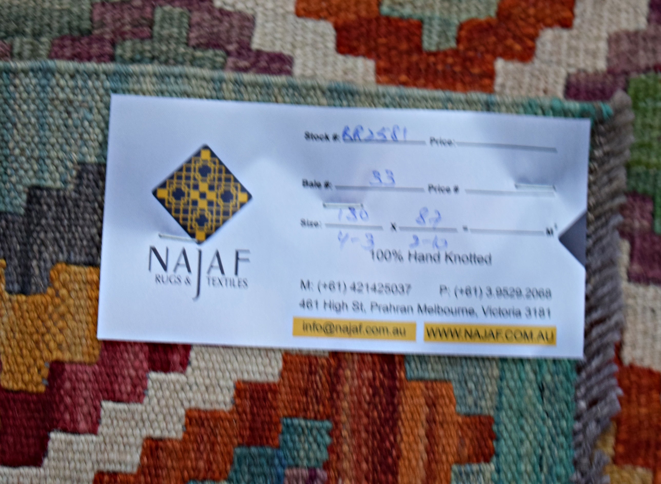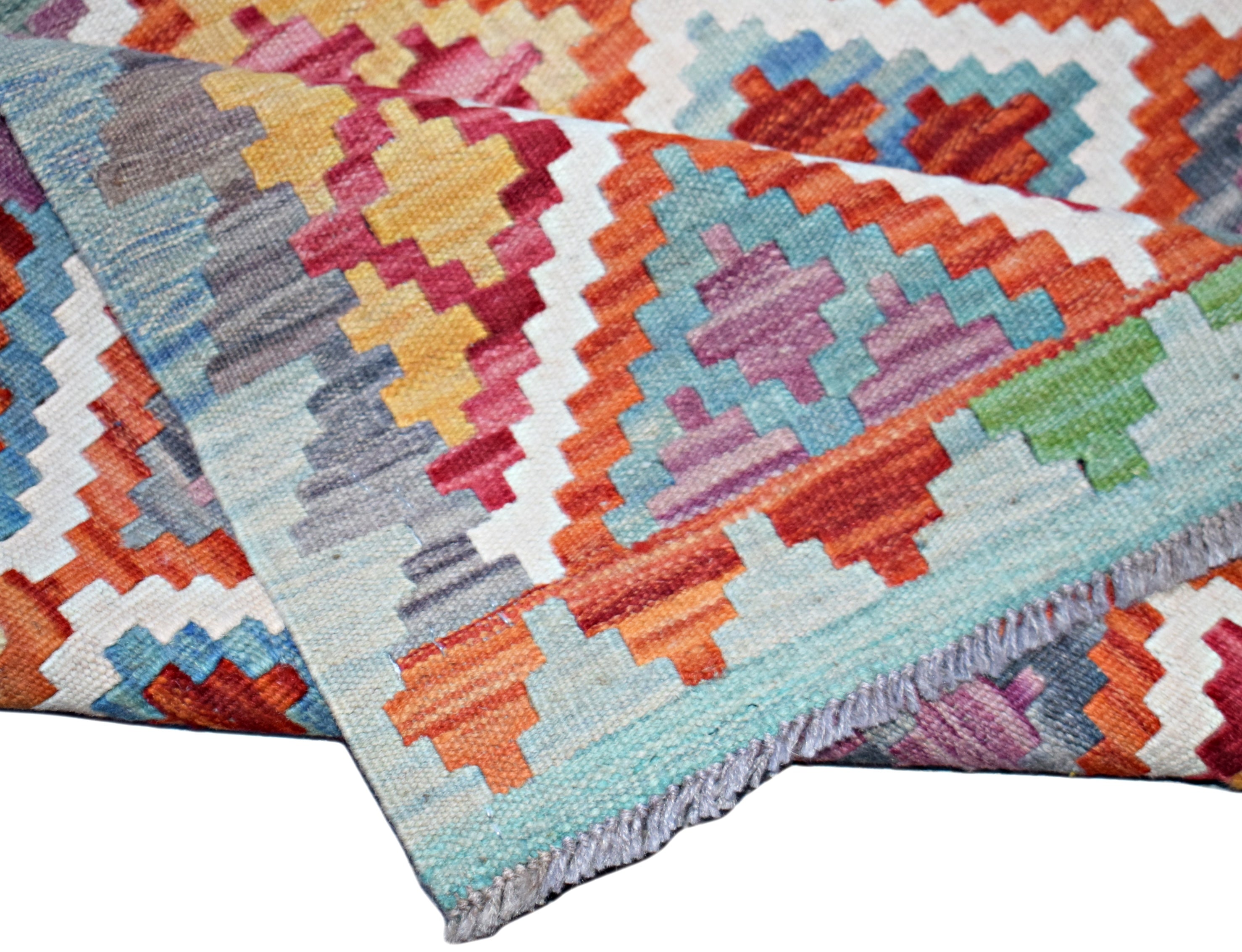 Style: Kilims are woven with a different technique from rugs and are without a pile which allows you to use both sides, this versatility is functional and practical making you get the most out of your handmade item. Kilims are known for it's geometrical patterns, rich colours and flatware texture. This kilim has been handwoven in Maimana, Northern Afghanistan from 100% wool. Handmade to last, this kilim won't disappoint you!