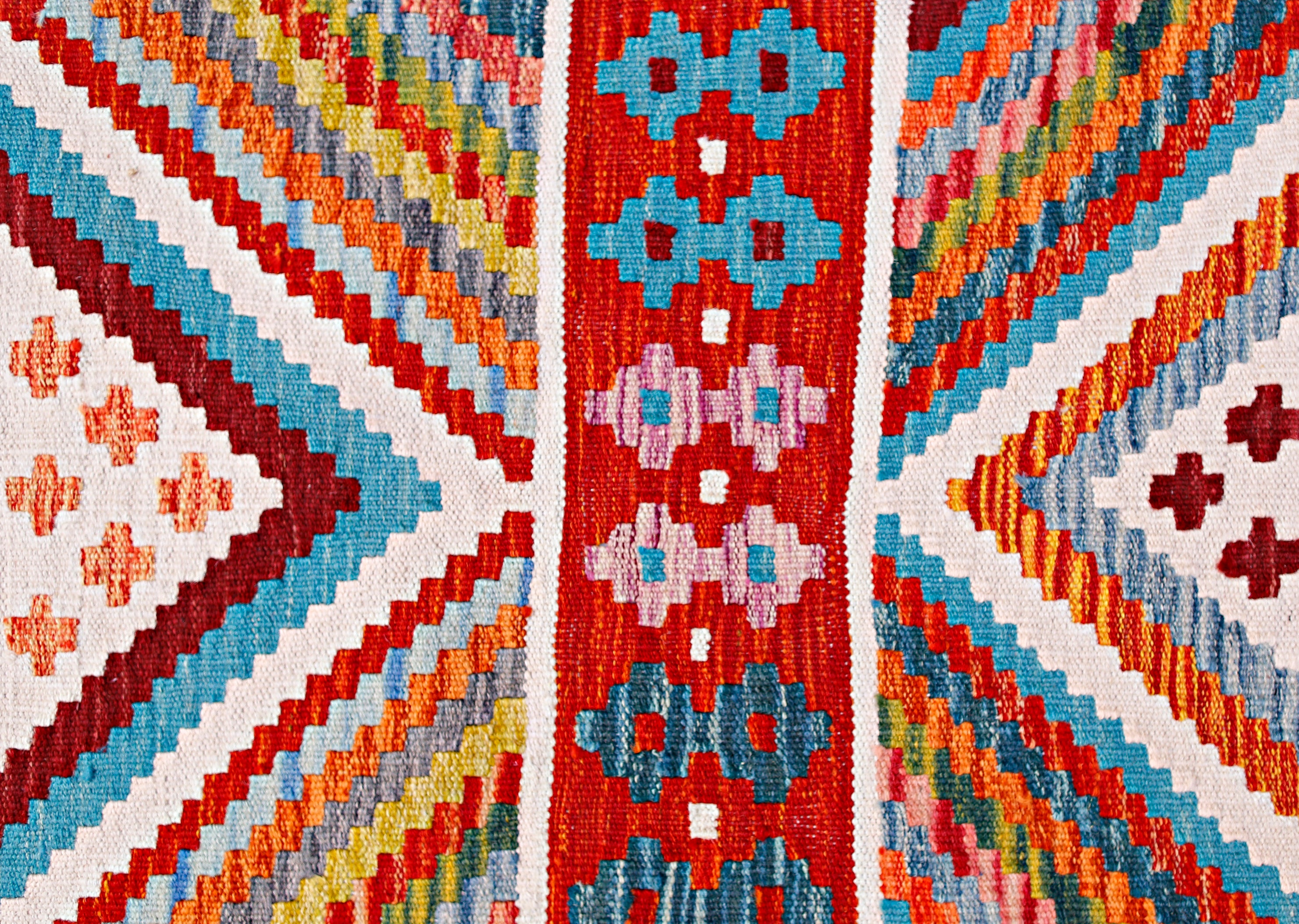 Style: Kilims are woven with a different technique from rugs and are without a pile which allows you to use both sides, this versatility is functional and practical making you get the most out of your handmade item. Kilims are known for it's geometrical patterns, rich colours and flatware texture. This kilim has been handwoven in Maimana, Northern Afghanistan from 100% wool. Handmade to last, this kilim won't disappoint you!