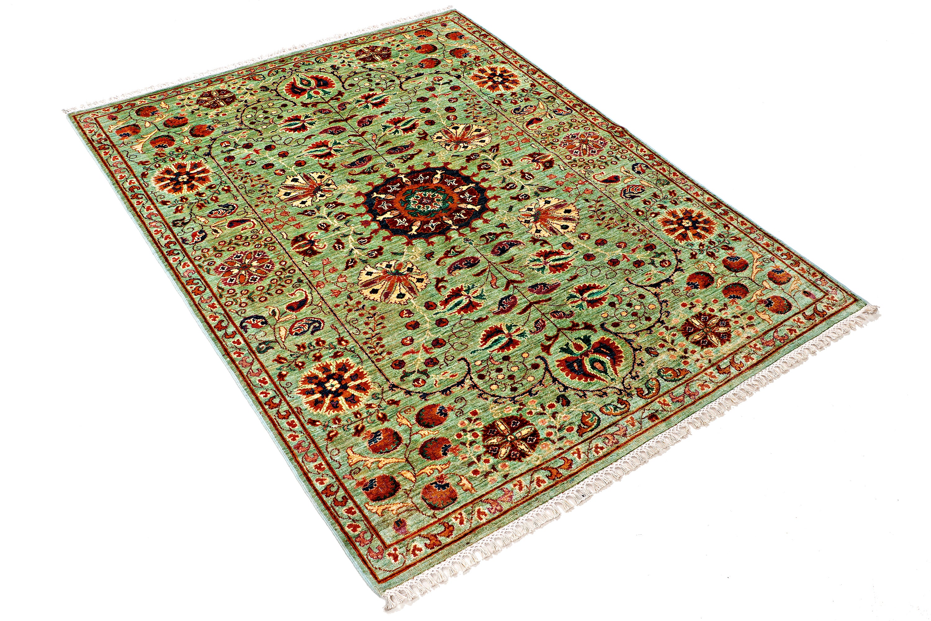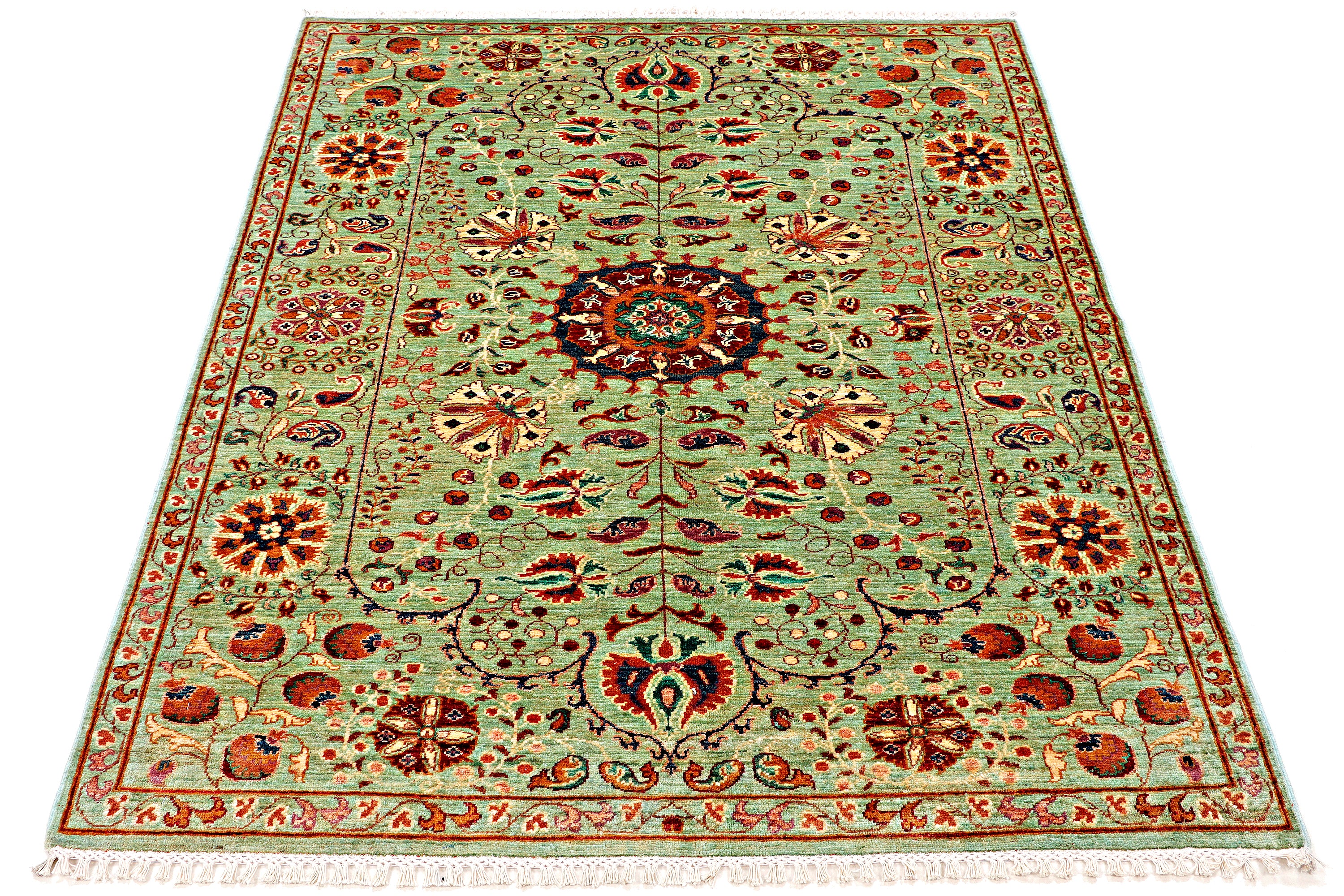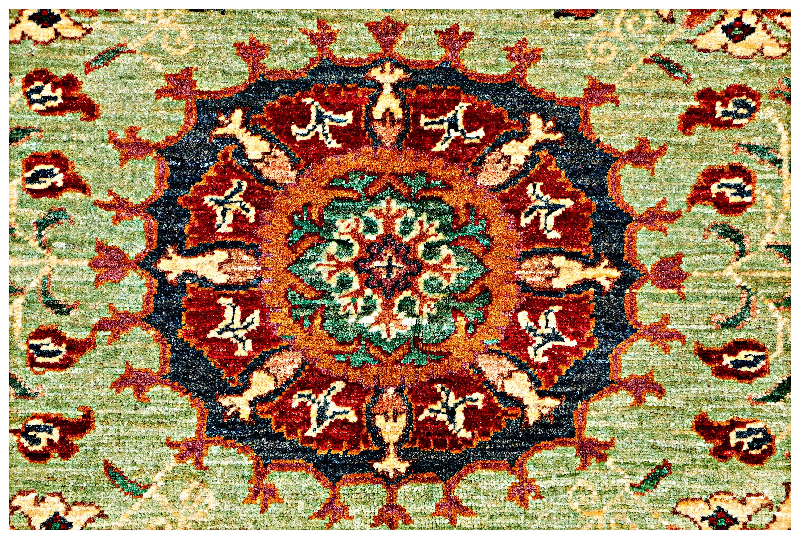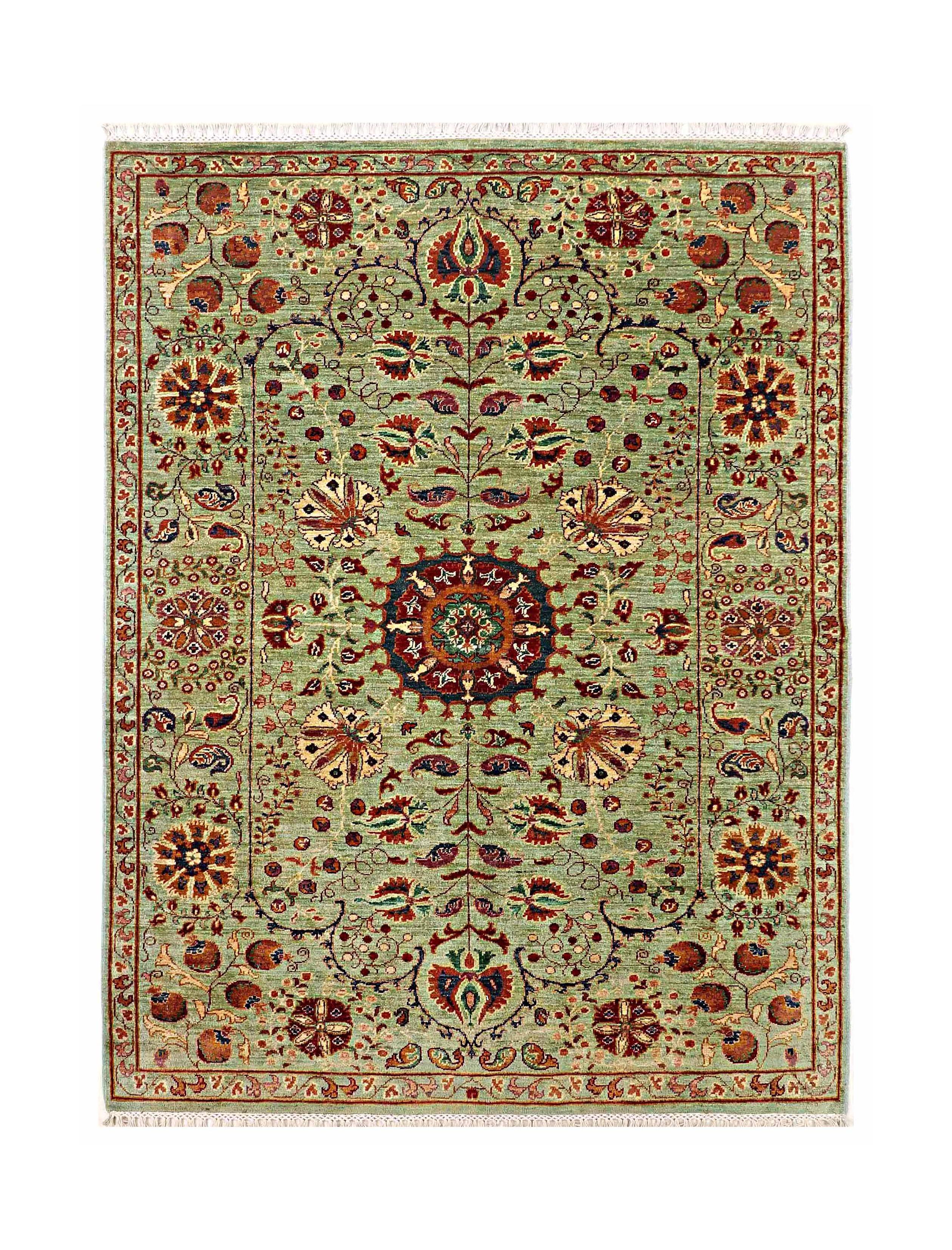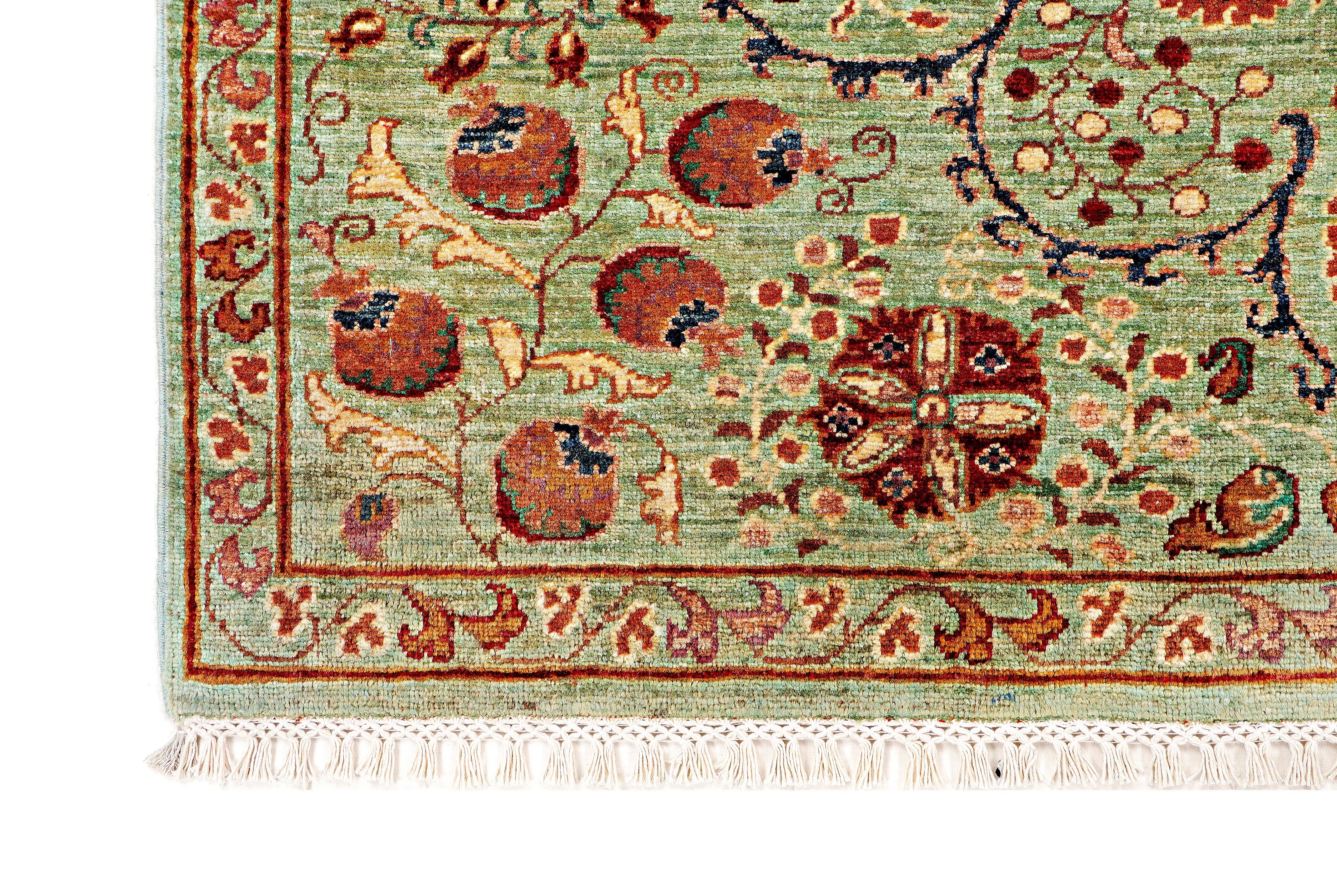 This rug has been woven with a tightly packed knot structure, giving it a fine, durable finish and allowing for greater detail in the design. The wool is hand-spun using traditional methods and selected for its quality, softness, and natural strength. It holds onto its lanolin, which gives the rug a silky sheen and that smooth, velvety feel underfoot.