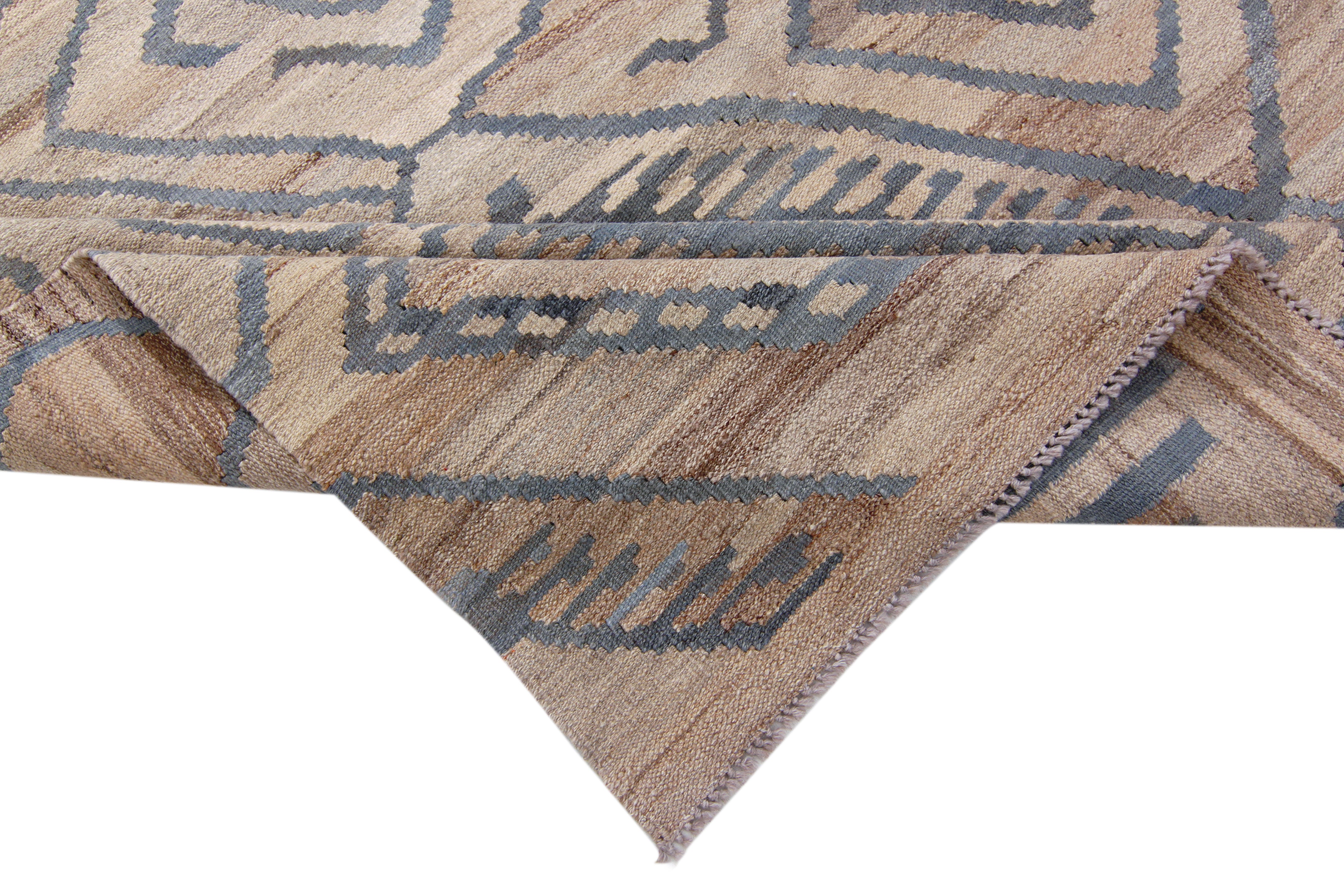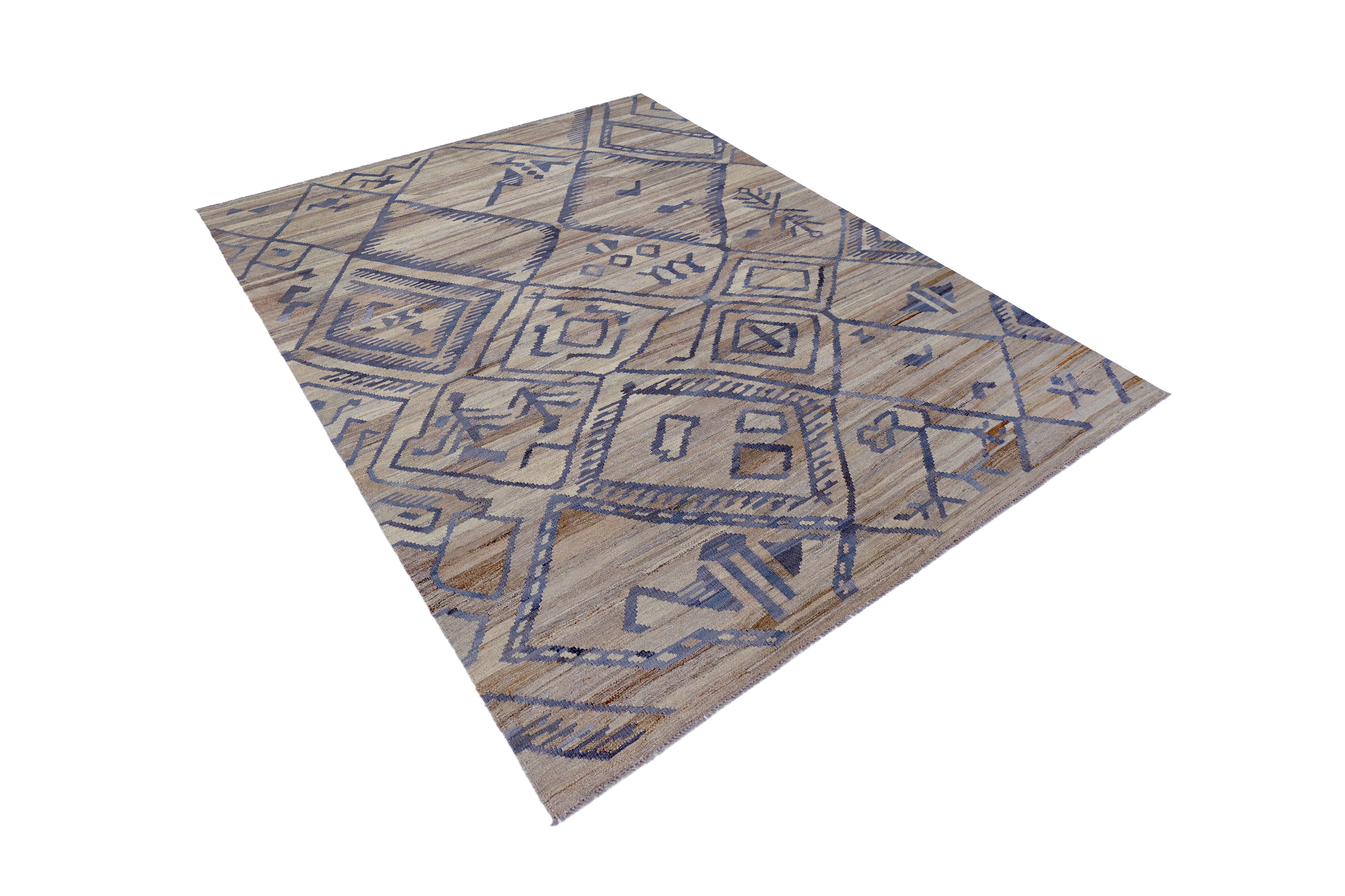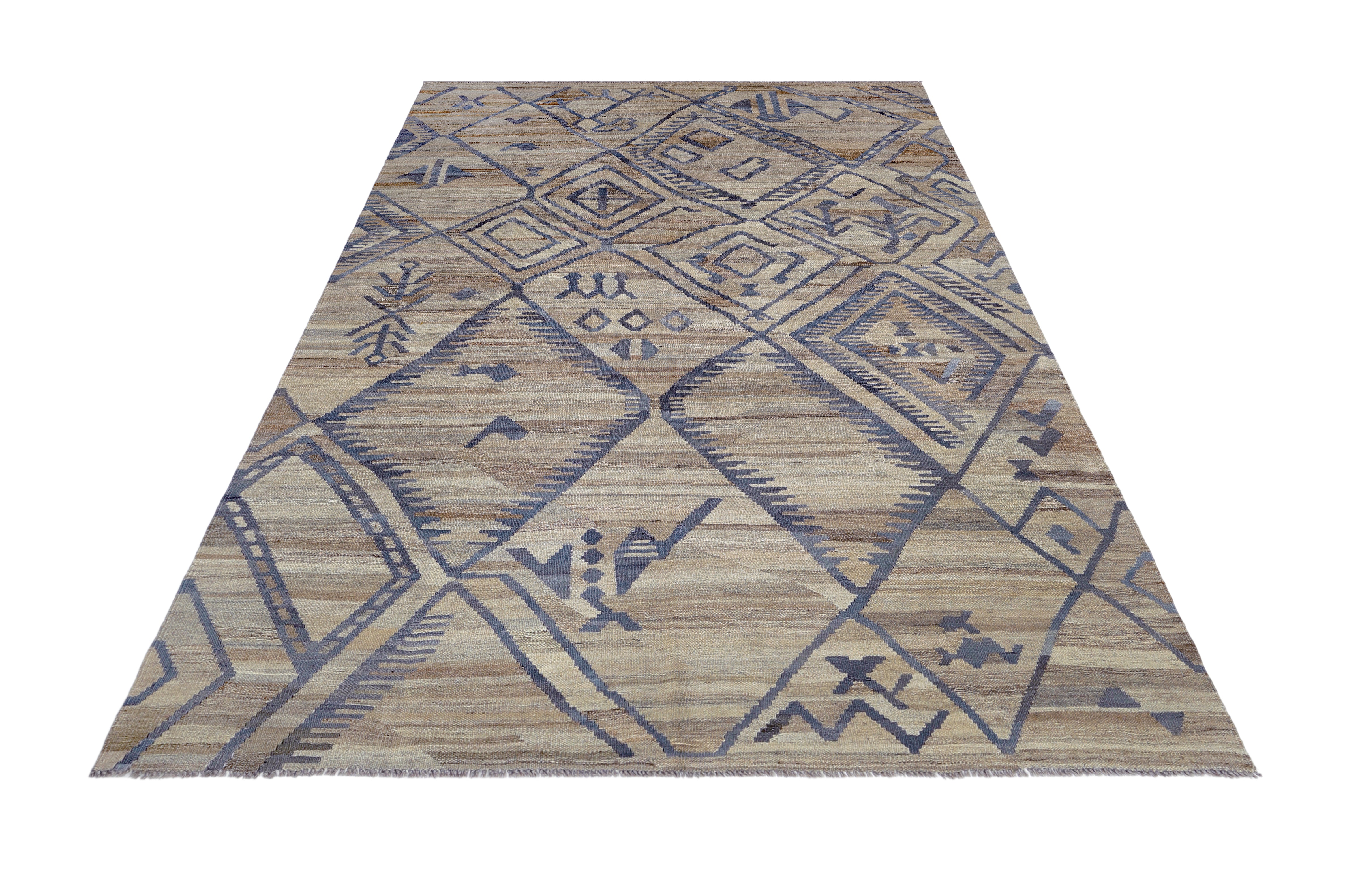 This handmade wool kilim comes from Maimana, a provincial capital in northern Afghanistan known for producing some of the country's most distinctive flatweave rugs. The weaving tradition in this region dates back centuries, with each kilim woven on horizontal ground looms using local wool and age-old techniques passed down through generations.
