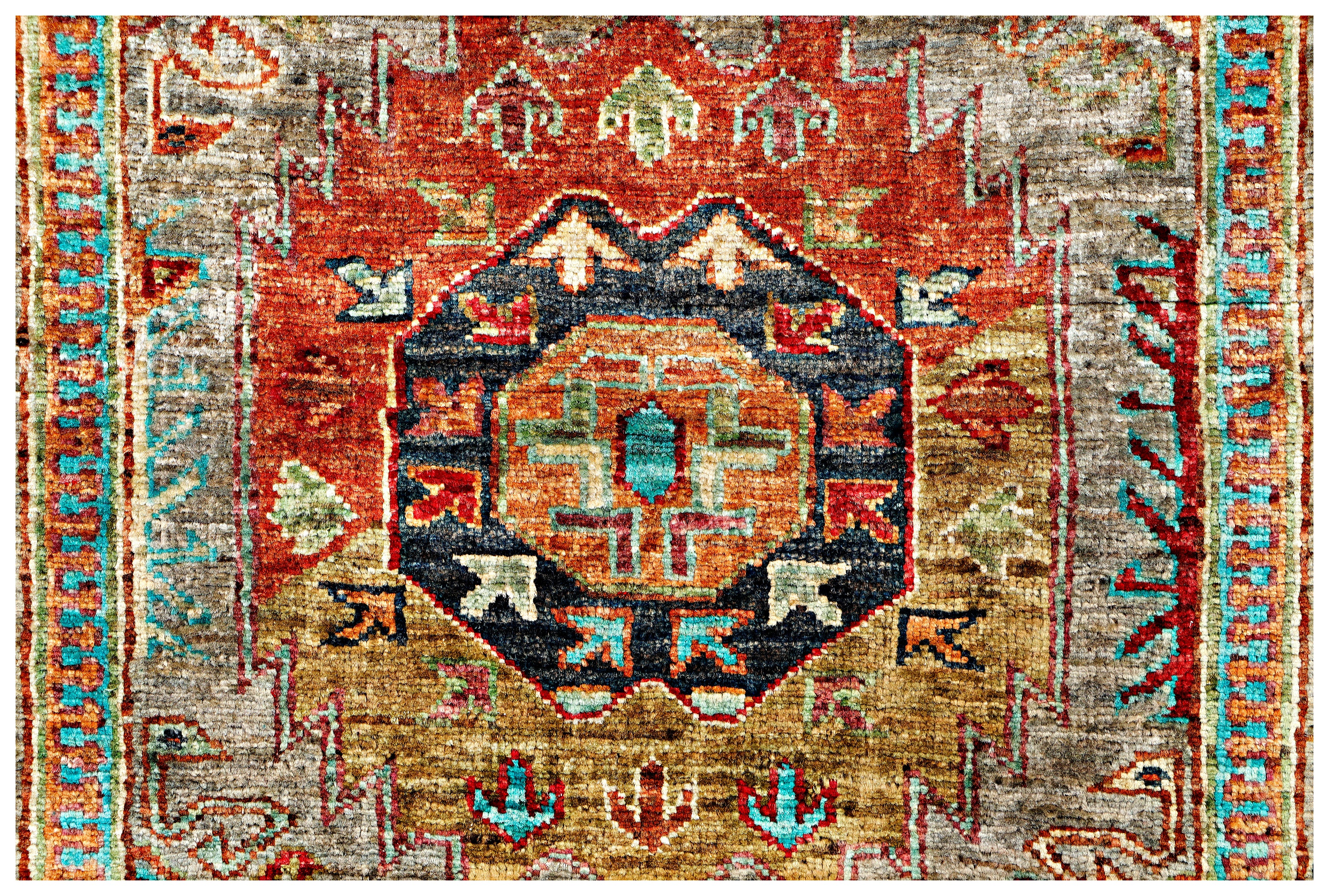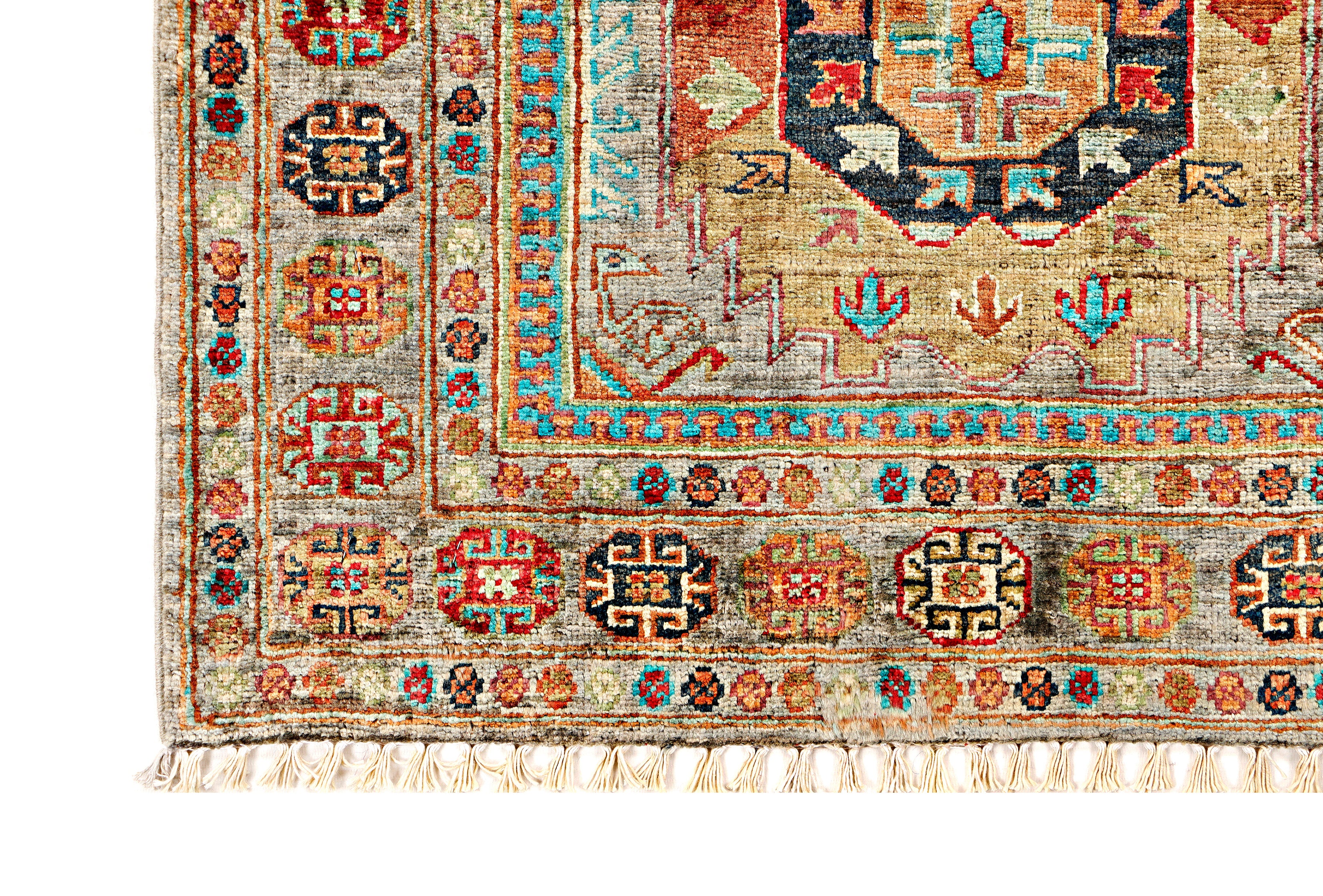 This rug has been woven with a tightly packed knot structure, giving it a fine, durable finish and allowing for greater detail in the design. The wool is hand-spun using traditional methods and selected for its quality, softness, and natural strength. It holds onto its lanolin, which gives the rug a silky sheen and that smooth, velvety feel underfoot.