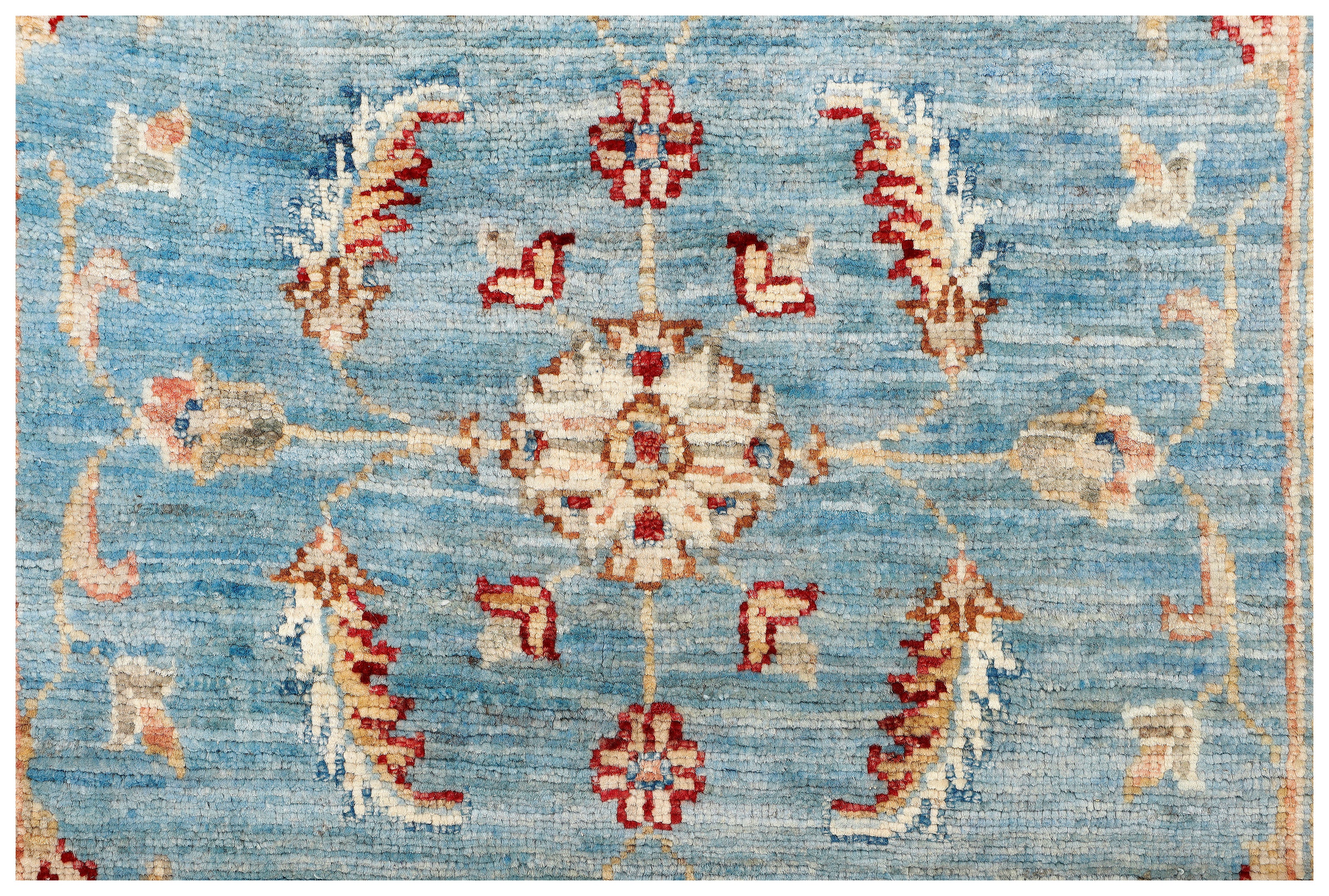 This rug has been woven with a tightly packed knot structure, giving it a fine, durable finish and allowing for greater detail in the design. The wool is hand-spun using traditional methods and selected for its quality, softness, and natural strength. It holds onto its lanolin, which gives the rug a silky sheen and that smooth, velvety feel underfoot.