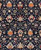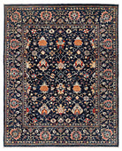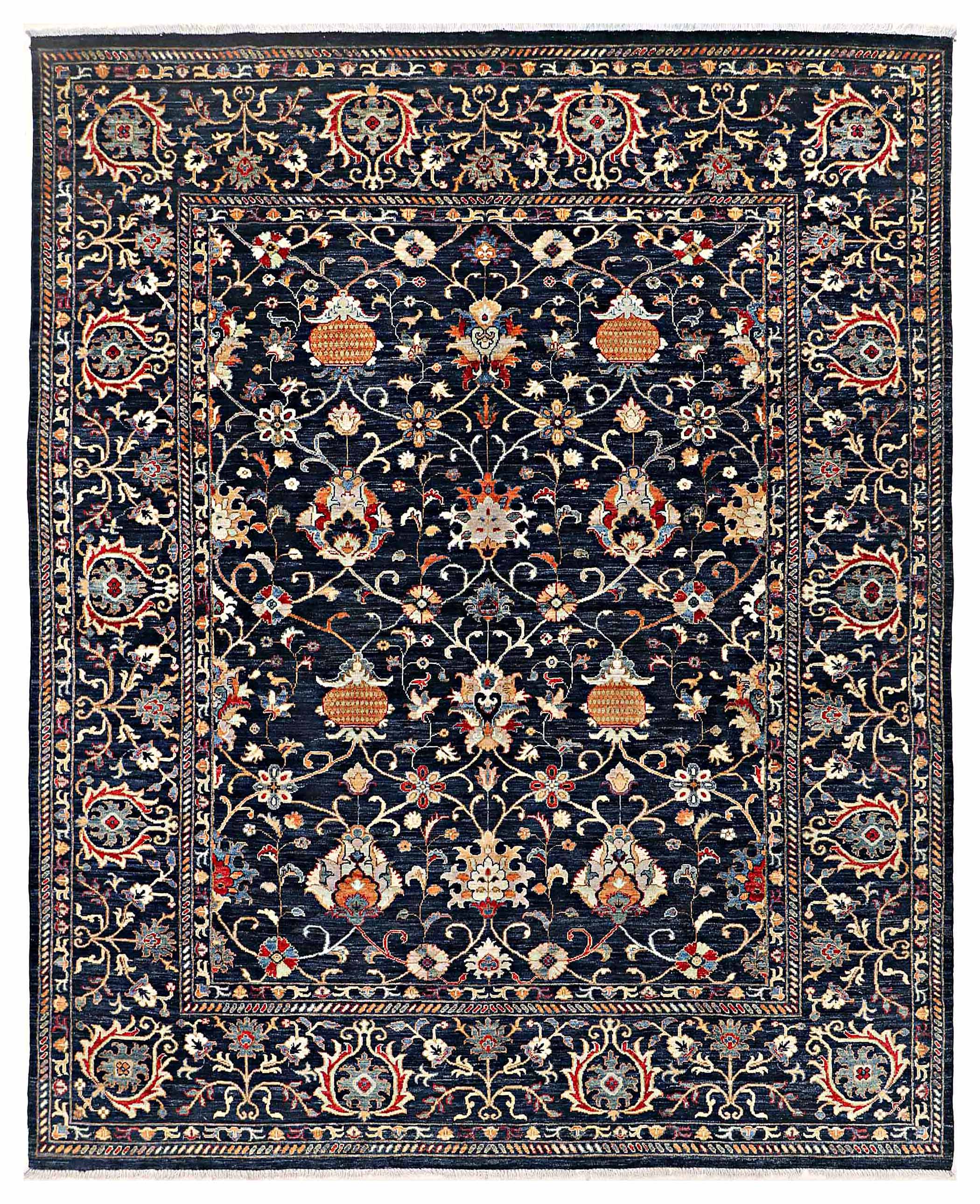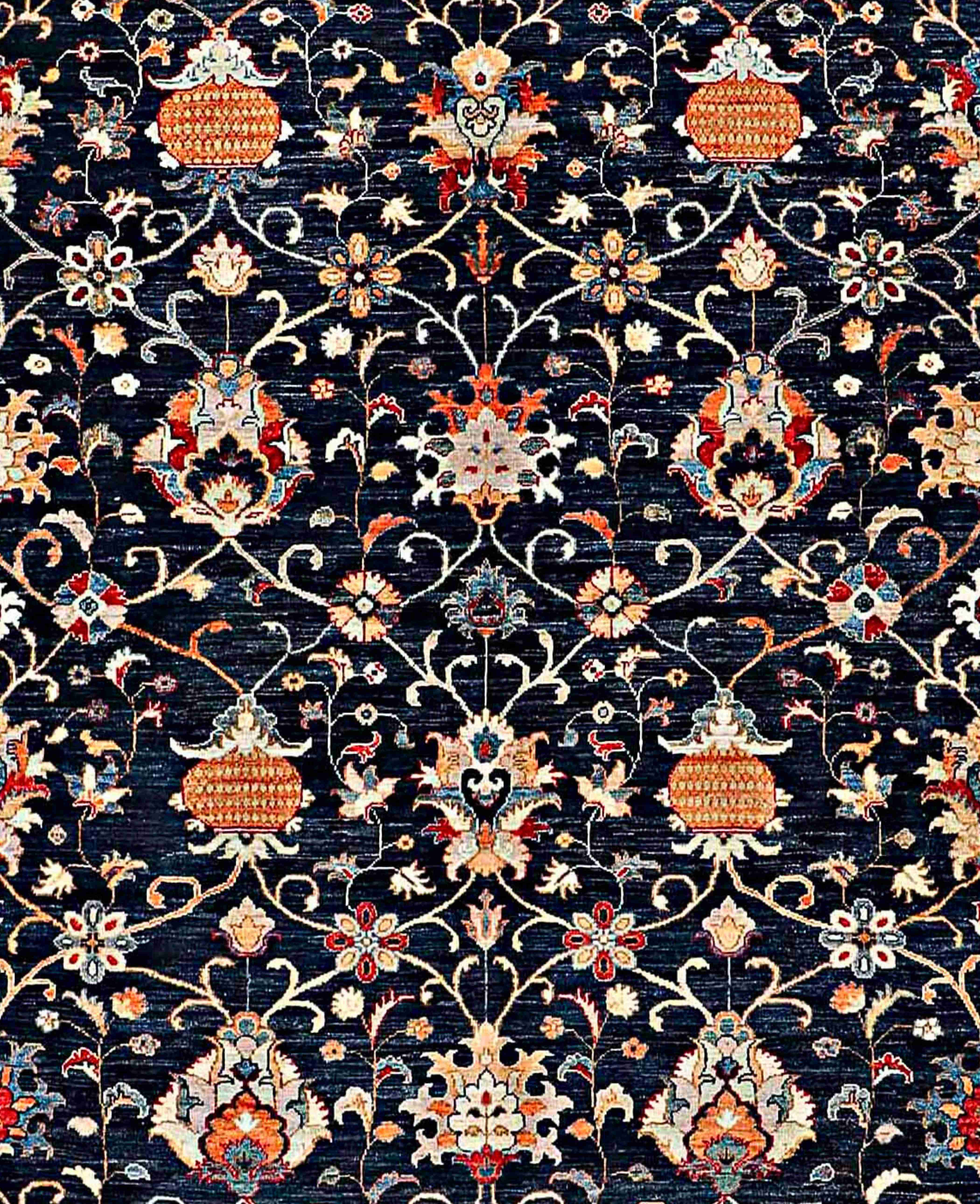 This rug has been woven with a tightly packed knot structure, giving it a fine, durable finish and allowing for greater detail in the design. The wool is hand-spun using traditional methods and selected for its quality, softness, and natural strength. It holds onto its lanolin, which gives the rug a silky sheen and that smooth, velvety feel underfoot.