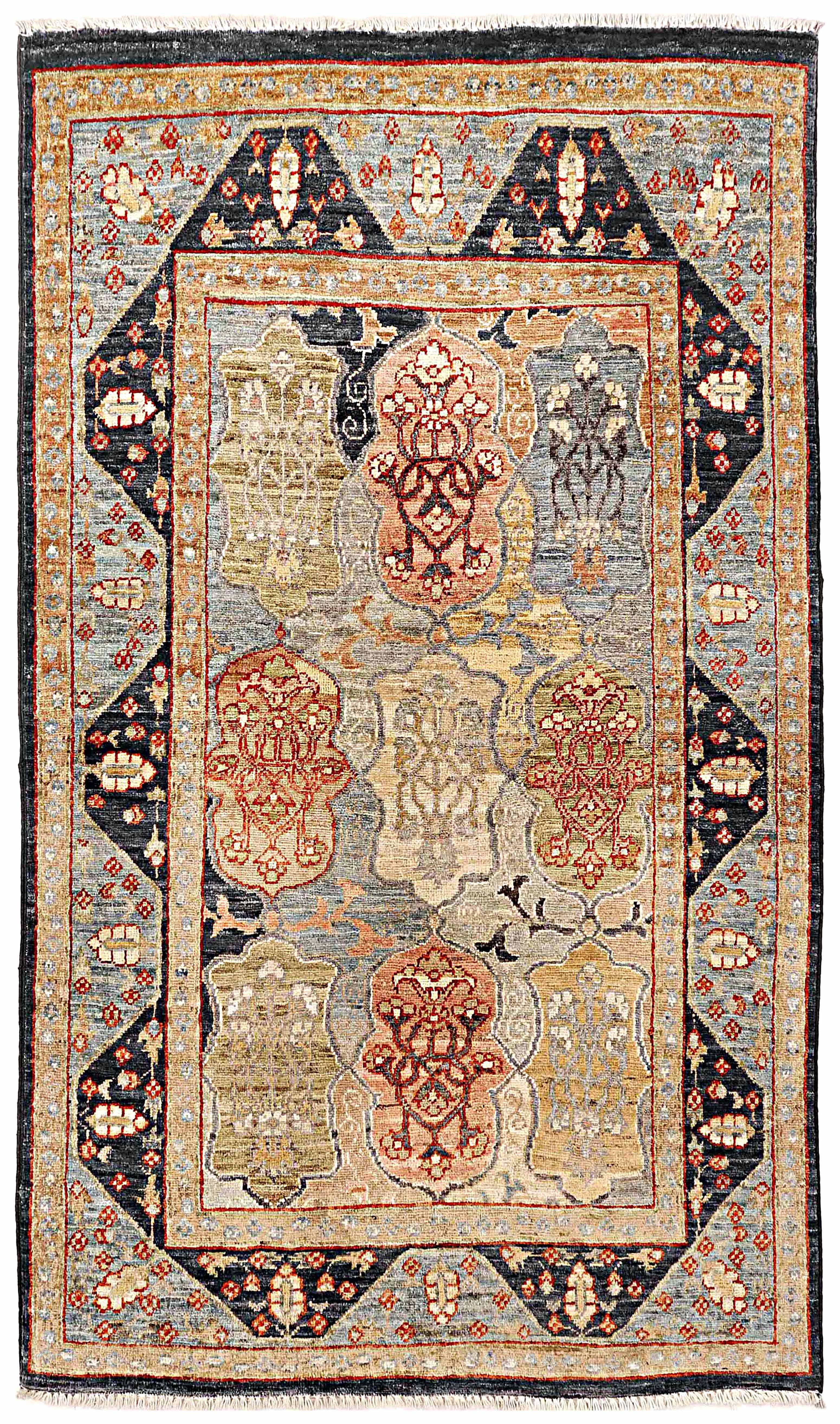 This rug has been woven with a tightly packed knot structure, giving it a fine, durable finish and allowing for greater detail in the design. The wool is hand-spun using traditional methods and selected for its quality, softness, and natural strength. It holds onto its lanolin, which gives the rug a silky sheen and that smooth, velvety feel underfoot.