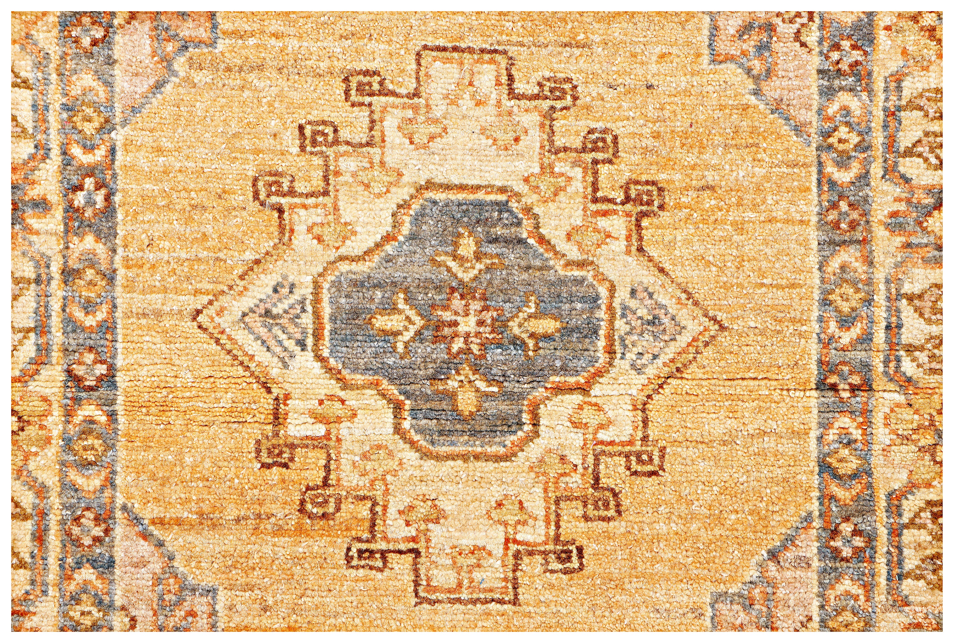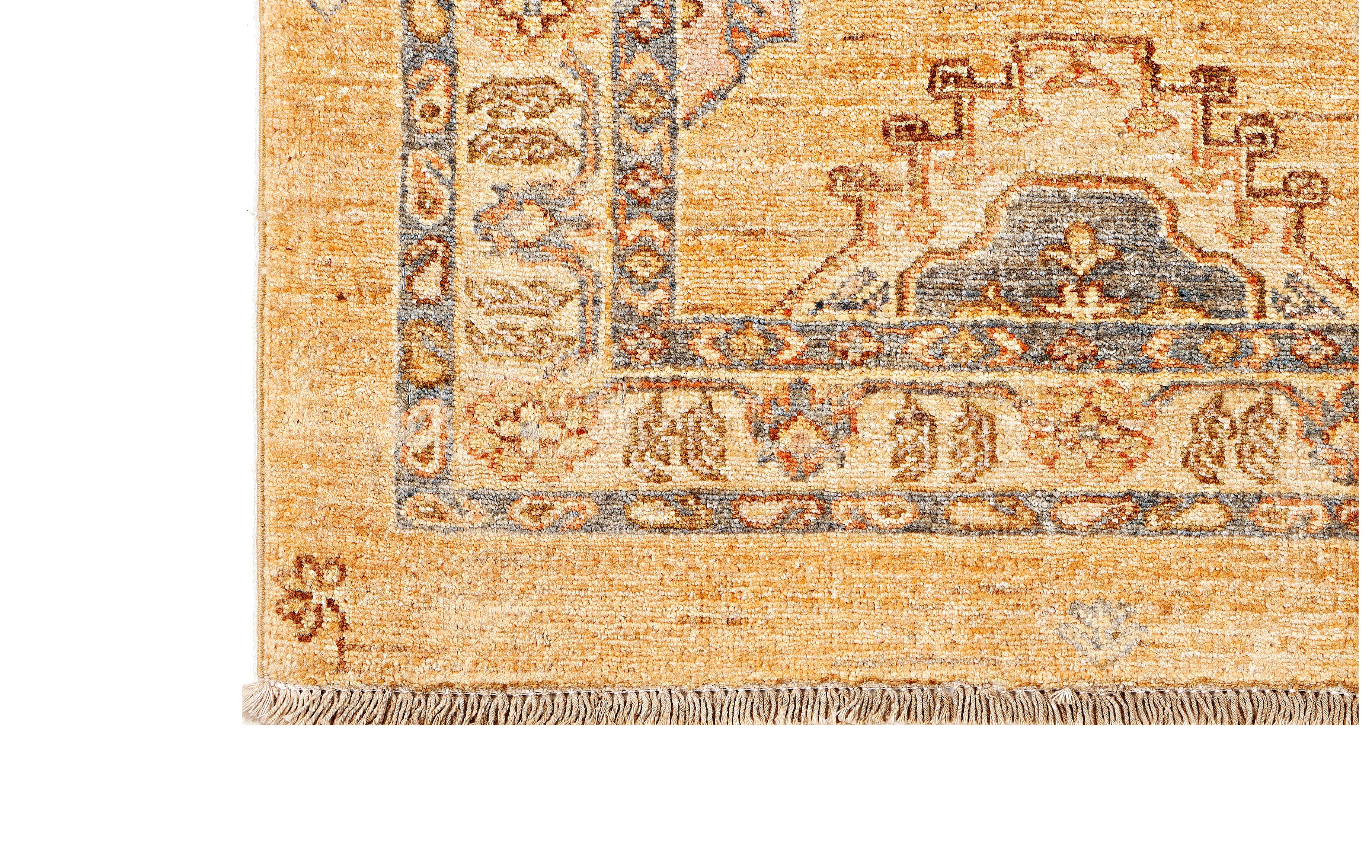This rug has been woven with a tightly packed knot structure, giving it a fine, durable finish and allowing for greater detail in the design. The wool is hand-spun using traditional methods and selected for its quality, softness, and natural strength. It holds onto its lanolin, which gives the rug a silky sheen and that smooth, velvety feel underfoot.
