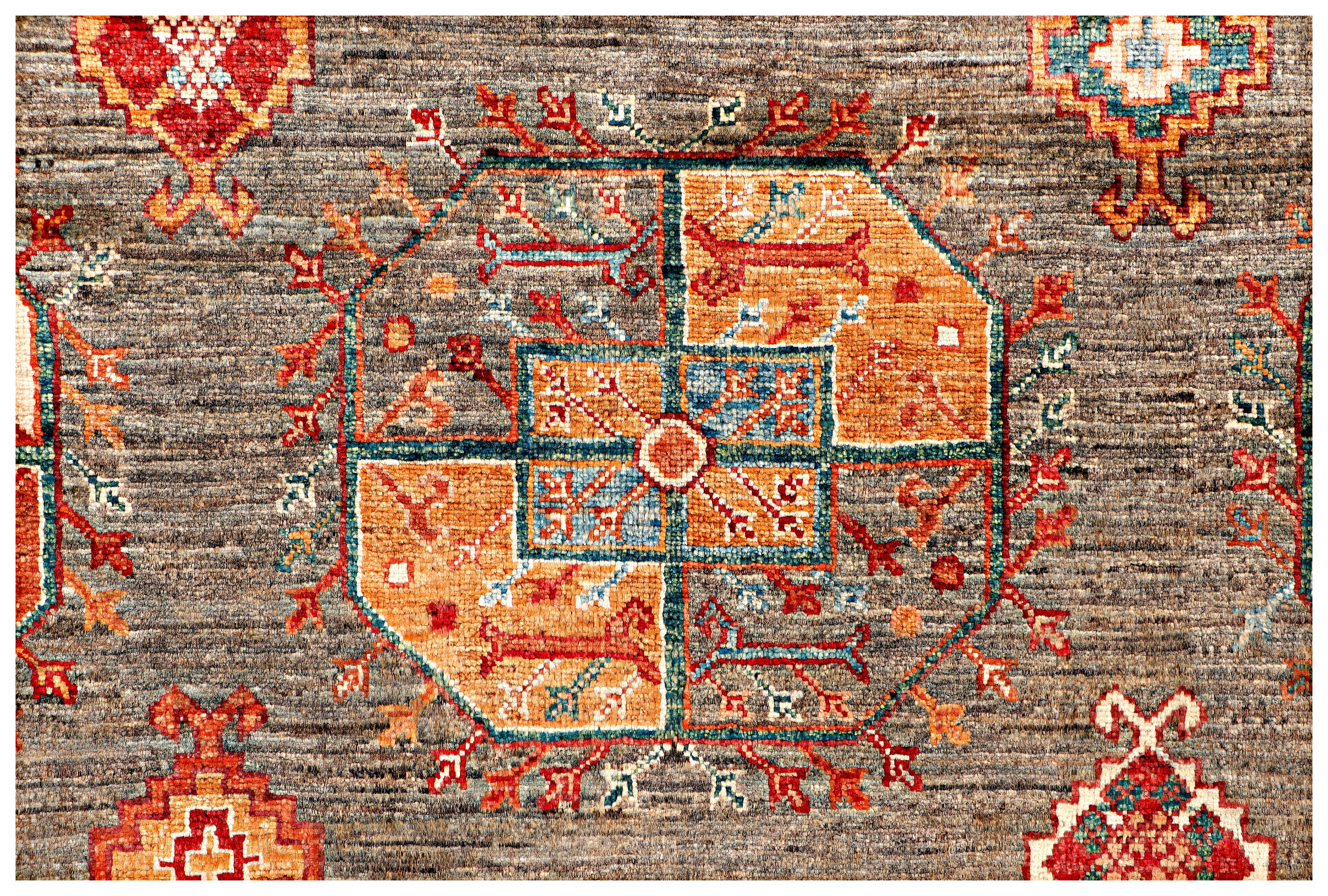 This rug has been woven with a tightly packed knot structure, giving it a fine, durable finish and allowing for greater detail in the design. The wool is hand-spun using traditional methods and selected for its quality, softness, and natural strength. It holds onto its lanolin, which gives the rug a silky sheen and that smooth, velvety feel underfoot.