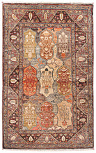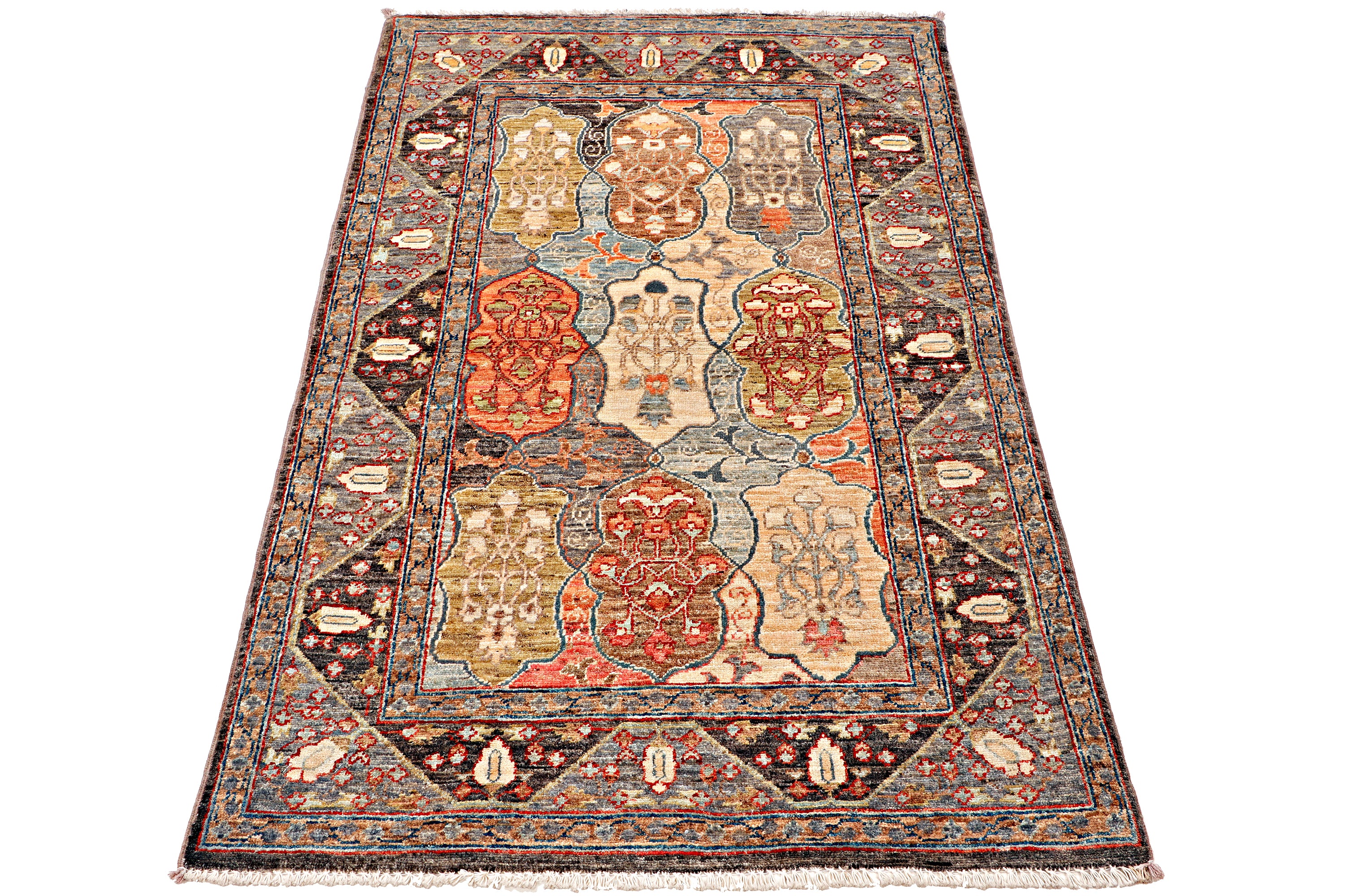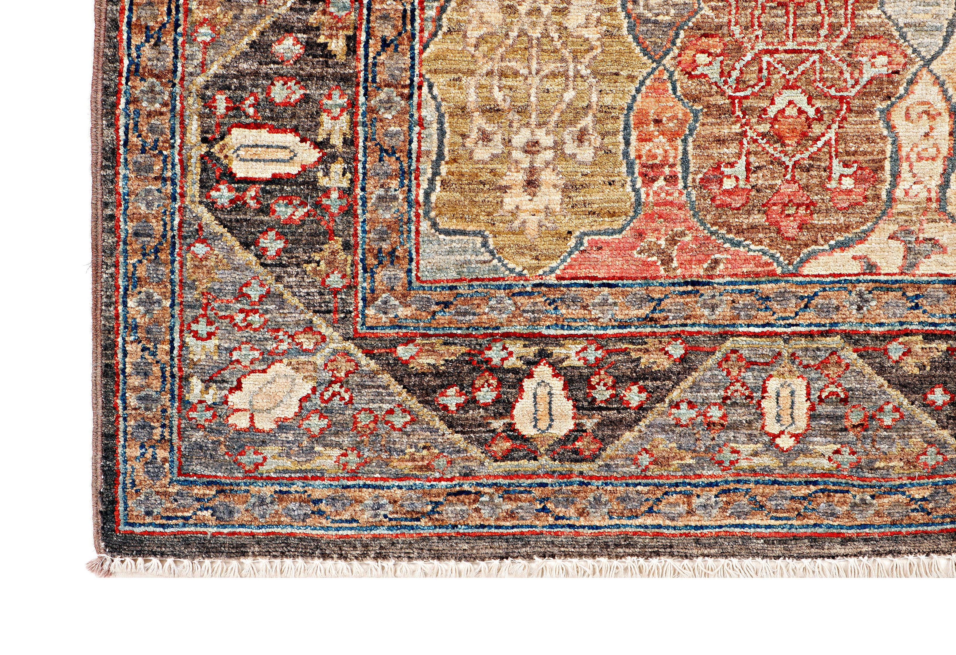 This rug has been woven with a tightly packed knot structure, giving it a fine, durable finish and allowing for greater detail in the design. The wool is hand-spun using traditional methods and selected for its quality, softness, and natural strength. It holds onto its lanolin, which gives the rug a silky sheen and that smooth, velvety feel underfoot.
