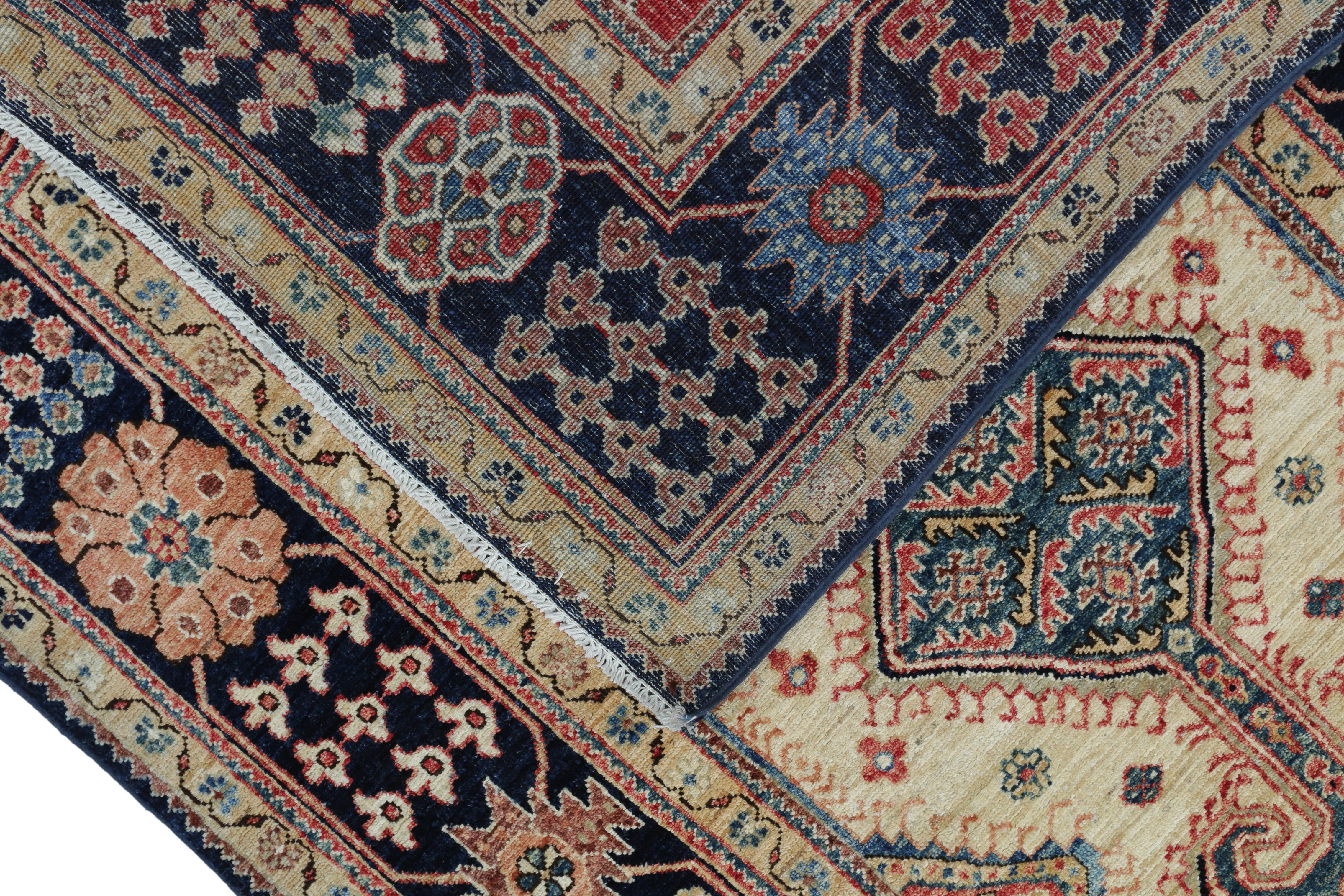 This rug has been woven with a tightly packed knot structure, giving it a fine, durable finish and allowing for greater detail in the design. The wool is hand-spun using traditional methods and selected for its quality, softness, and natural strength. It holds onto its lanolin, which gives the rug a silky sheen and that smooth, velvety feel underfoot.