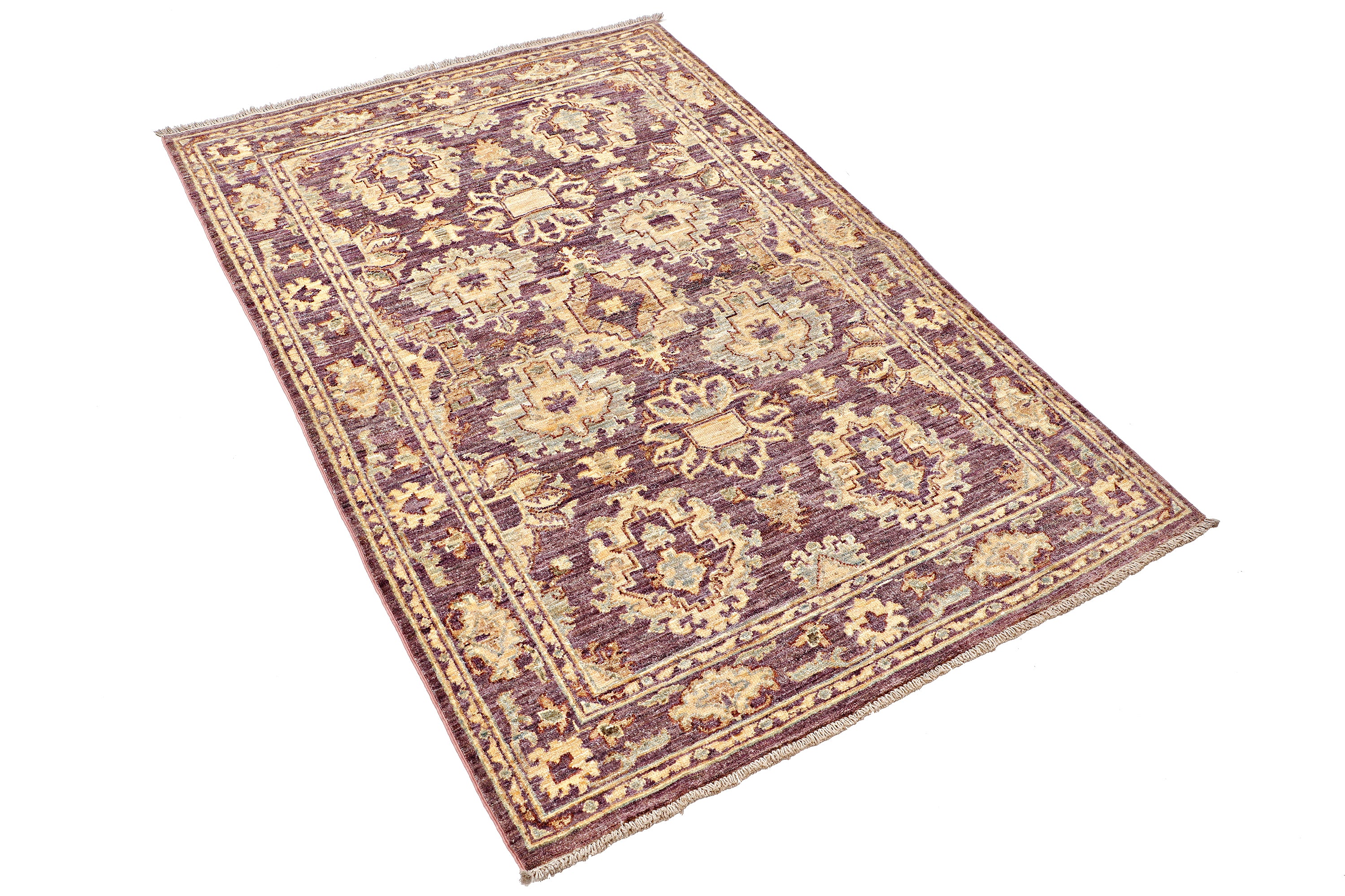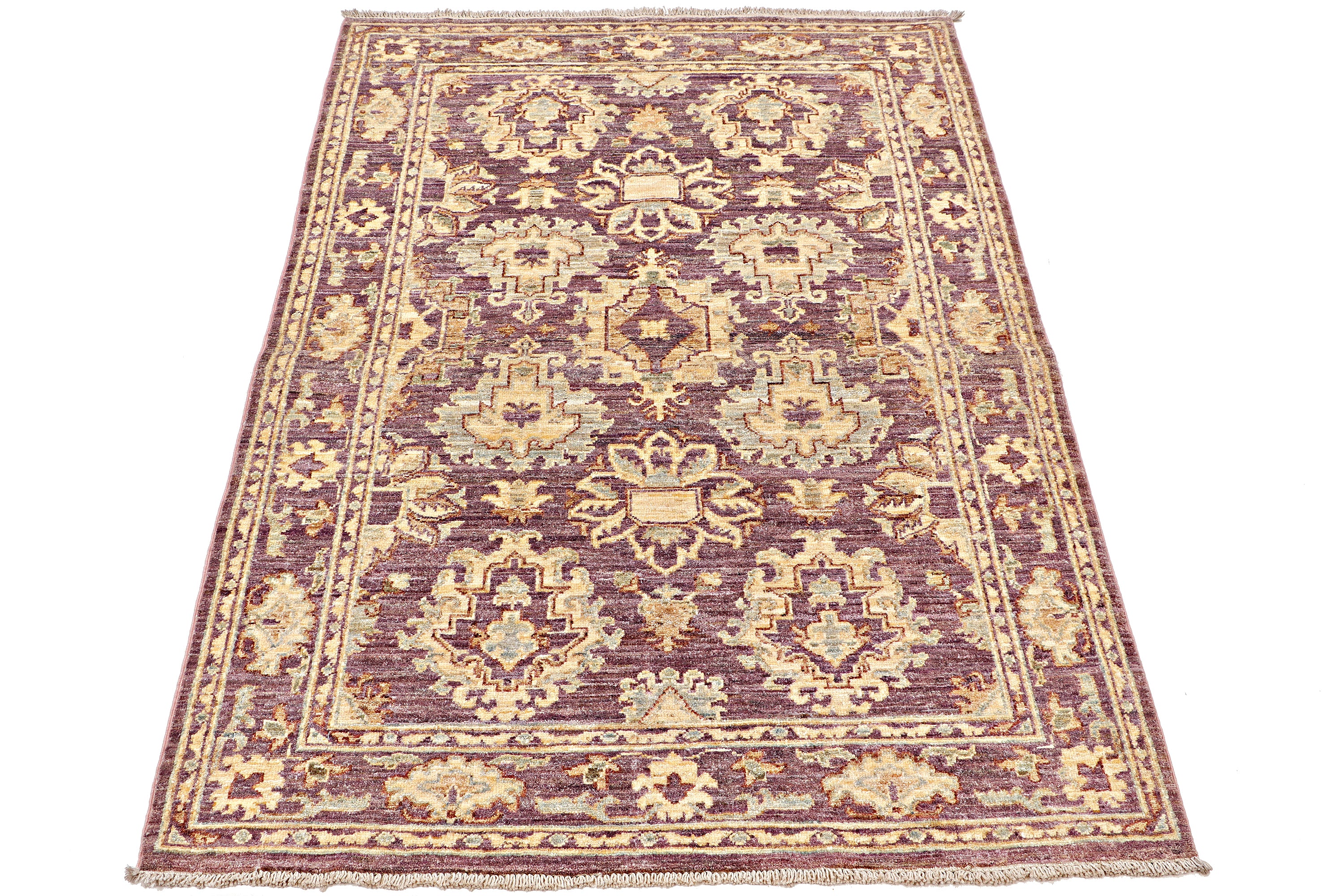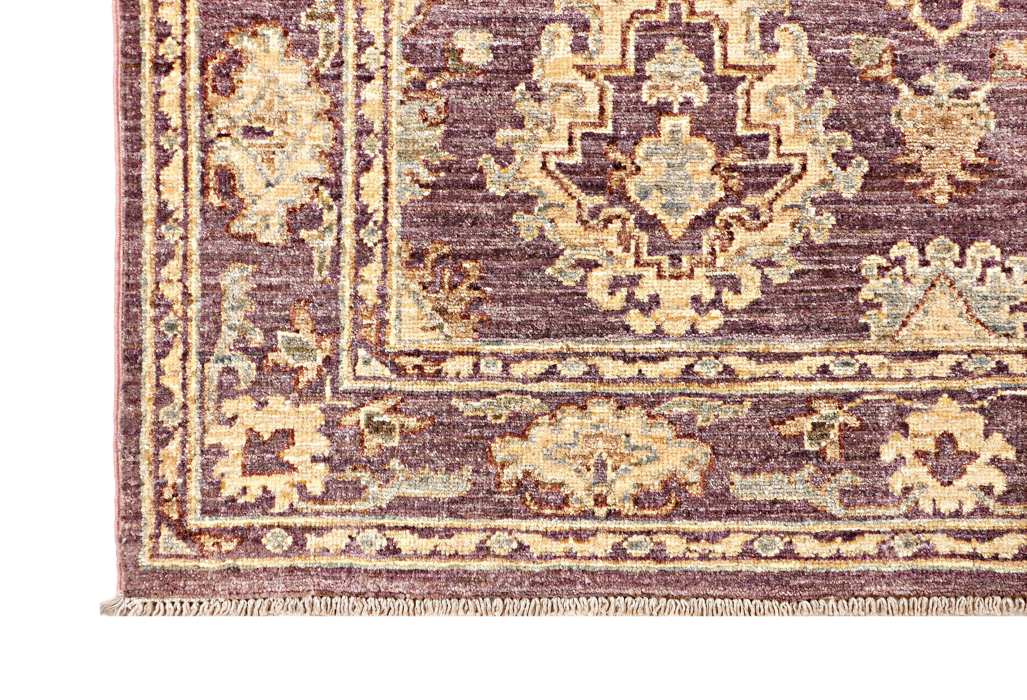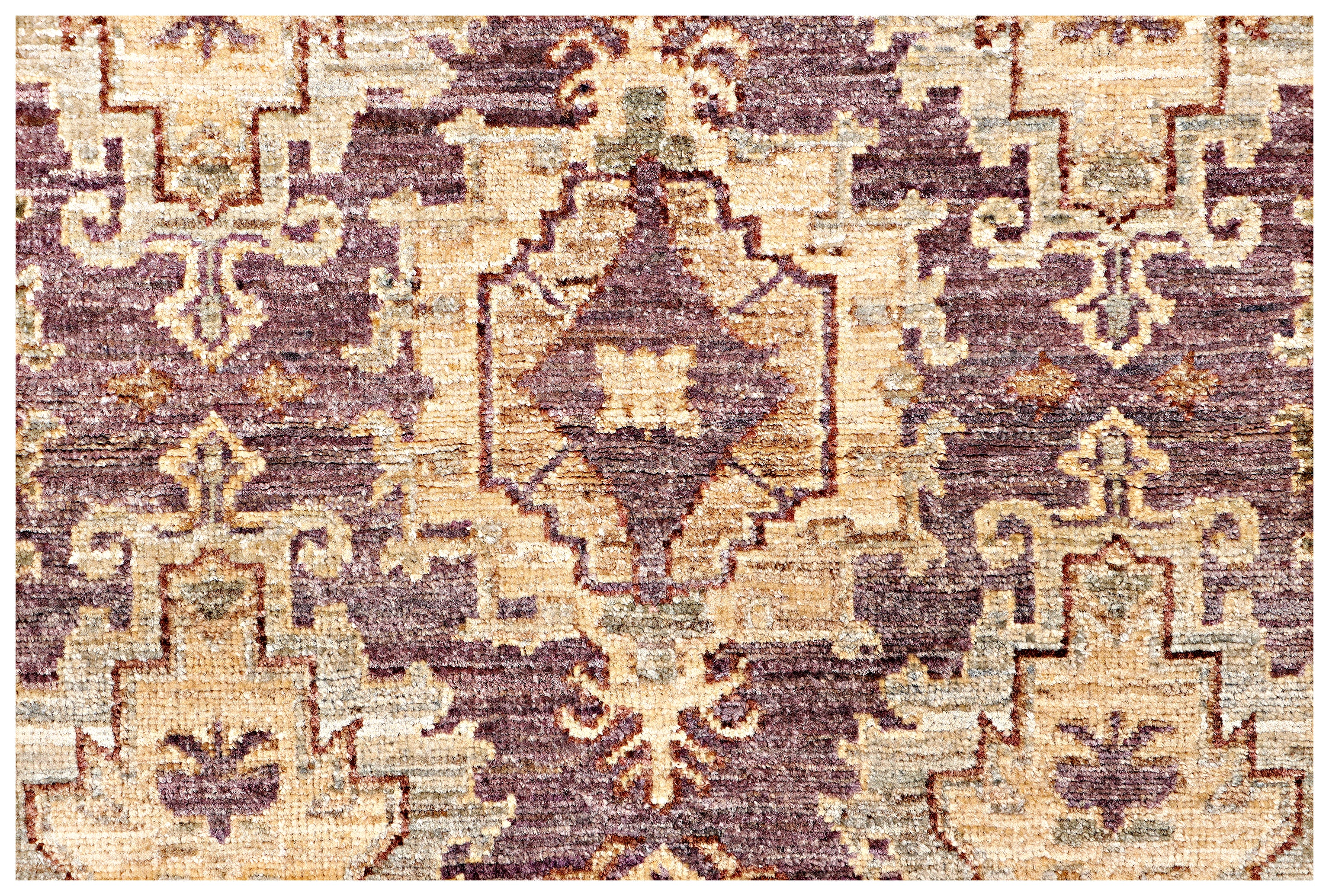 This rug has been woven with a tightly packed knot structure, giving it a fine, durable finish and allowing for greater detail in the design. The wool is hand-spun using traditional methods and selected for its quality, softness, and natural strength. It holds onto its lanolin, which gives the rug a silky sheen and that smooth, velvety feel underfoot.