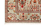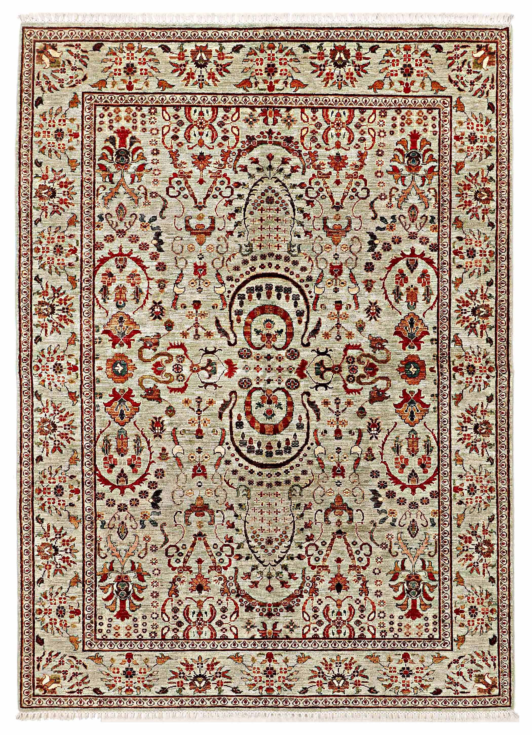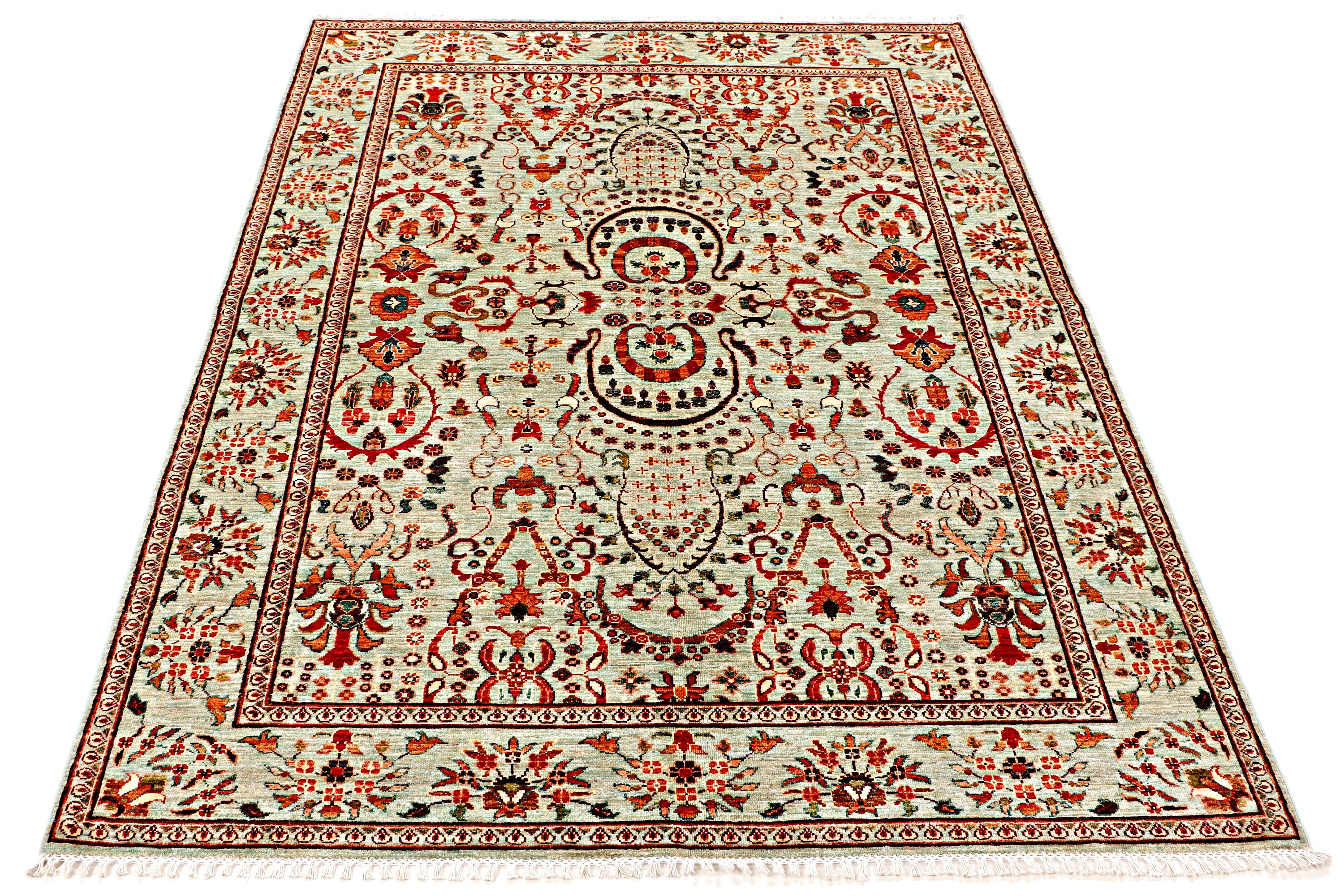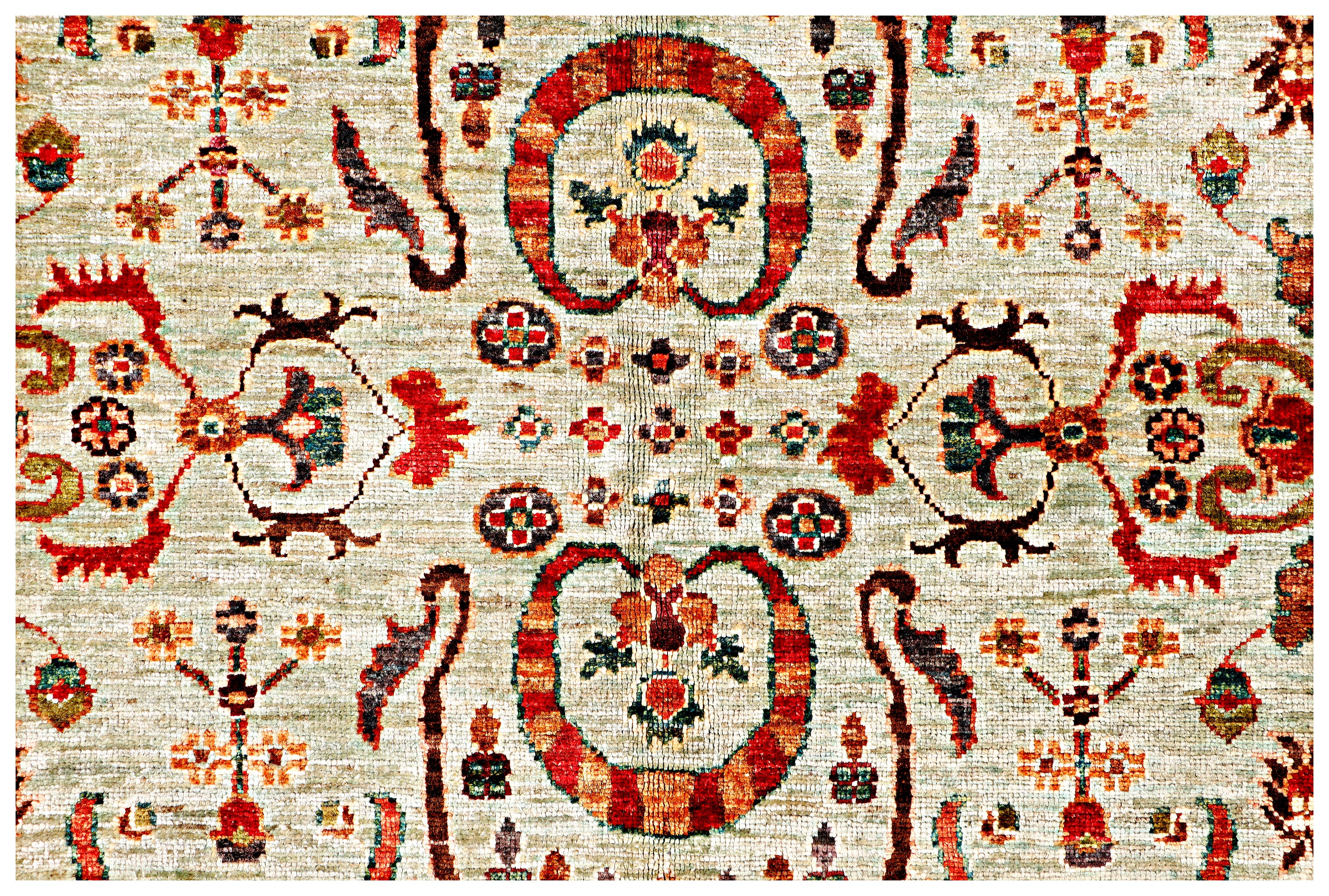This rug has been woven with a tightly packed knot structure, giving it a fine, durable finish and allowing for greater detail in the design. The wool is hand-spun using traditional methods and selected for its quality, softness, and natural strength. It holds onto its lanolin, which gives the rug a silky sheen and that smooth, velvety feel underfoot.