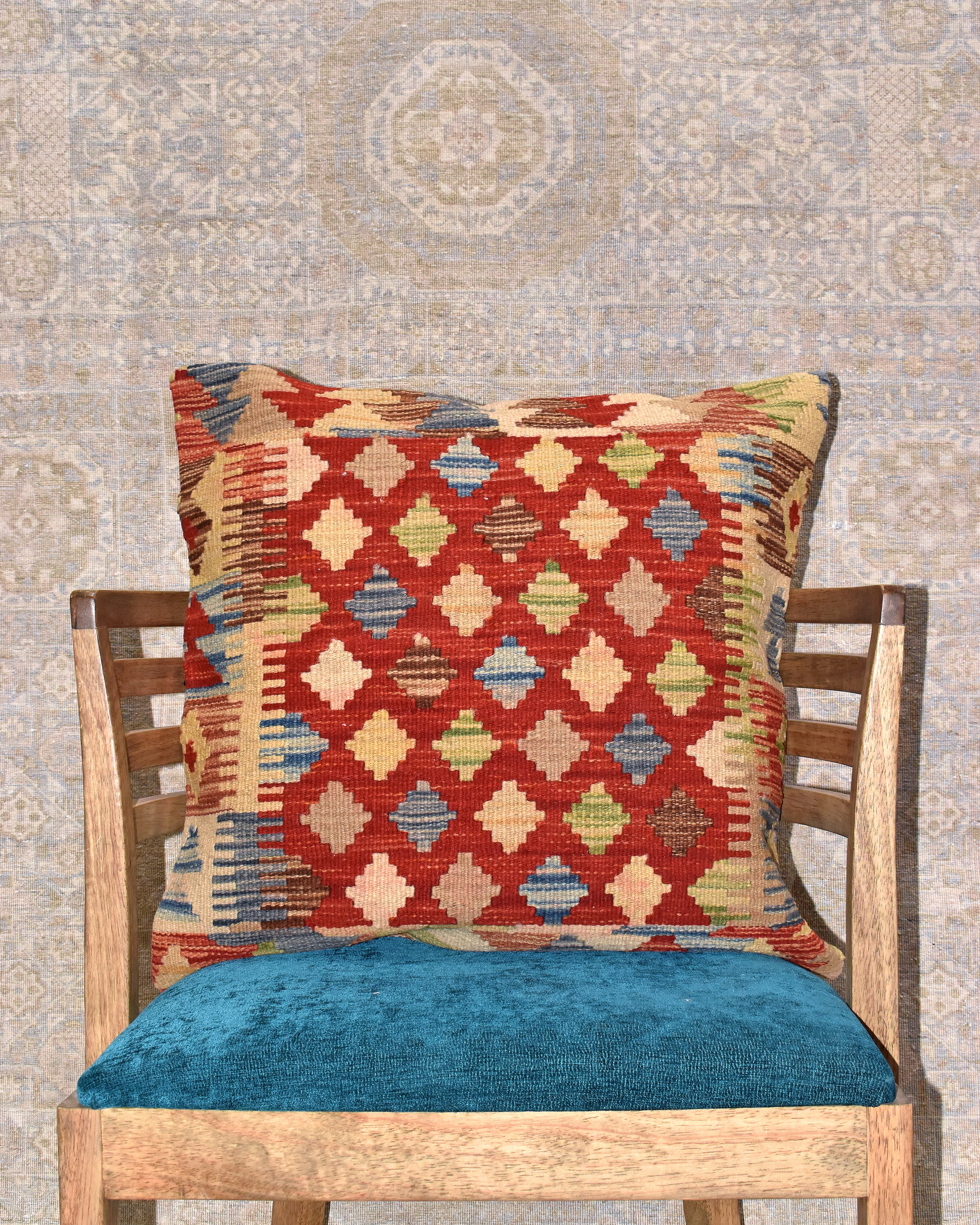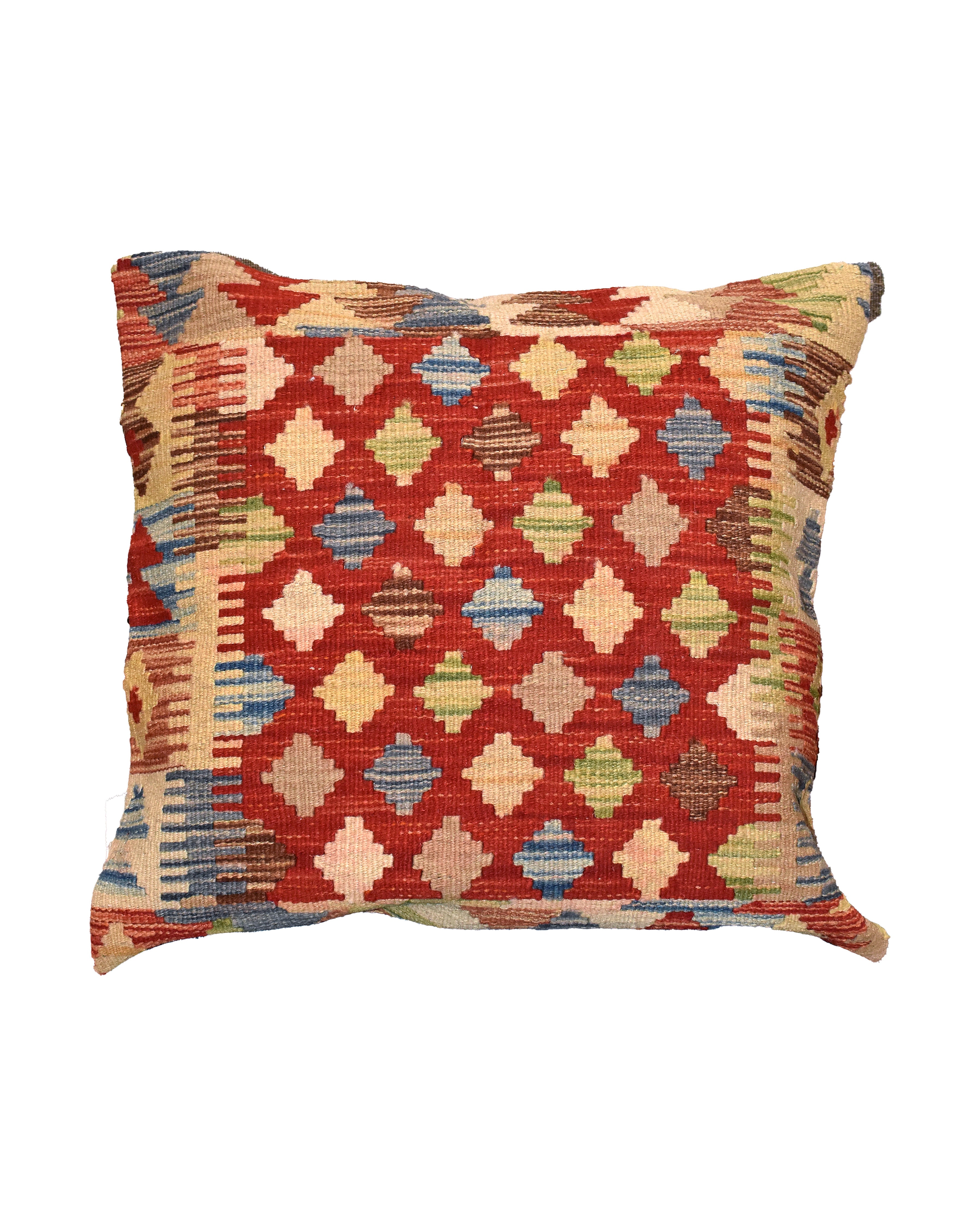 Afghan Maimana kilim cushions feature traditional flat-weave construction with bold geometric patterns in bright and earthy tones.