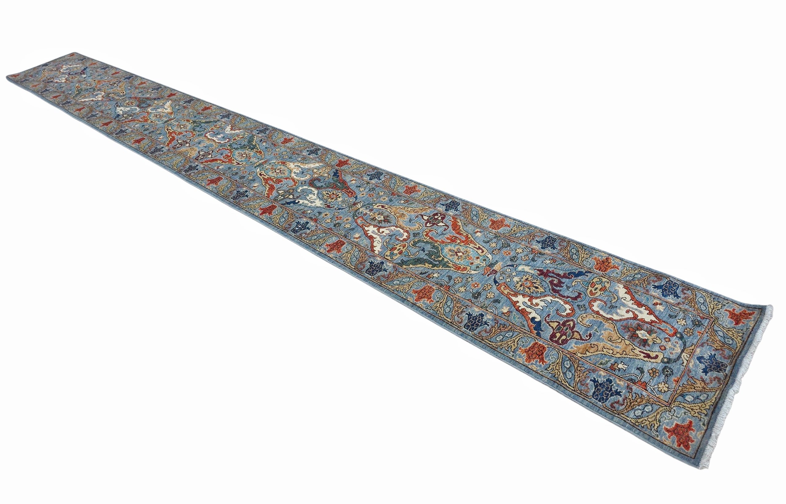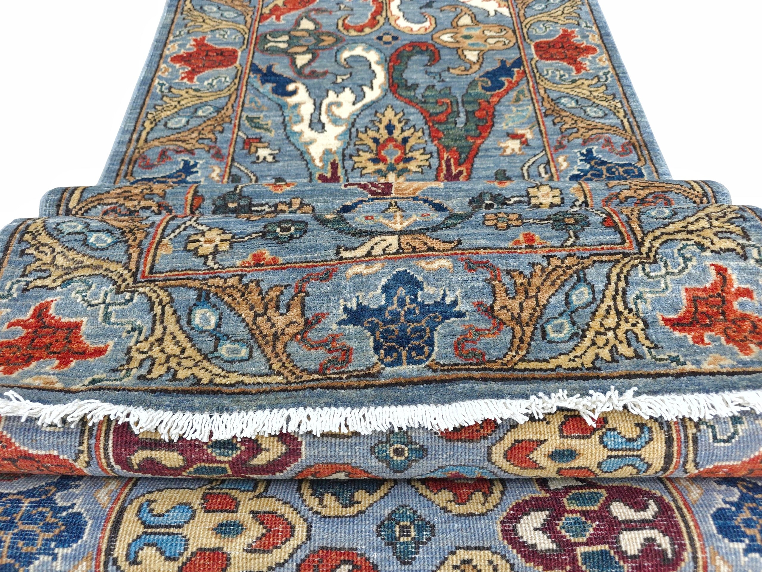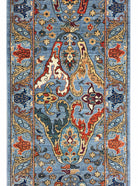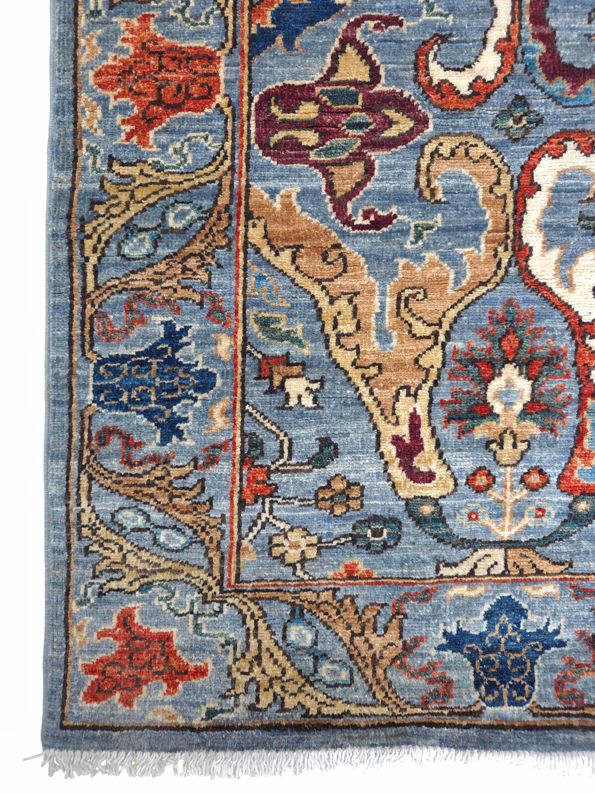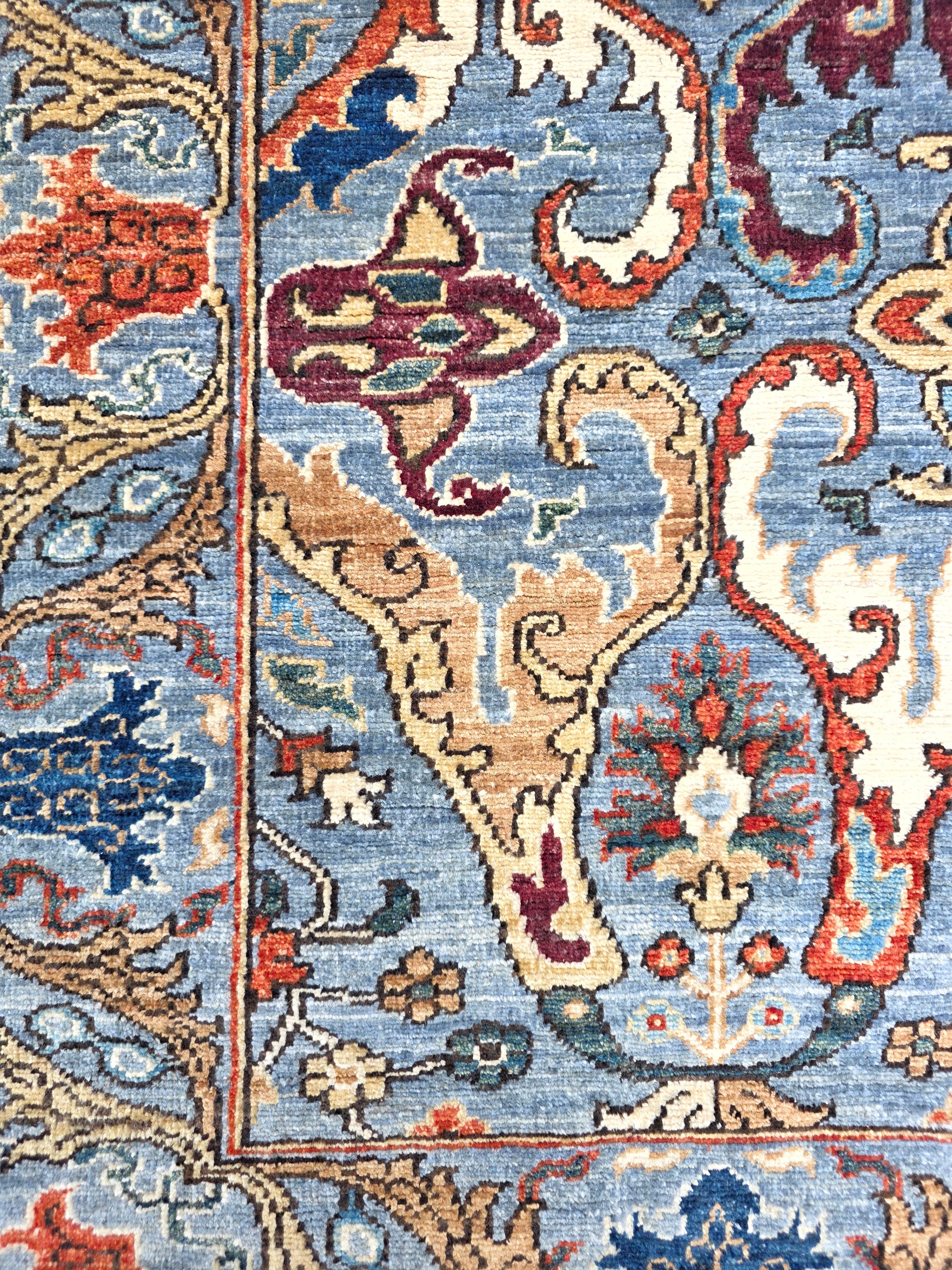 This rug has been woven with a tightly packed knot structure, giving it a fine, durable finish and allowing for greater detail in the design. The wool is hand-spun using traditional methods and selected for its quality, softness, and natural strength. It holds onto its lanolin, which gives the rug a silky sheen and that smooth, velvety feel underfoot.