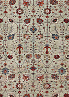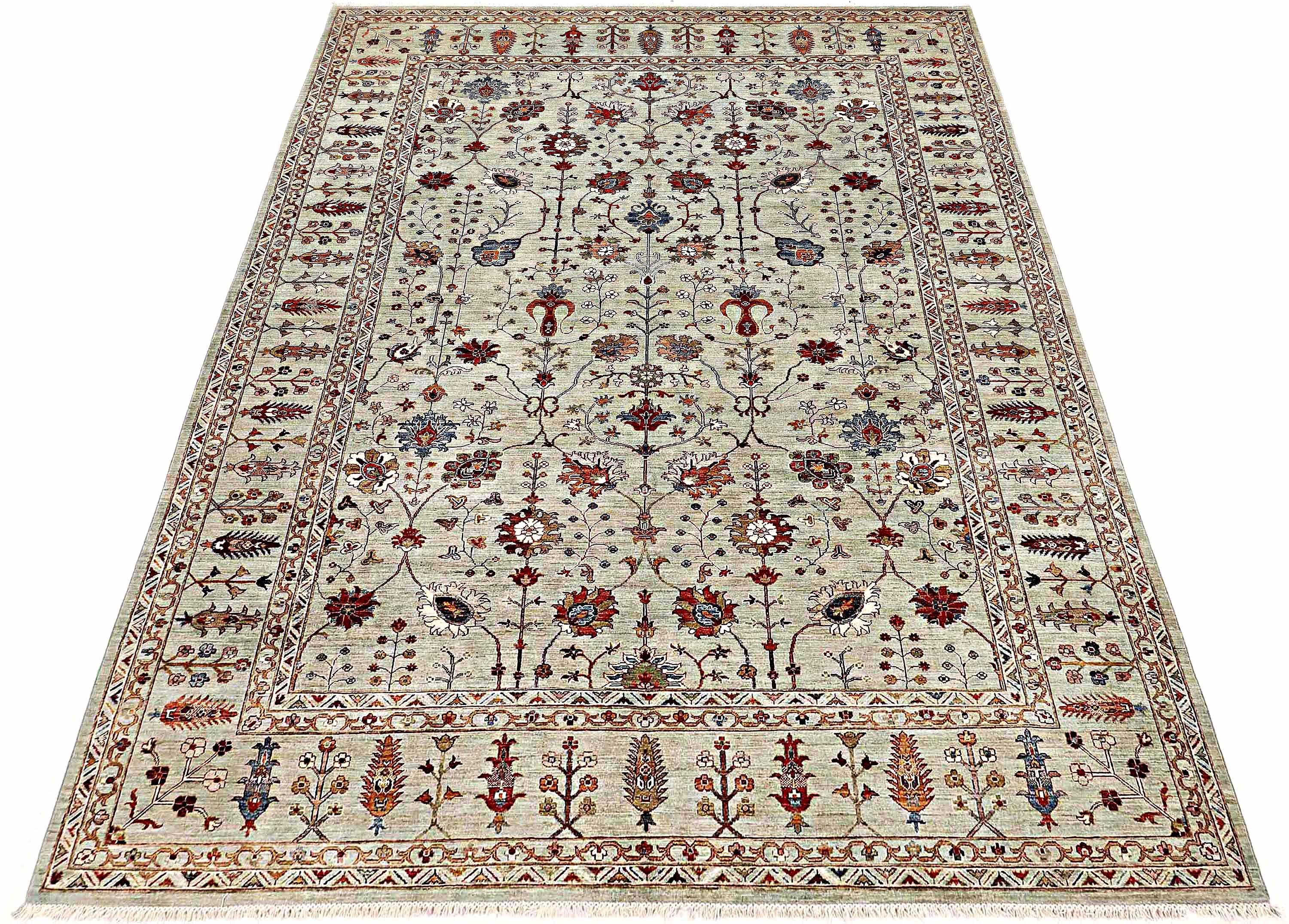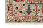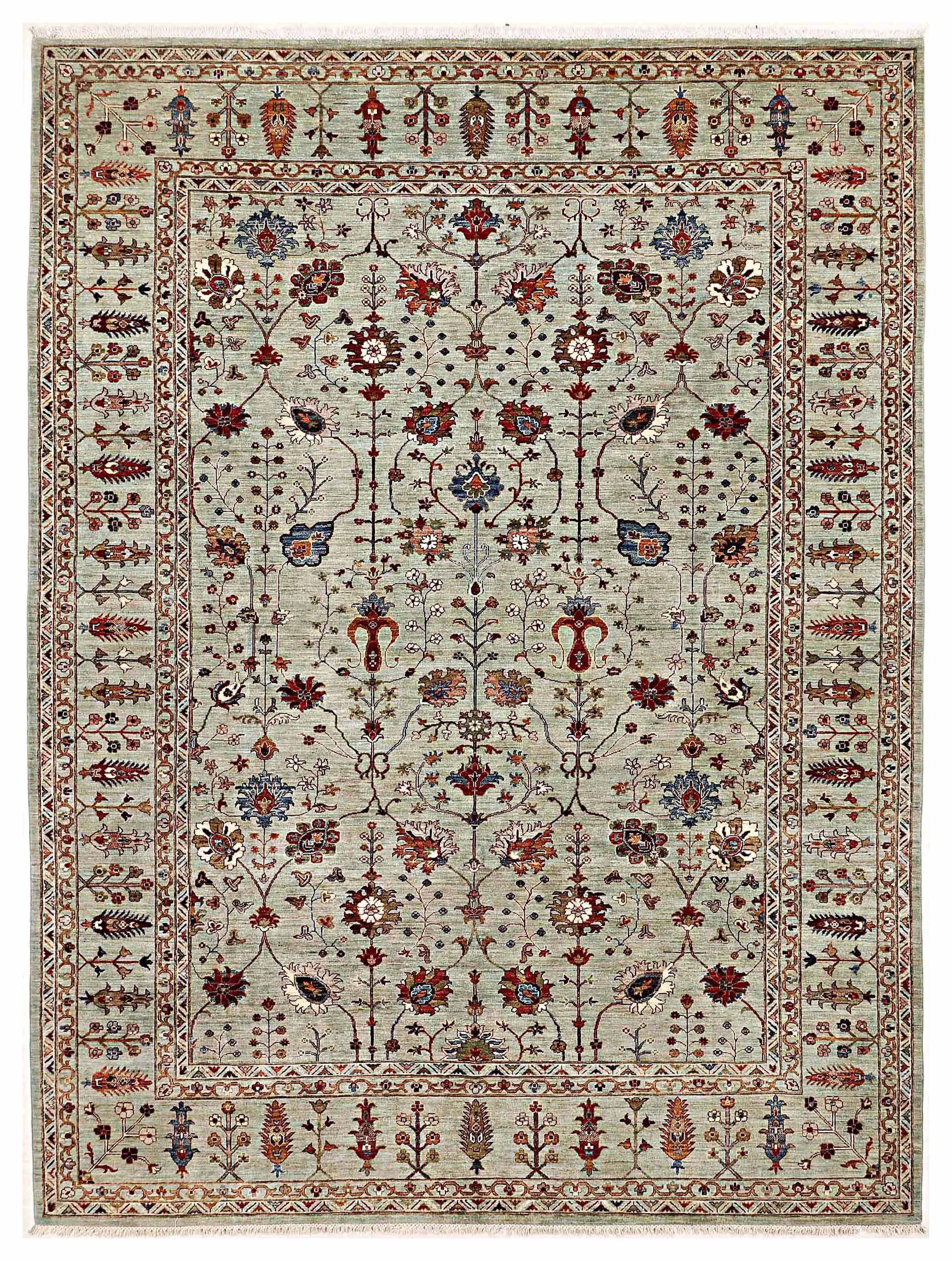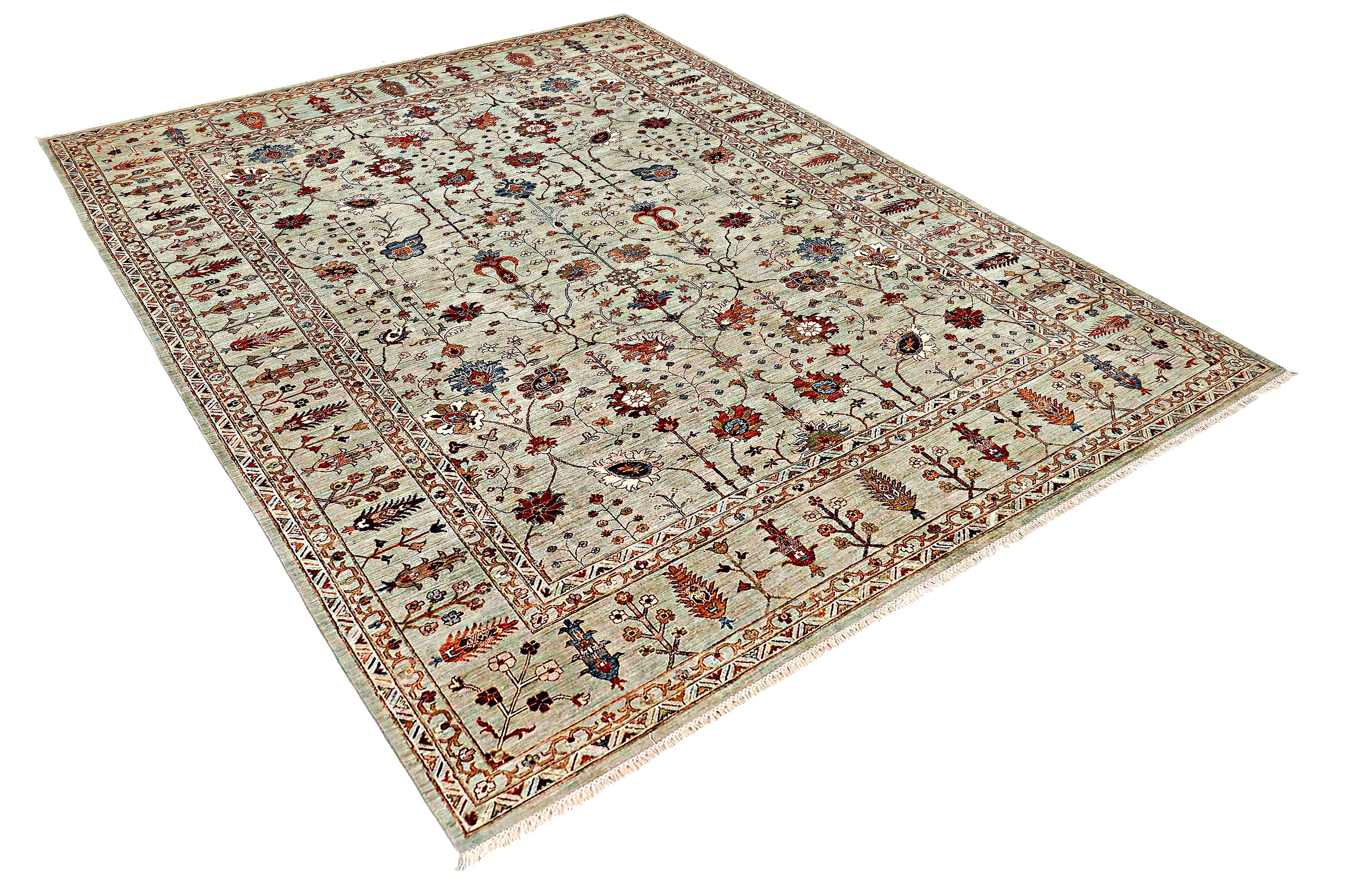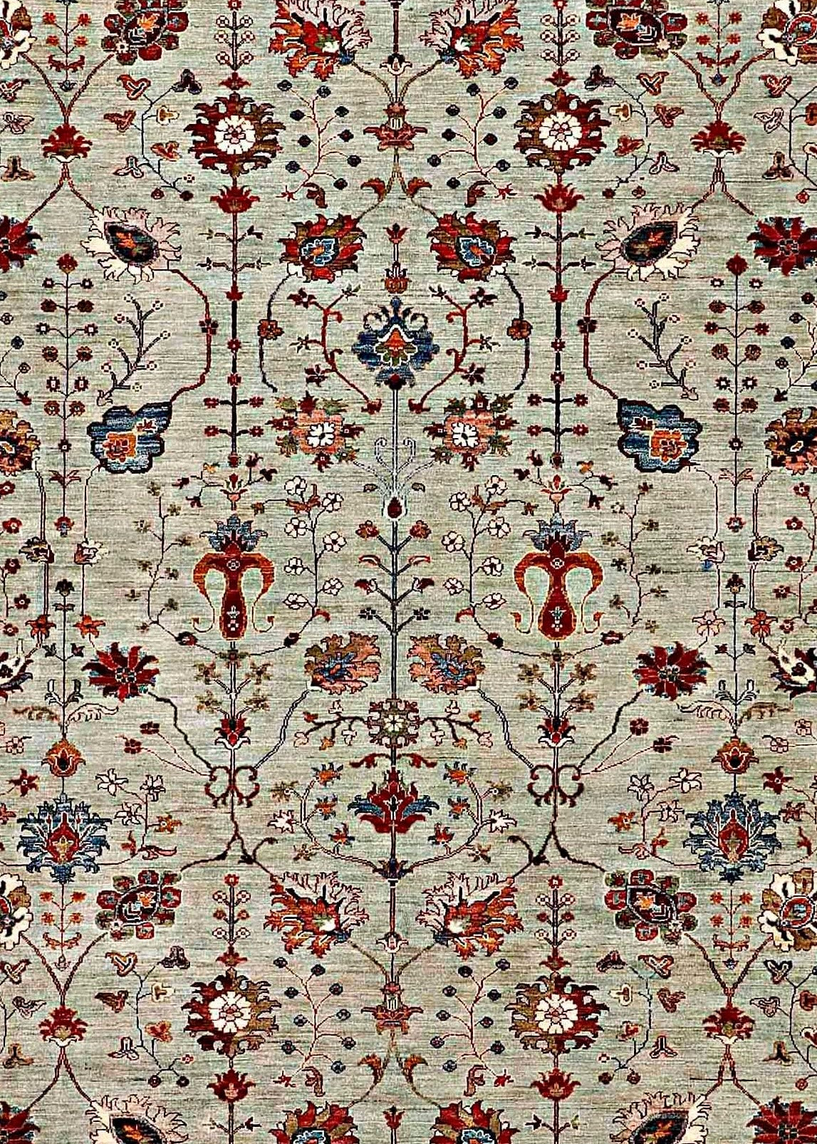 This rug has been woven with a tightly packed knot structure, giving it a fine, durable finish and allowing for greater detail in the design. The wool is hand-spun using traditional methods and selected for its quality, softness, and natural strength. It holds onto its lanolin, which gives the rug a silky sheen and that smooth, velvety feel underfoot.