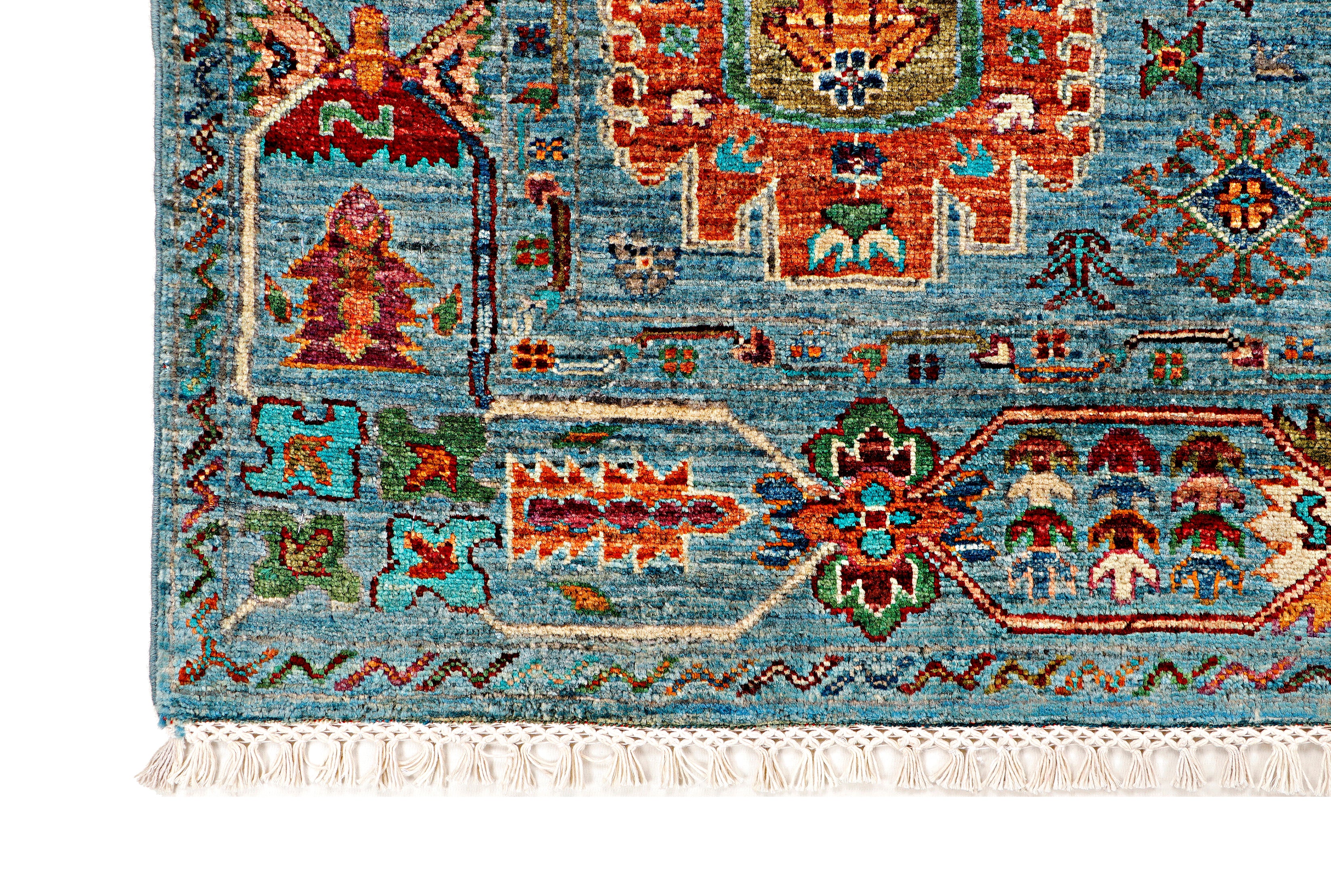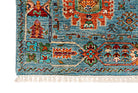 This rug has been woven with a tightly packed knot structure, giving it a fine, durable finish and allowing for greater detail in the design. The wool is hand-spun using traditional methods and selected for its quality, softness, and natural strength. It holds onto its lanolin, which gives the rug a silky sheen and that smooth, velvety feel underfoot.