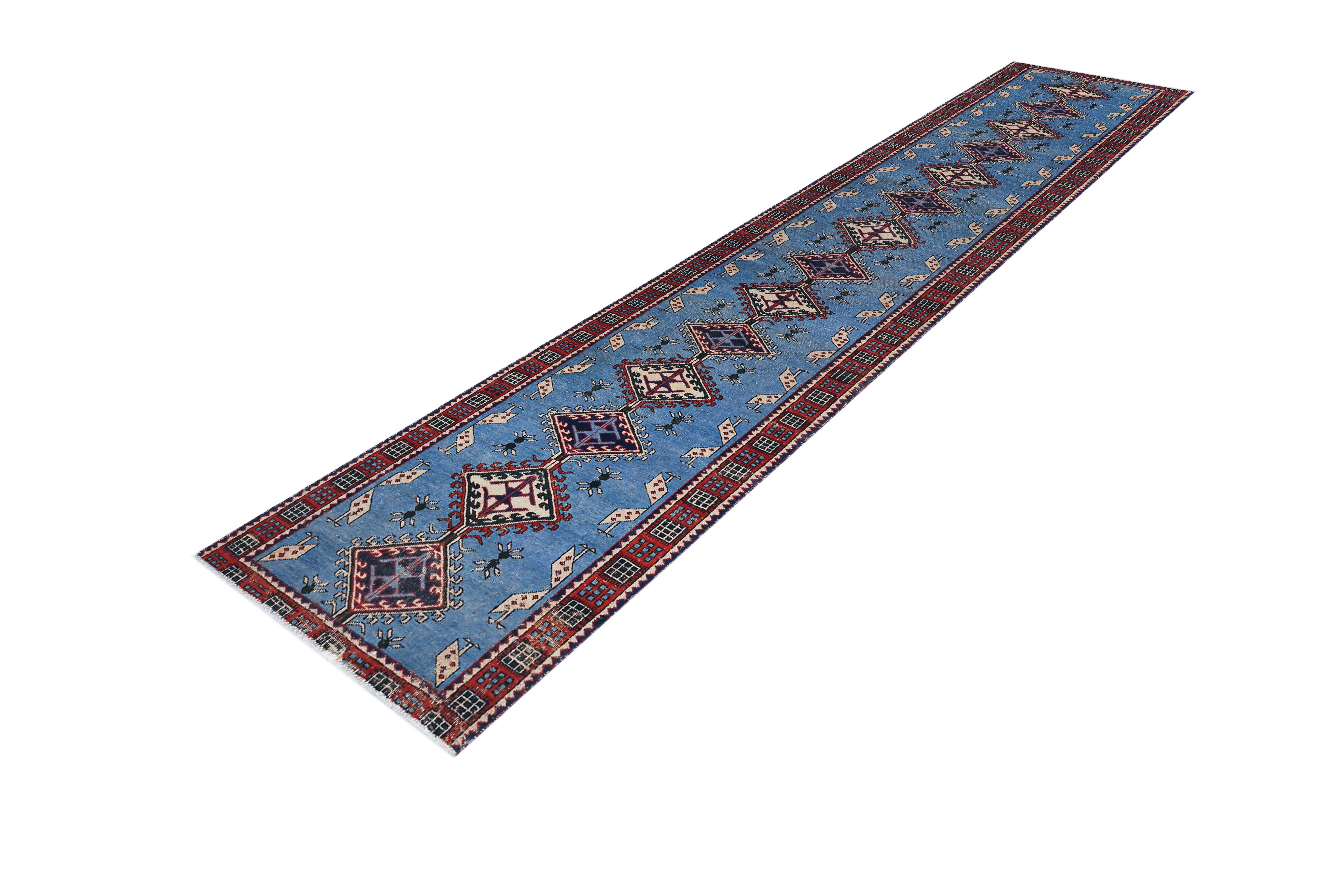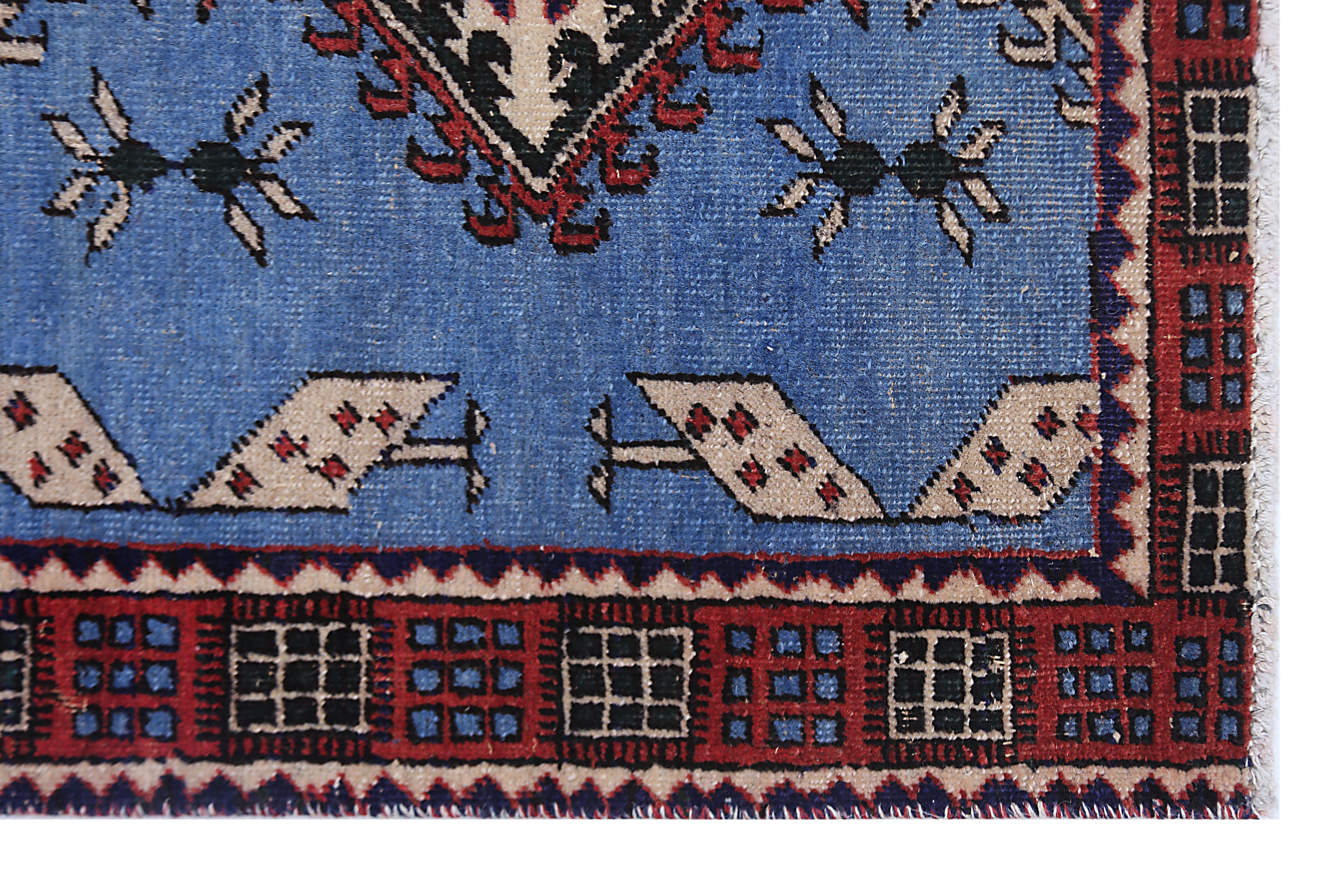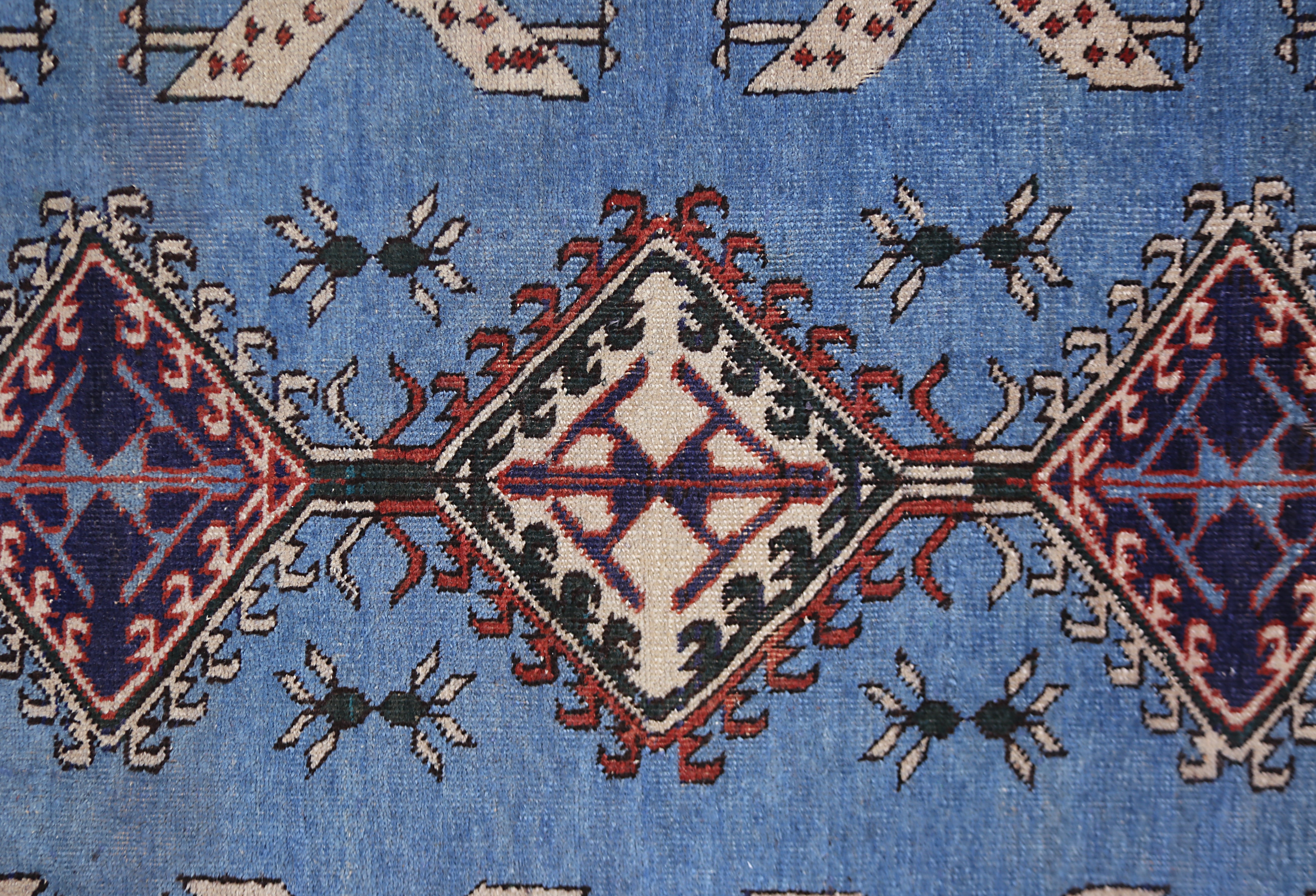 This vintage Caucasian rug is a stunning example of the artistry and craftsmanship of the Caucasus region, an area nestled between the Black Sea and the Caspian Sea, encompassing modern-day Armenia, Azerbaijan, Georgia, and parts of southern Russia. Known for their bold geometric patterns, symbolic tribal motifs, and vibrant colours, Caucasian rugs reflect the rich cultural heritage of the region. Hand-knotted using high-quality wool, this rug is as durable as it is beautiful. The palette of deep reds, blues, and ivory tones, paired with intricate designs, brings a unique and timeless charm to the piece. Each motif often holds cultural significance, making this rug not just a decorative item but a story woven into fibres.