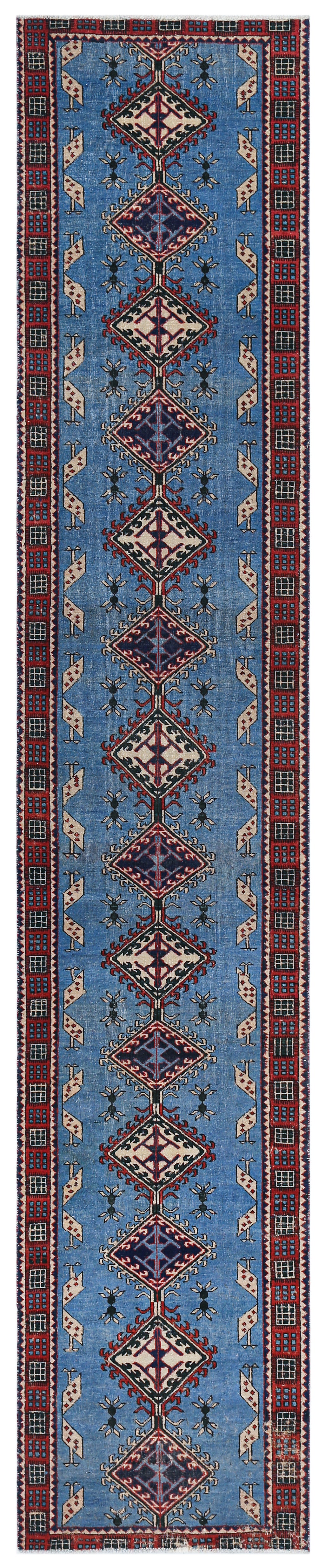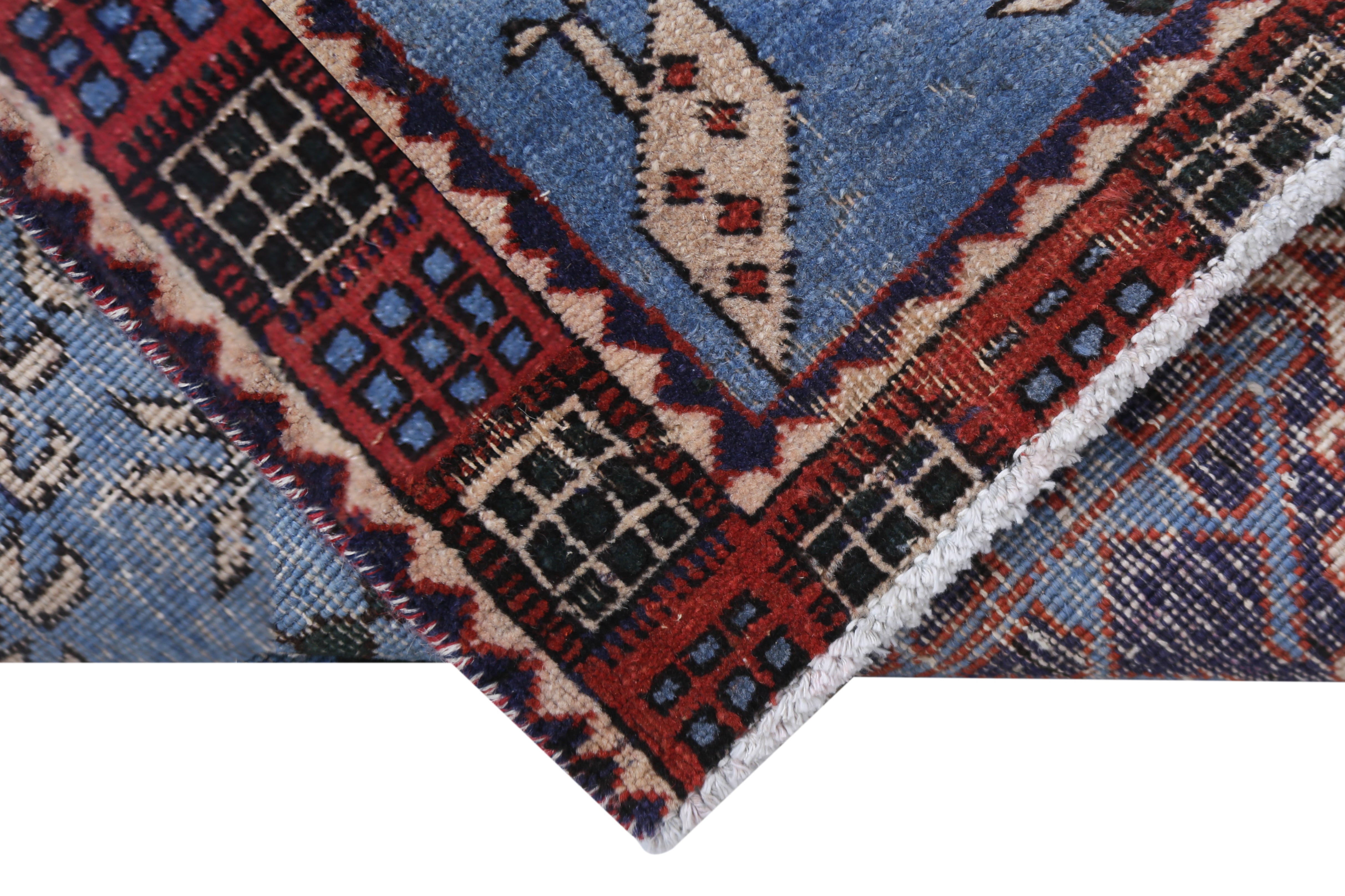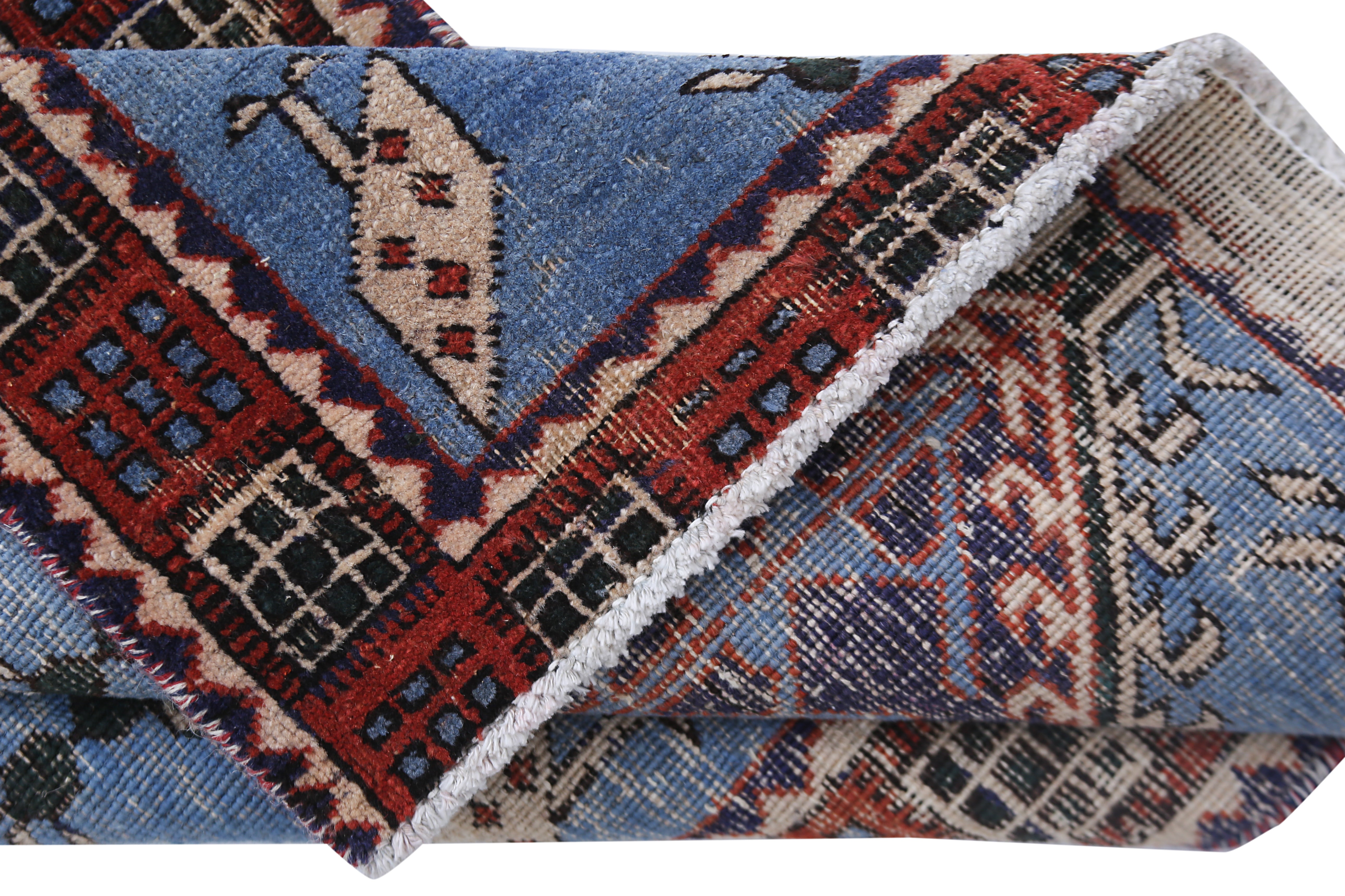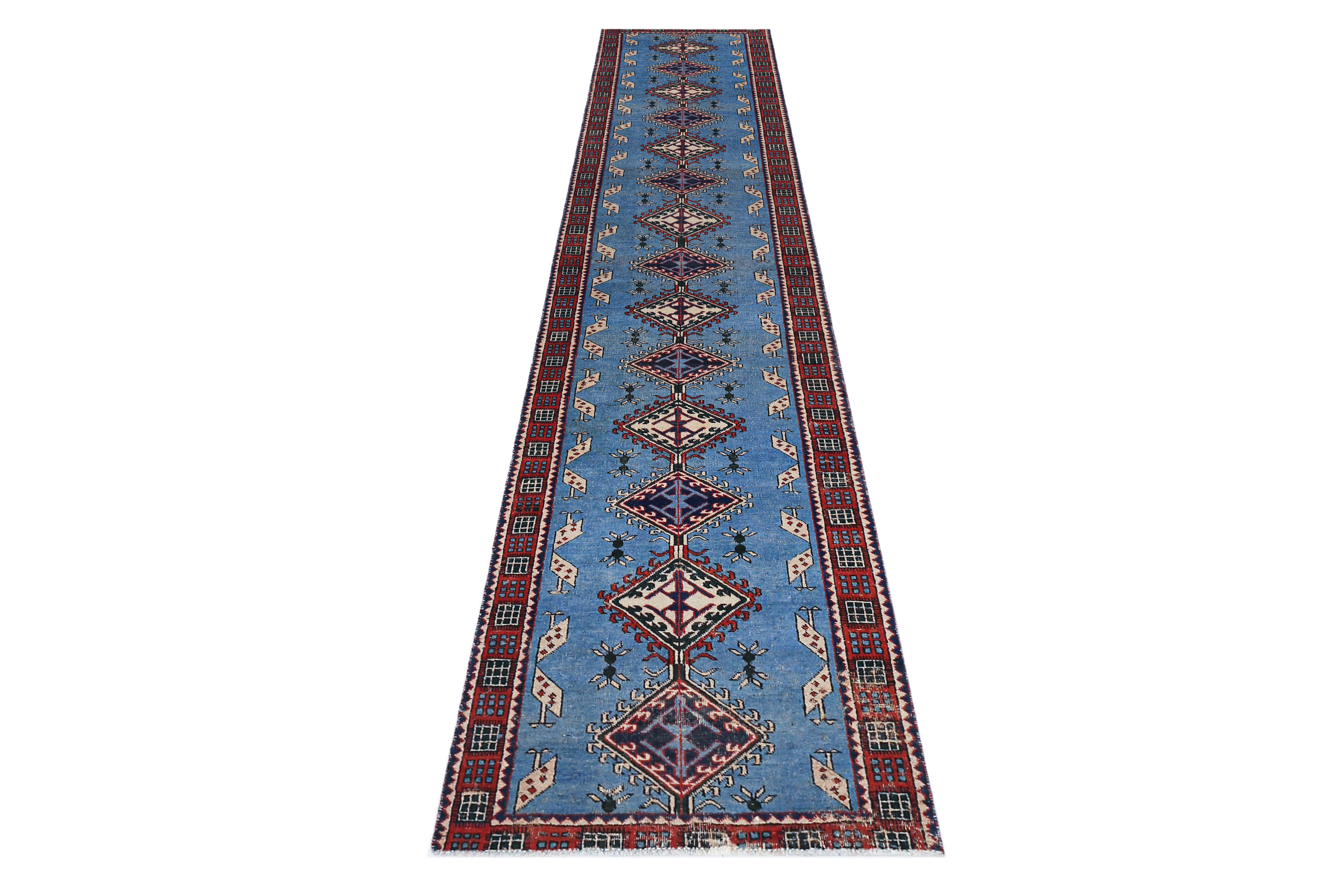 This vintage Caucasian rug is a stunning example of the artistry and craftsmanship of the Caucasus region, an area nestled between the Black Sea and the Caspian Sea, encompassing modern-day Armenia, Azerbaijan, Georgia, and parts of southern Russia. Known for their bold geometric patterns, symbolic tribal motifs, and vibrant colours, Caucasian rugs reflect the rich cultural heritage of the region. Hand-knotted using high-quality wool, this rug is as durable as it is beautiful. The palette of deep reds, blues, and ivory tones, paired with intricate designs, brings a unique and timeless charm to the piece. Each motif often holds cultural significance, making this rug not just a decorative item but a story woven into fibres.