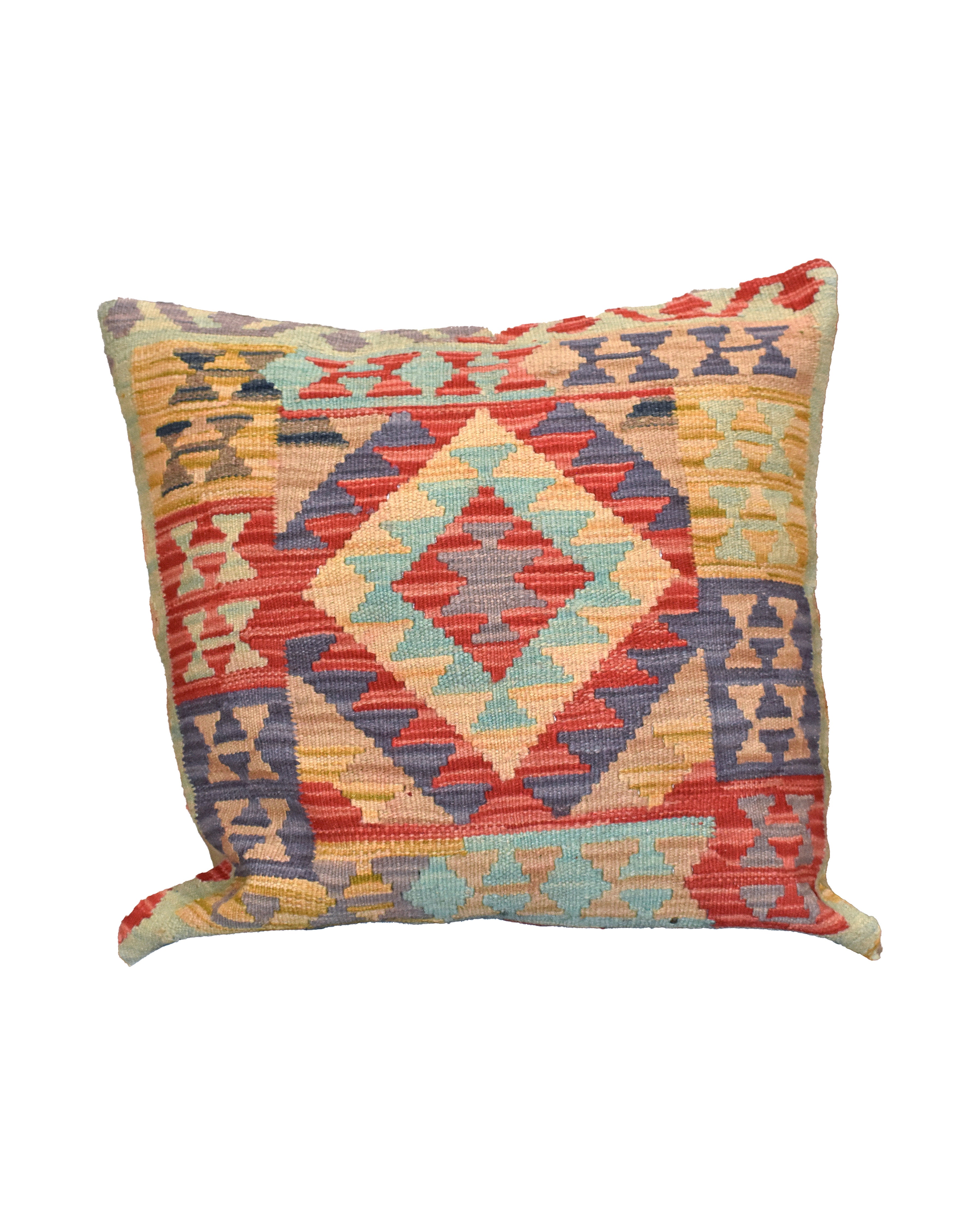 Afghan Maimana kilim cushions feature traditional flat-weave construction with bold geometric patterns in bright and earthy tones.