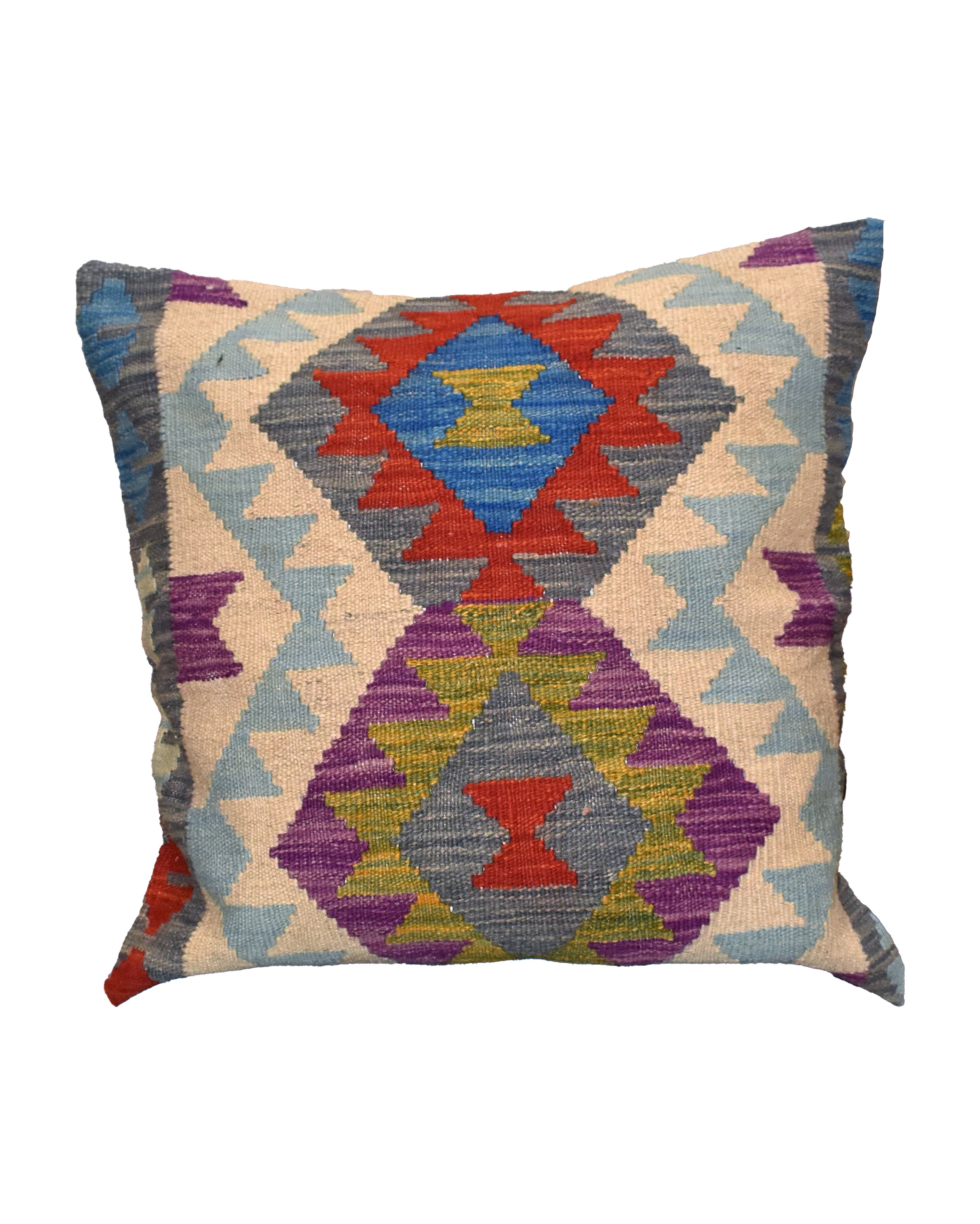 Afghan Maimana kilim cushions feature traditional flat-weave construction with bold geometric patterns in bright and earthy tones.