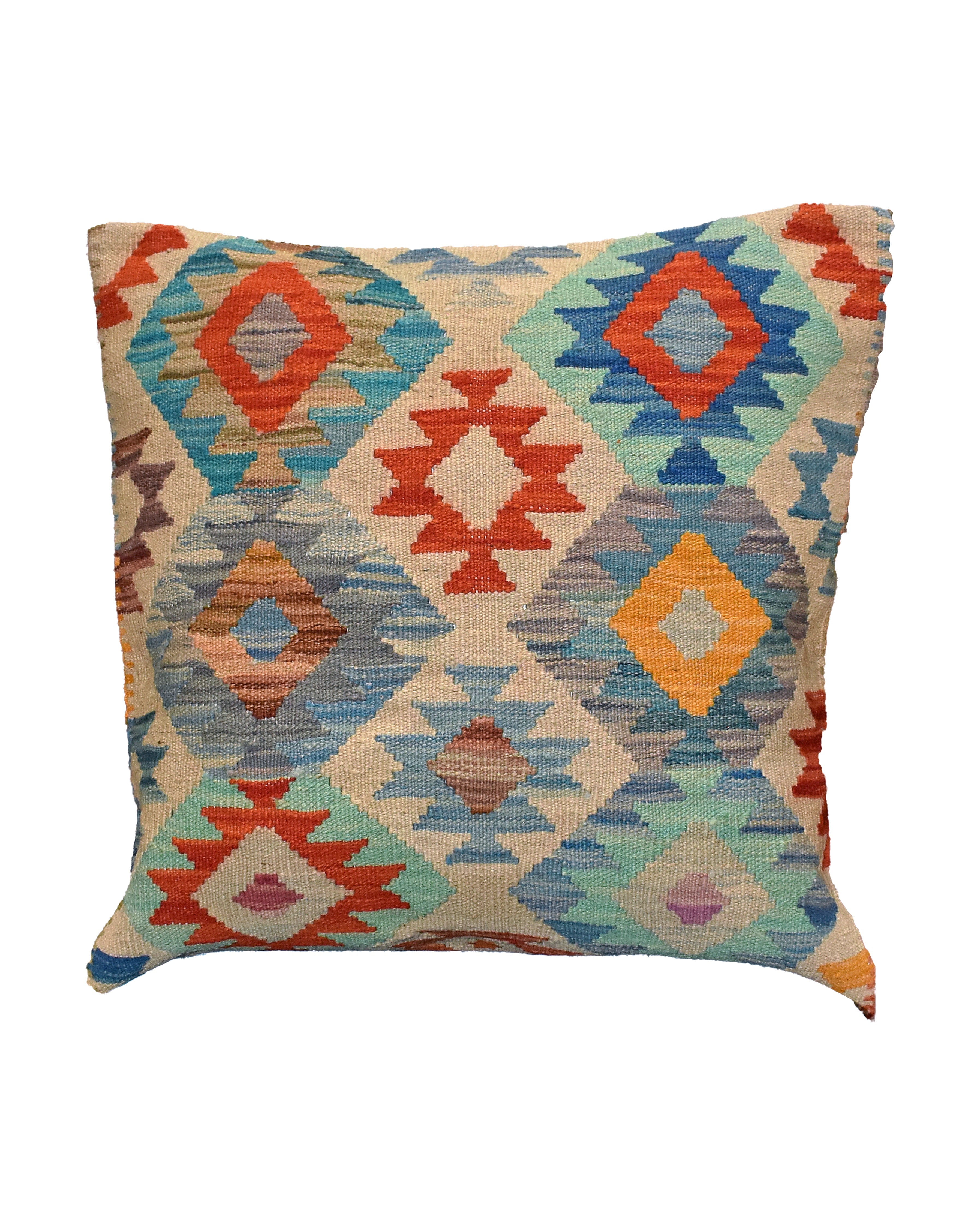 Afghan Maimana kilim cushions feature traditional flat-weave construction with bold geometric patterns in bright and earthy tones.