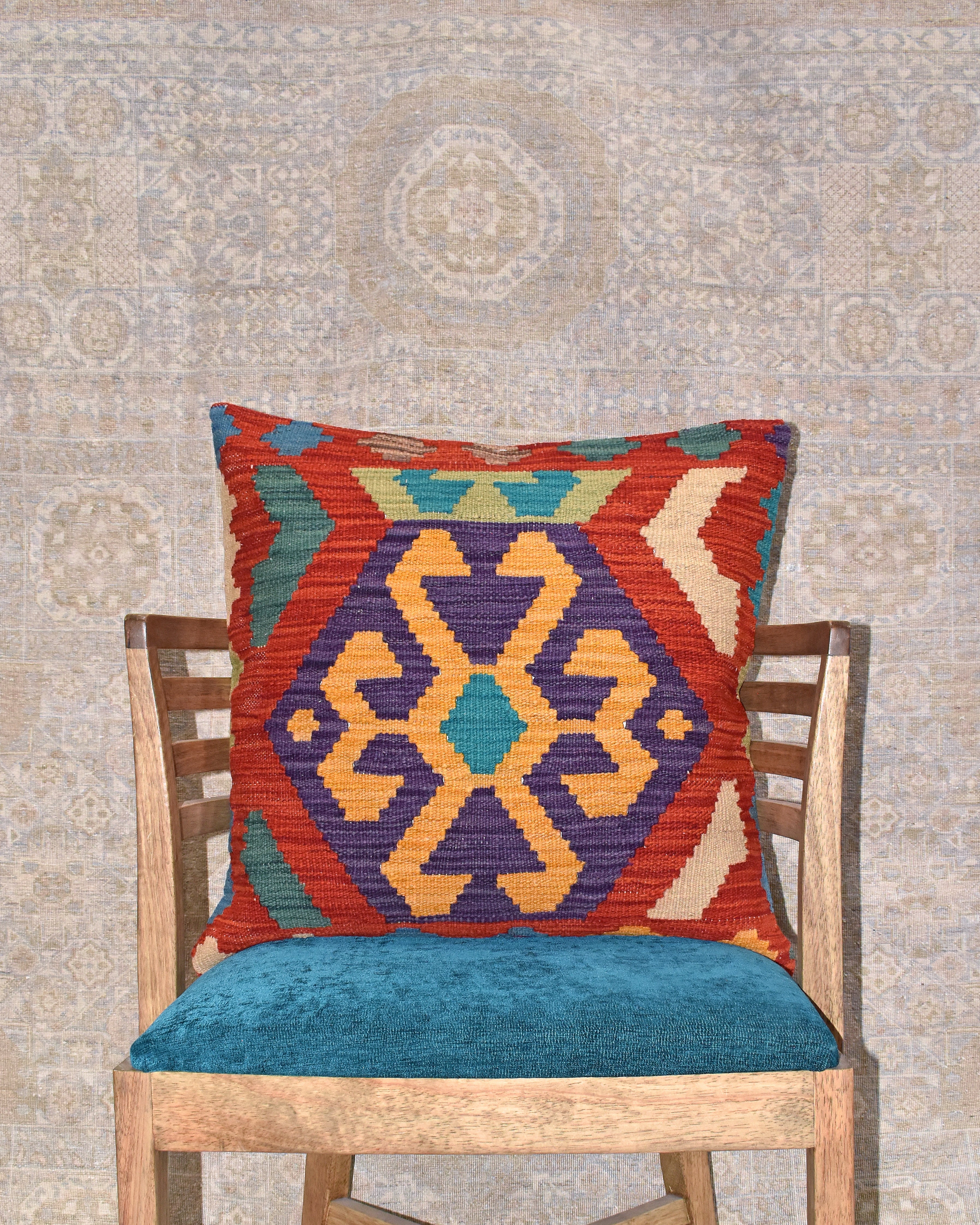 Afghan Maimana kilim cushions feature traditional flat-weave construction with bold geometric patterns in bright and earthy tones.