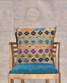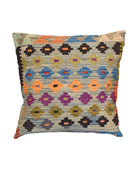 Afghan Maimana kilim cushions feature traditional flat-weave construction with bold geometric patterns in bright and earthy tones.