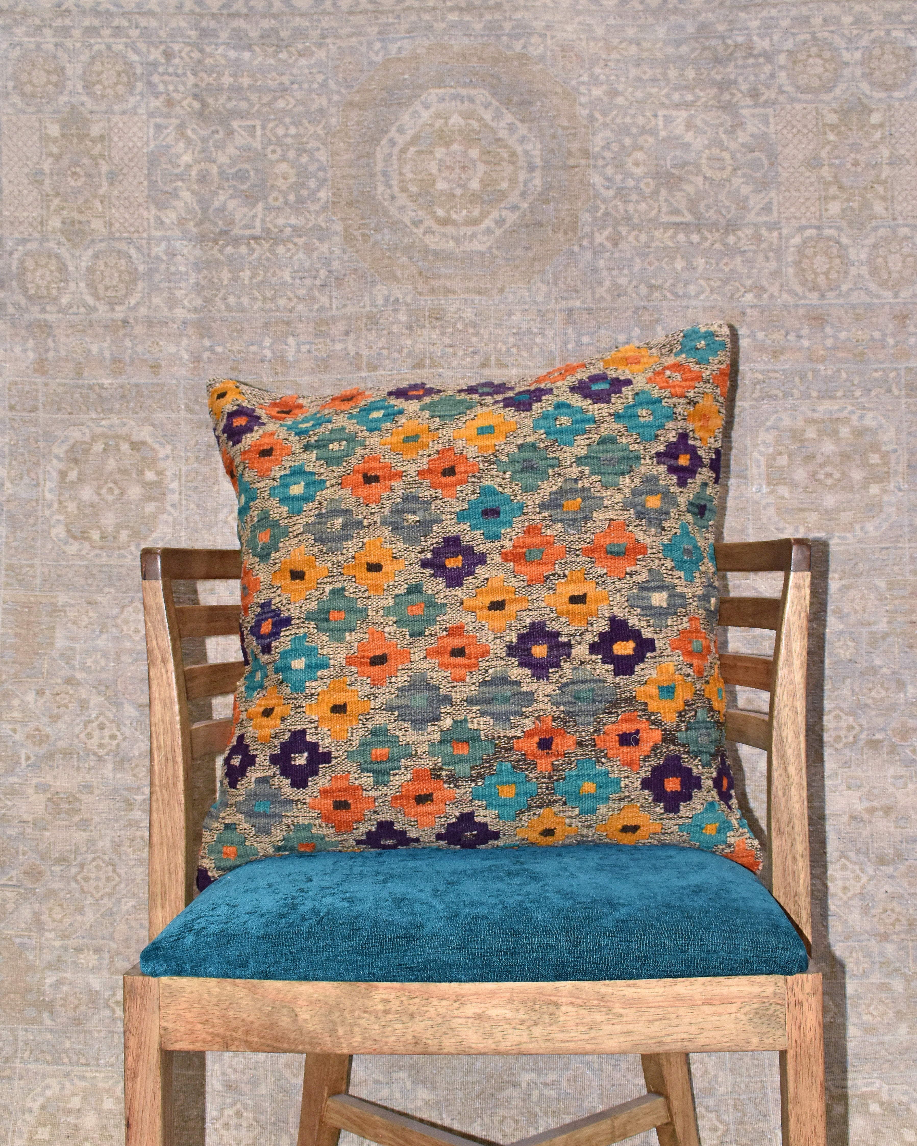 Afghan Maimana kilim cushions feature traditional flat-weave construction with bold geometric patterns in bright and earthy tones.