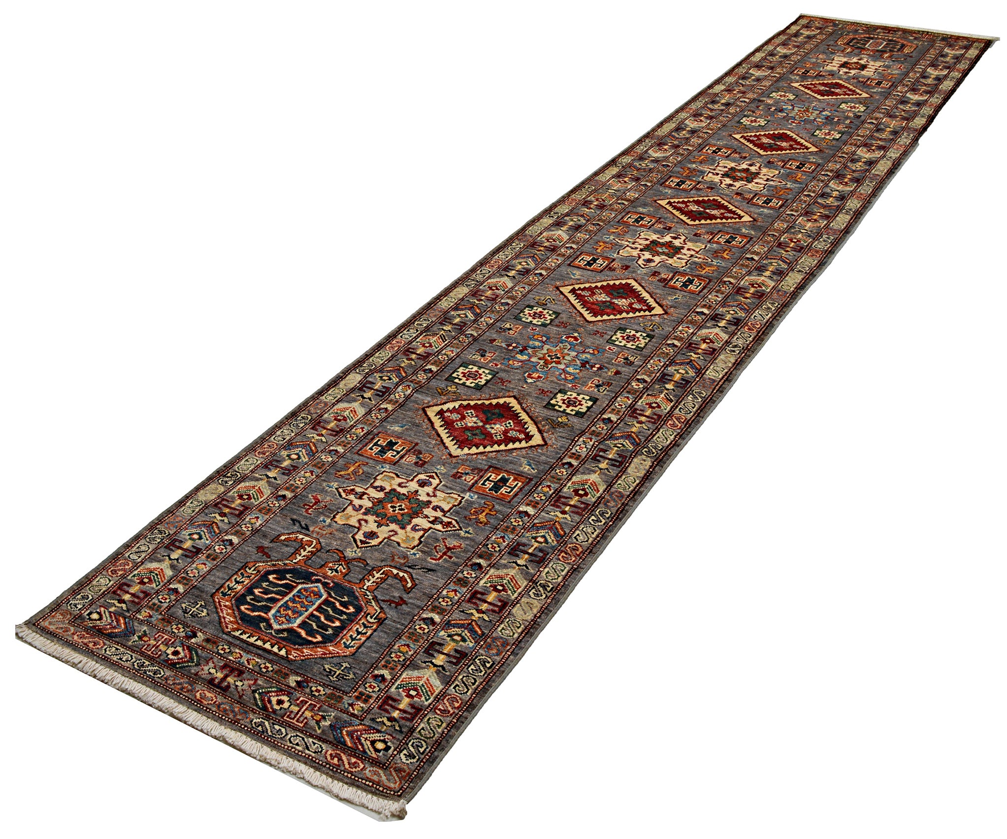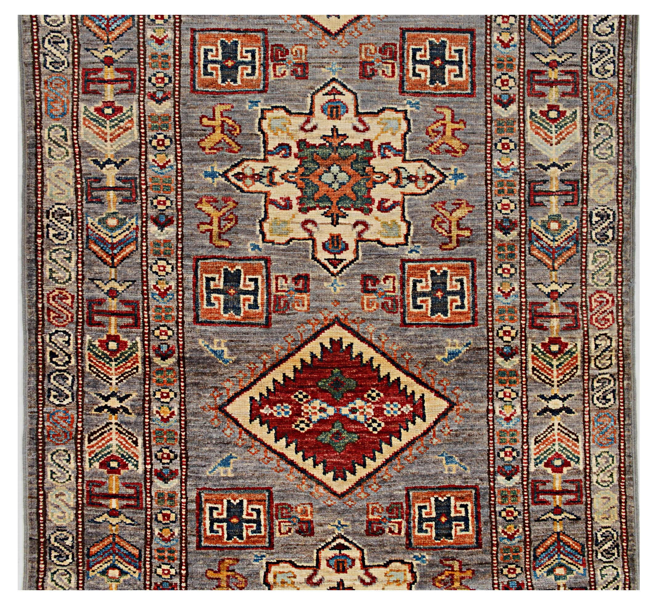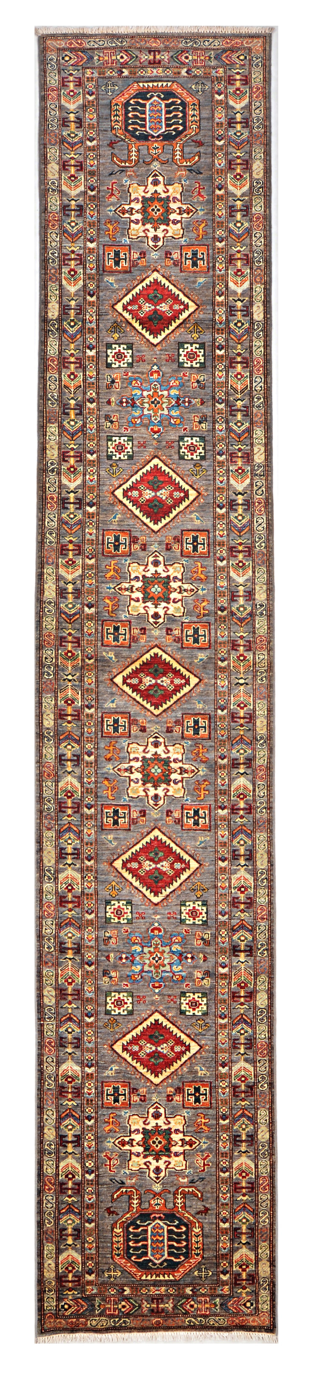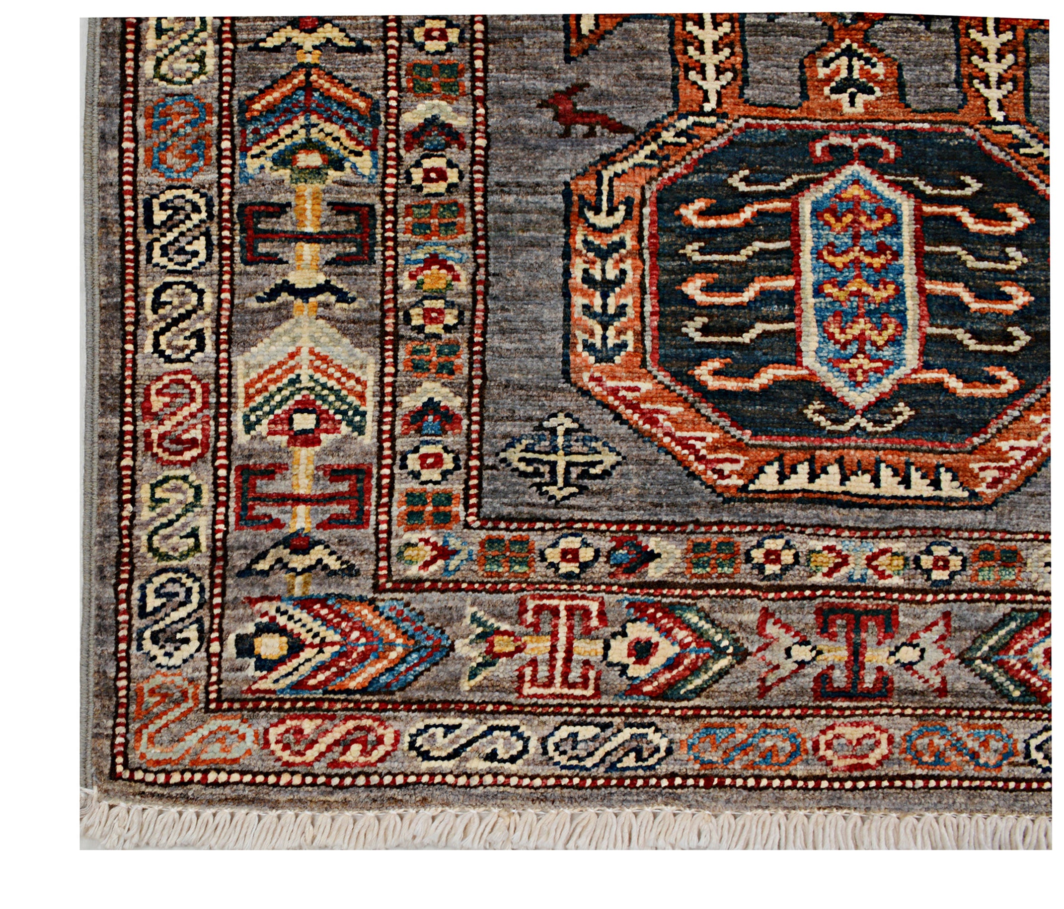 A Super Kazakh rug is a masterpiece of craftsmanship, woven by talented Hazara weavers who carry forward a rich tradition of artistry and skill. Known for their bold geometric patterns and striking colour combinations, these rugs draw inspiration from traditional Caucasian designs, featuring intricate motifs such as medallions, rosettes, and tribal symbols that reflect centuries of cultural heritage. Handwoven from high-quality wool with a dense weave, Super Kazakh rugs are not only visually stunning but also exceptionally durable, perfect for high-traffic areas or as statement pieces in your home.