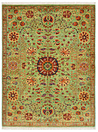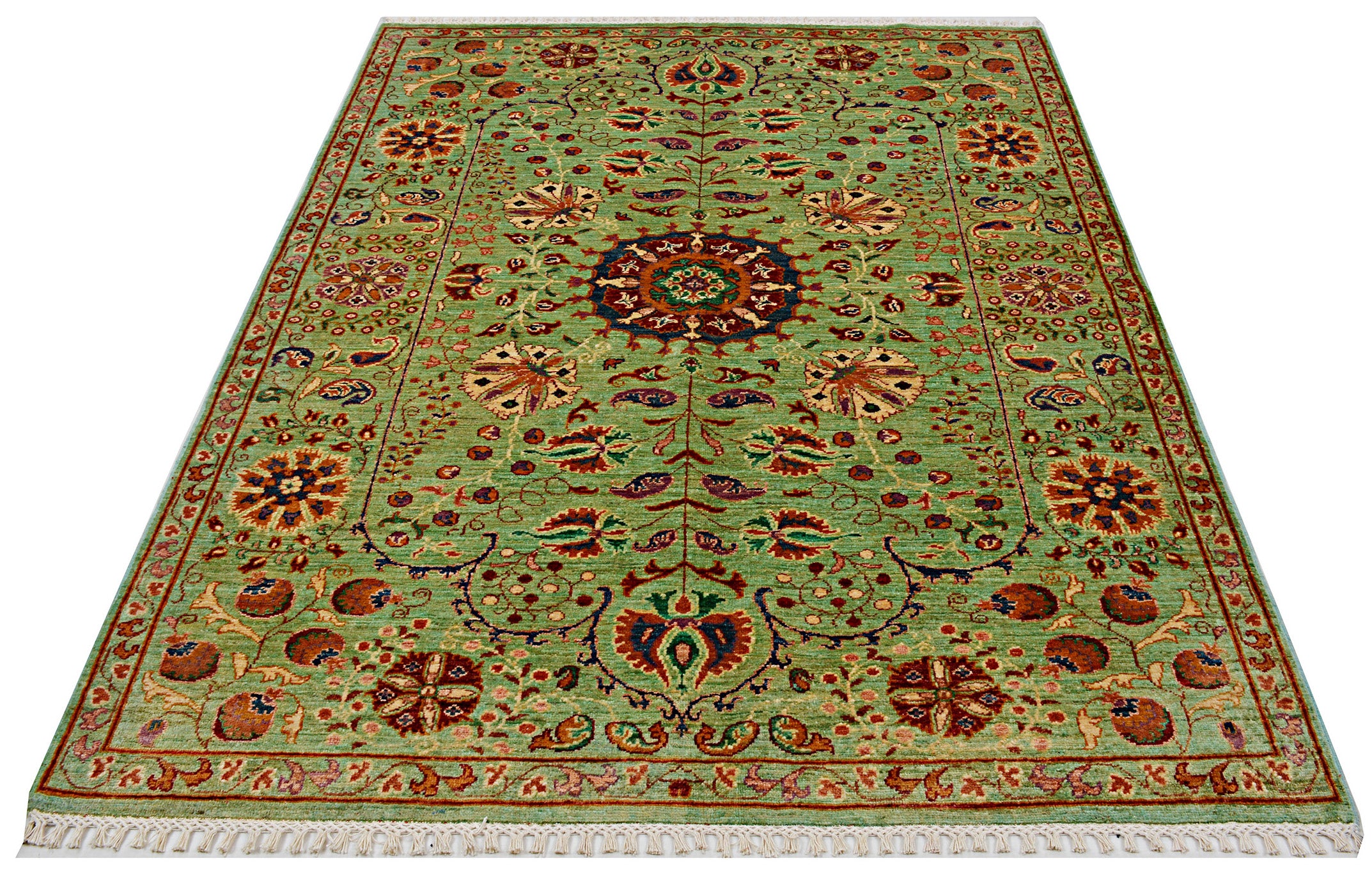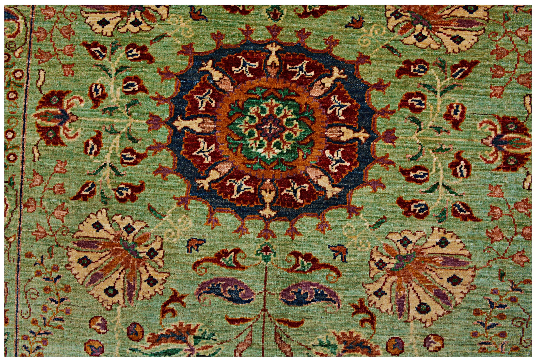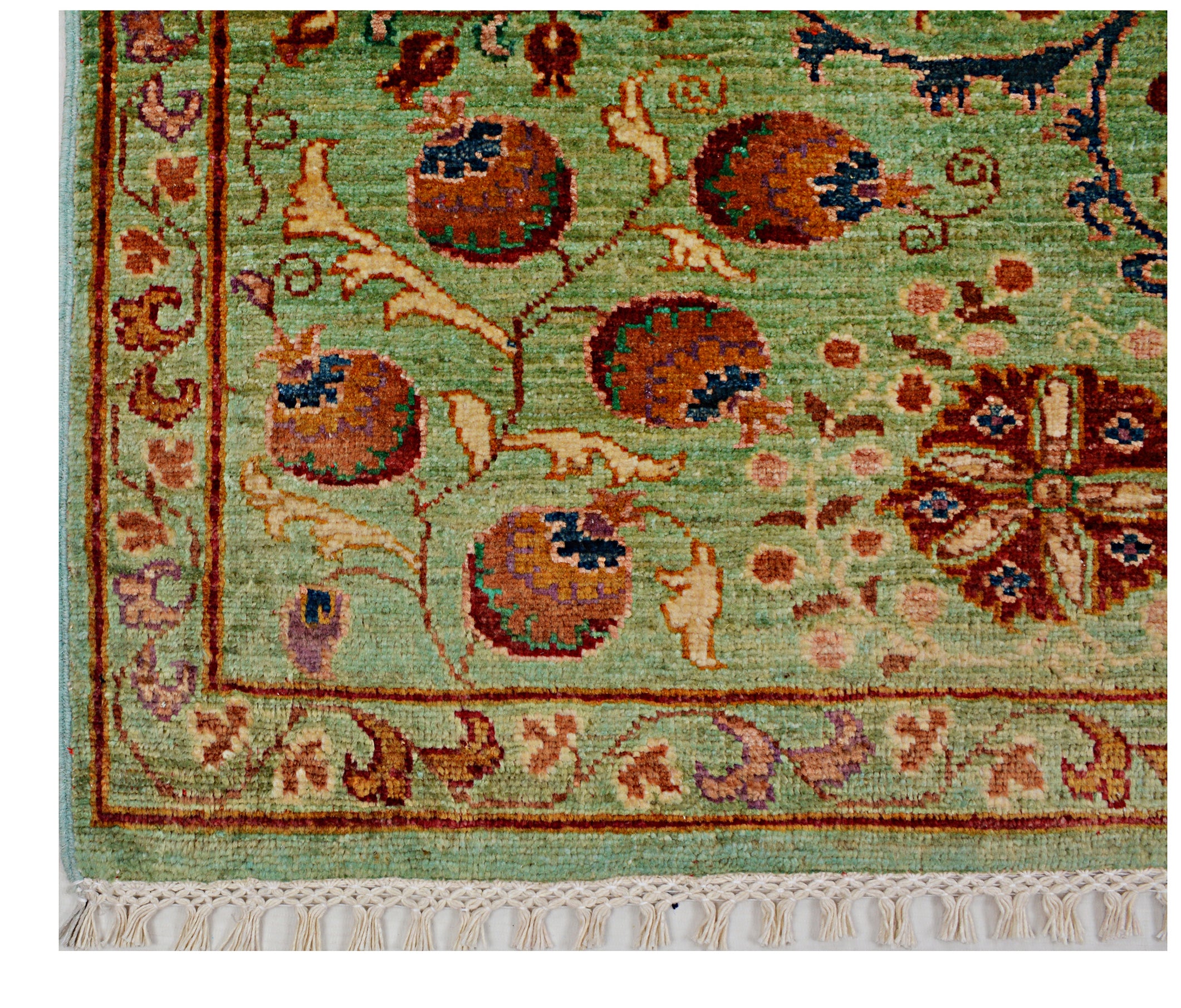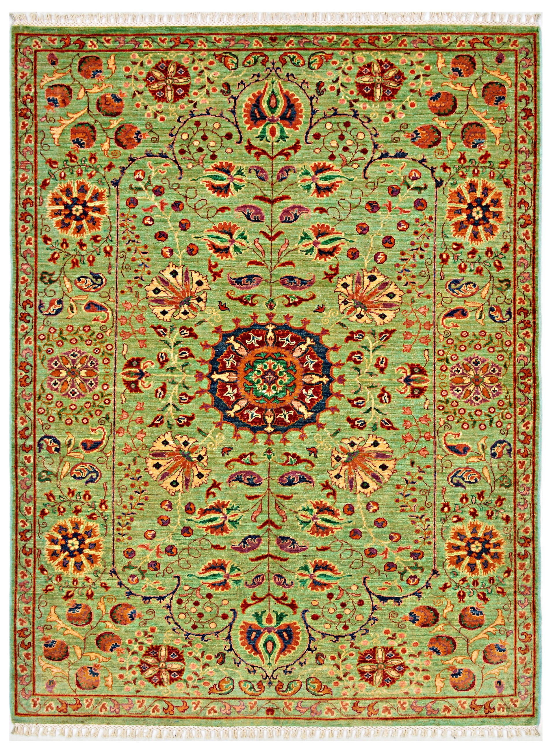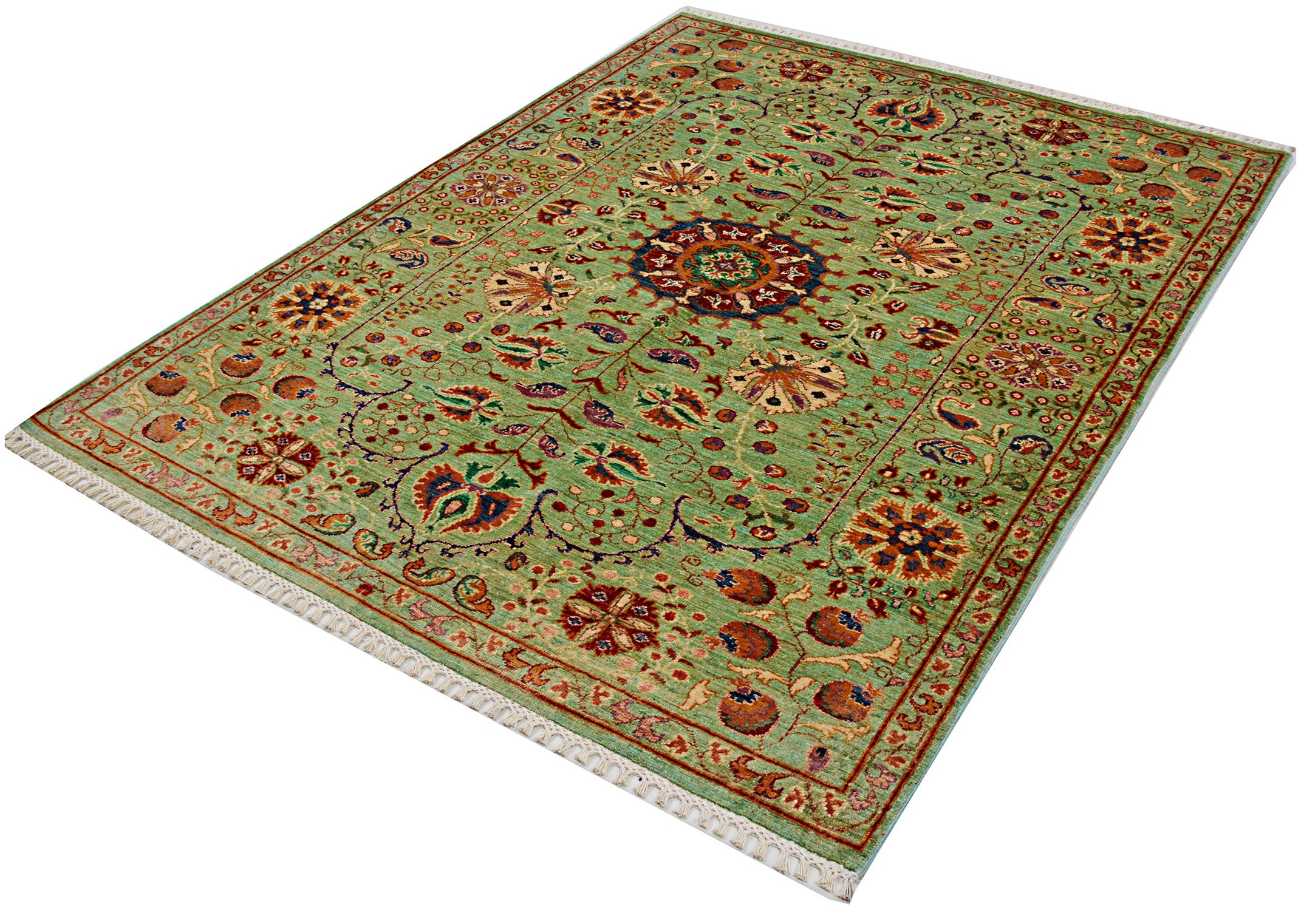 This rug has been woven with a tightly packed knot structure, giving it a fine, durable finish and allowing for greater detail in the design. The wool is hand-spun using traditional methods and selected for its quality, softness, and natural strength. It holds onto its lanolin, which gives the rug a silky sheen and that smooth, velvety feel underfoot.