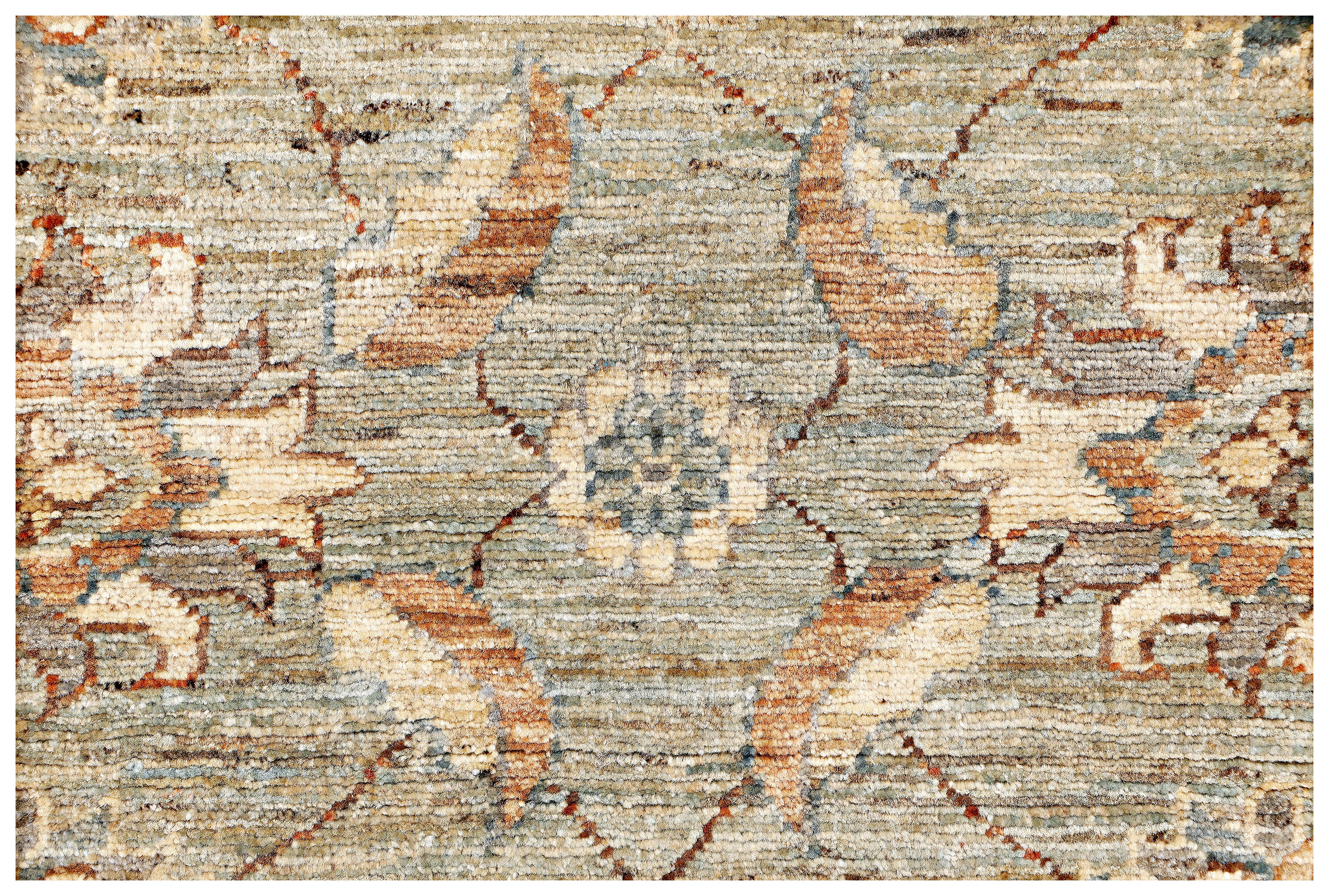This rug has been woven with a tightly packed knot structure, giving it a fine, durable finish and allowing for greater detail in the design. The wool is hand-spun using traditional methods and selected for its quality, softness, and natural strength. It holds onto its lanolin, which gives the rug a silky sheen and that smooth, velvety feel underfoot.