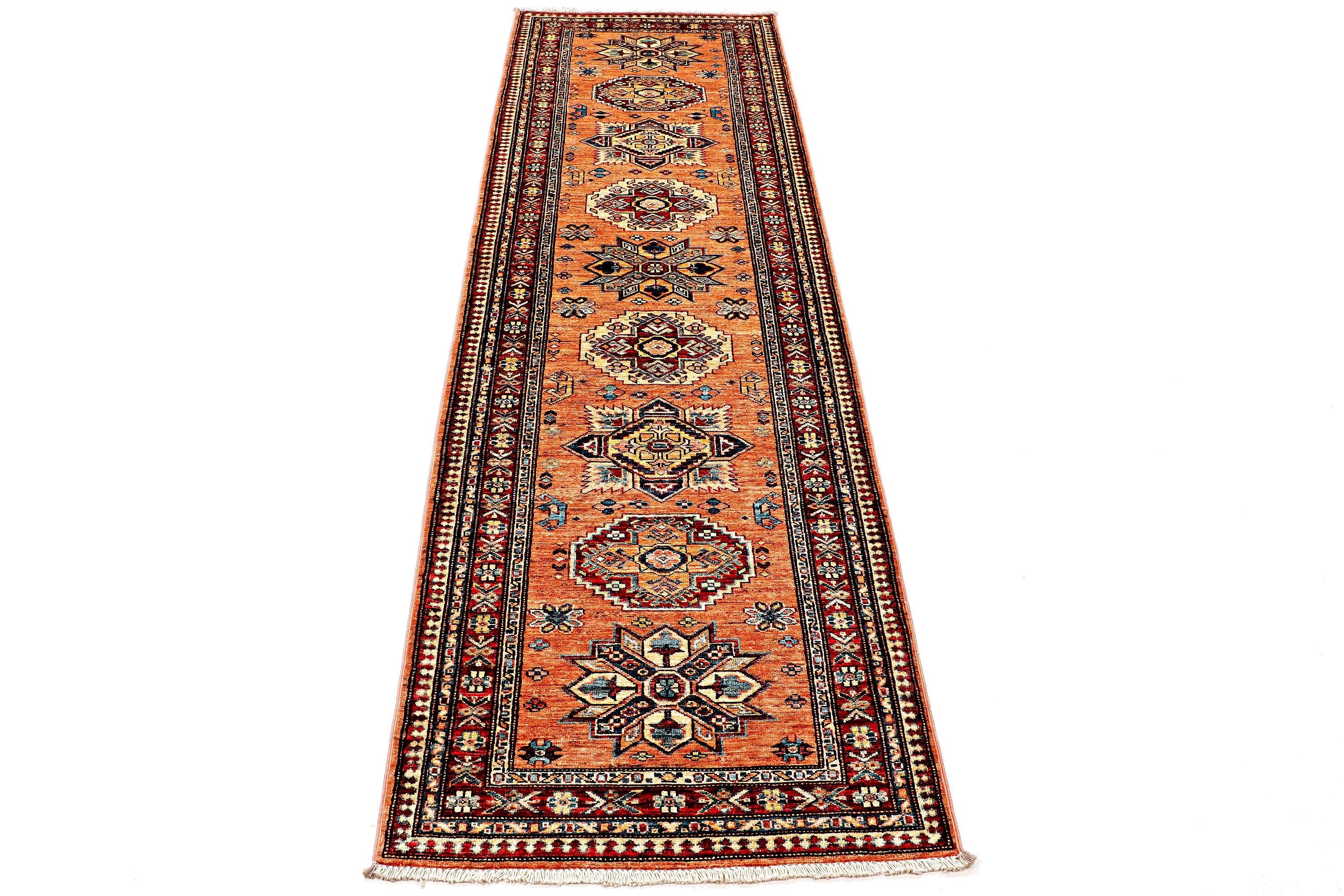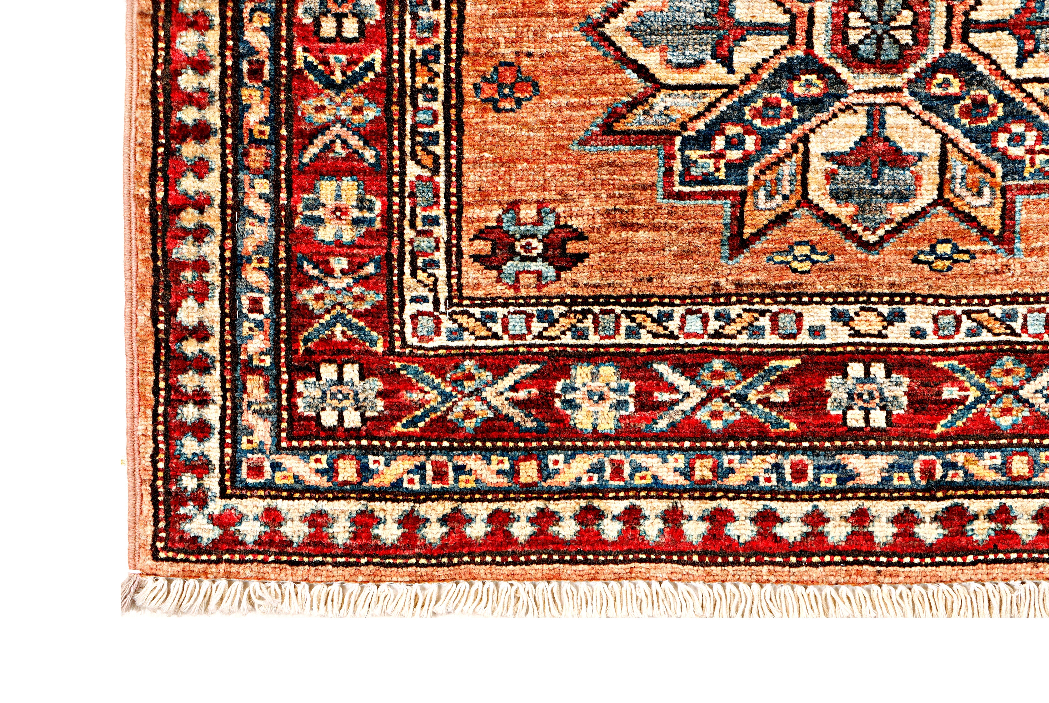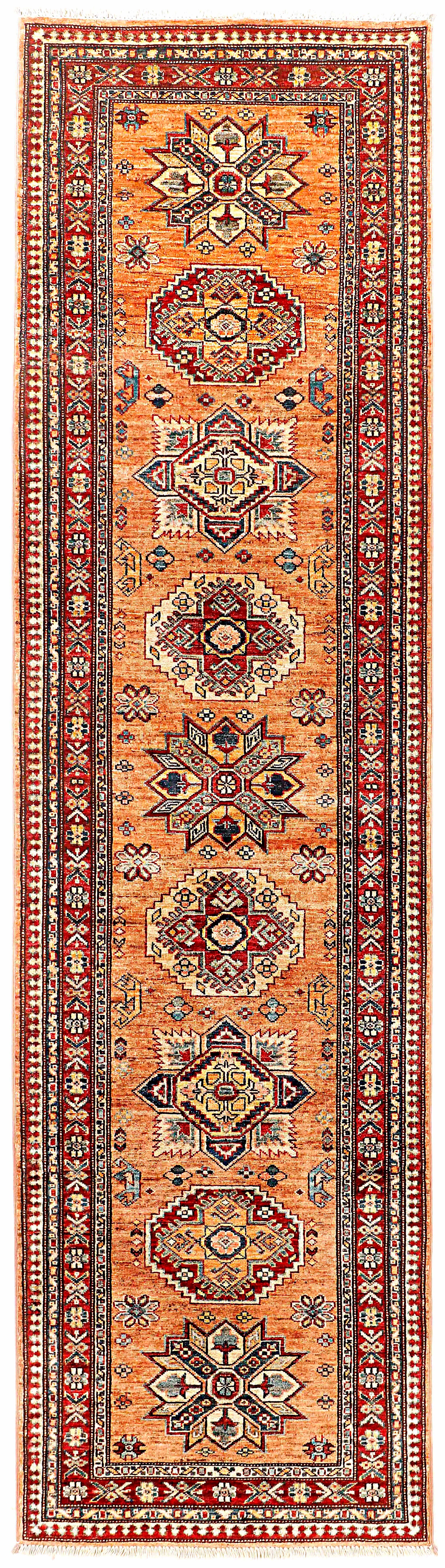 Super Kazakh rugs are hand-knotted in Afghanistan by weavers who've inherited techniques that trace back centuries to the Caucasus mountains. The "super" refers to the higher knot density that allows for sharper, more intricate designs than standard Kazakh rugs.