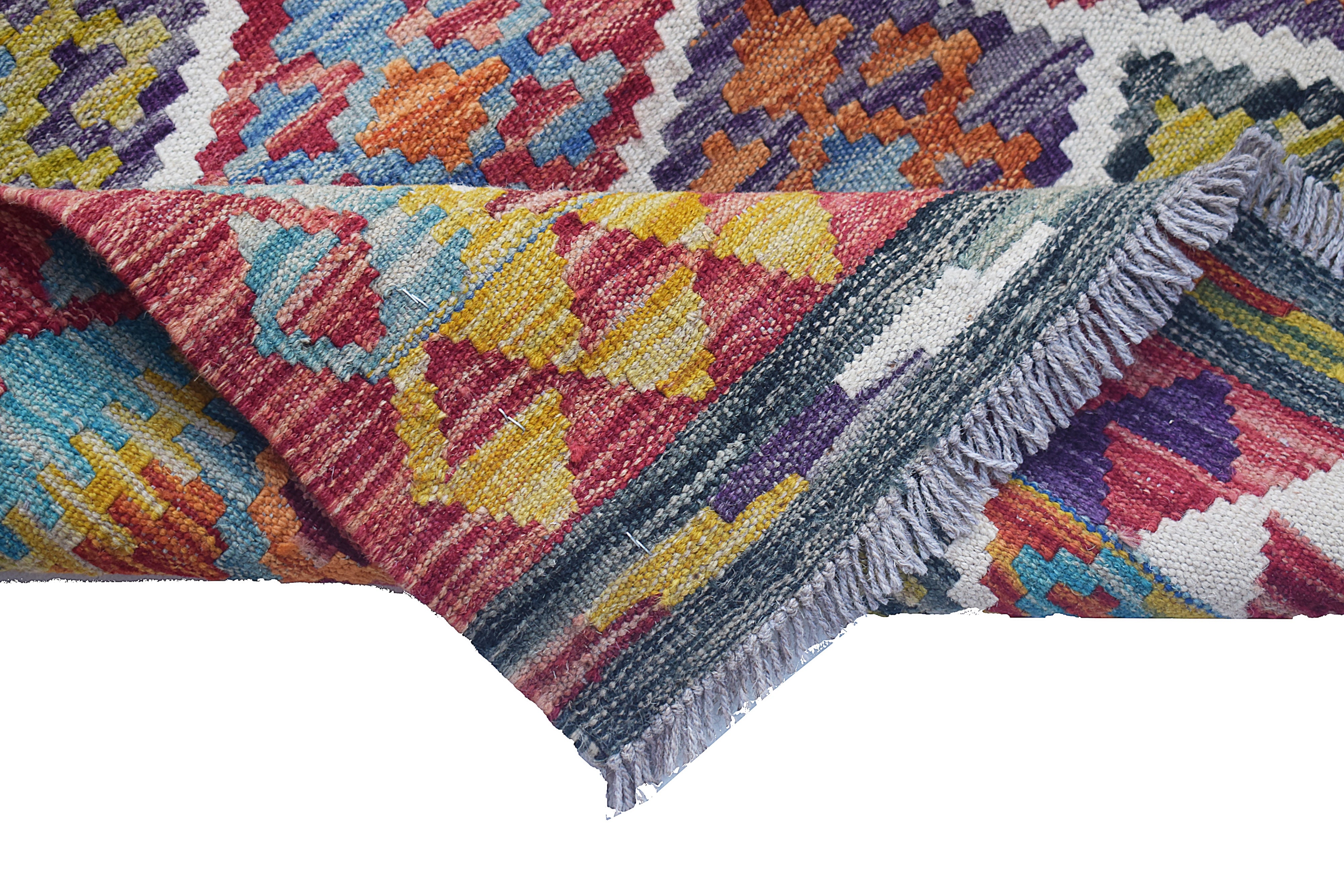 Maimana kilims are a proud product of the Frayab province in northern Afghanistan, with their name derived from the historic city of Maimana, a key trading hub along the ancient Silk Road. These kilims reflect centuries-old weaving traditions passed down through generations of tribal artisans. Their distinctive geometric patterns and bold designs are influenced by the nomadic lifestyle of the region, where practicality meets artistry in textile creation. The Maimana region is known for its semi-arid landscapes, where the weavers source high-quality wool from local sheep, spin it by hand, and dye it using natural substances, often inspired by the earthy hues of their surroundings. These kilims are flatwoven without a pile, a technique that makes them lightweight, reversible, and perfect for diverse applications, from floor coverings to wall hangings.