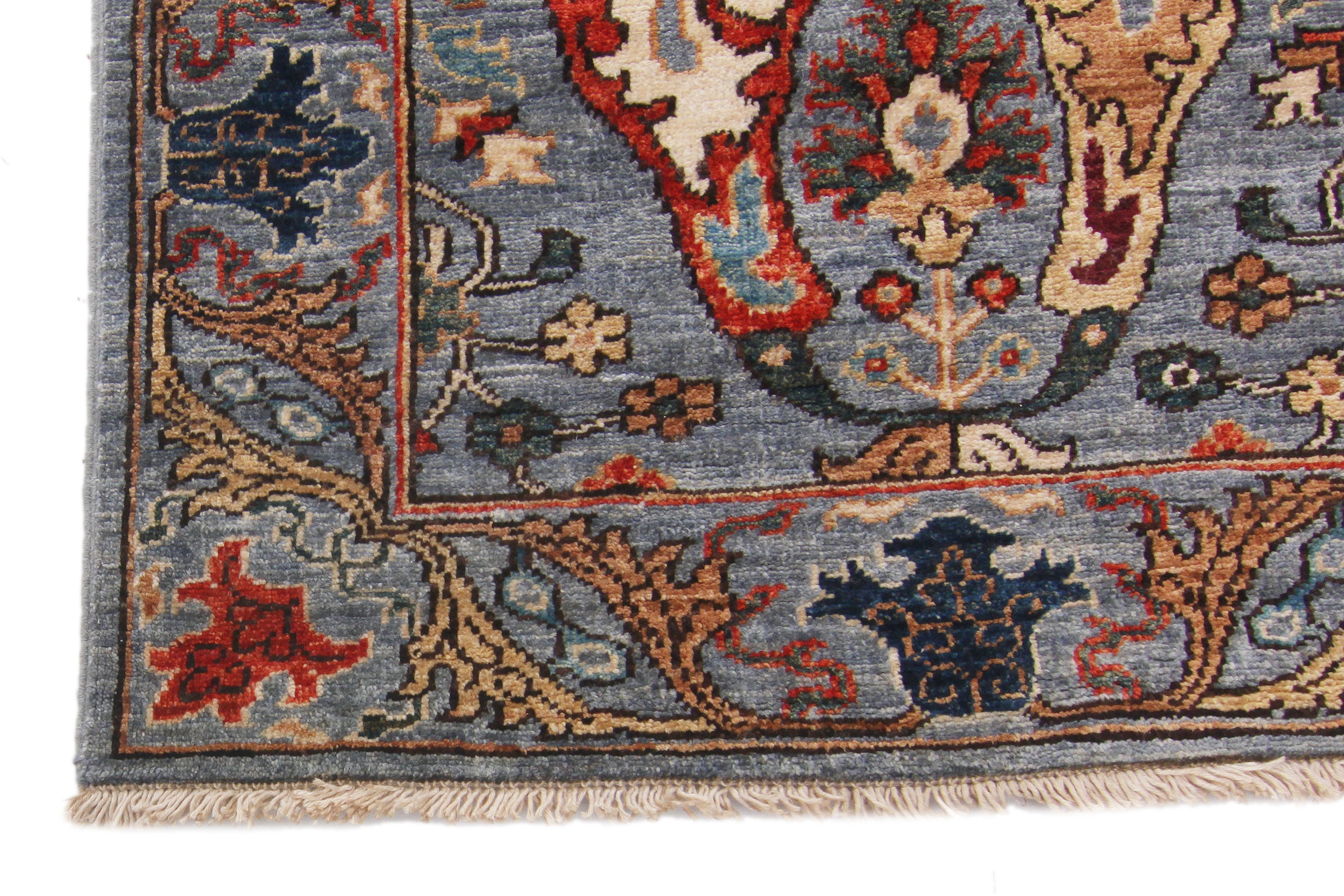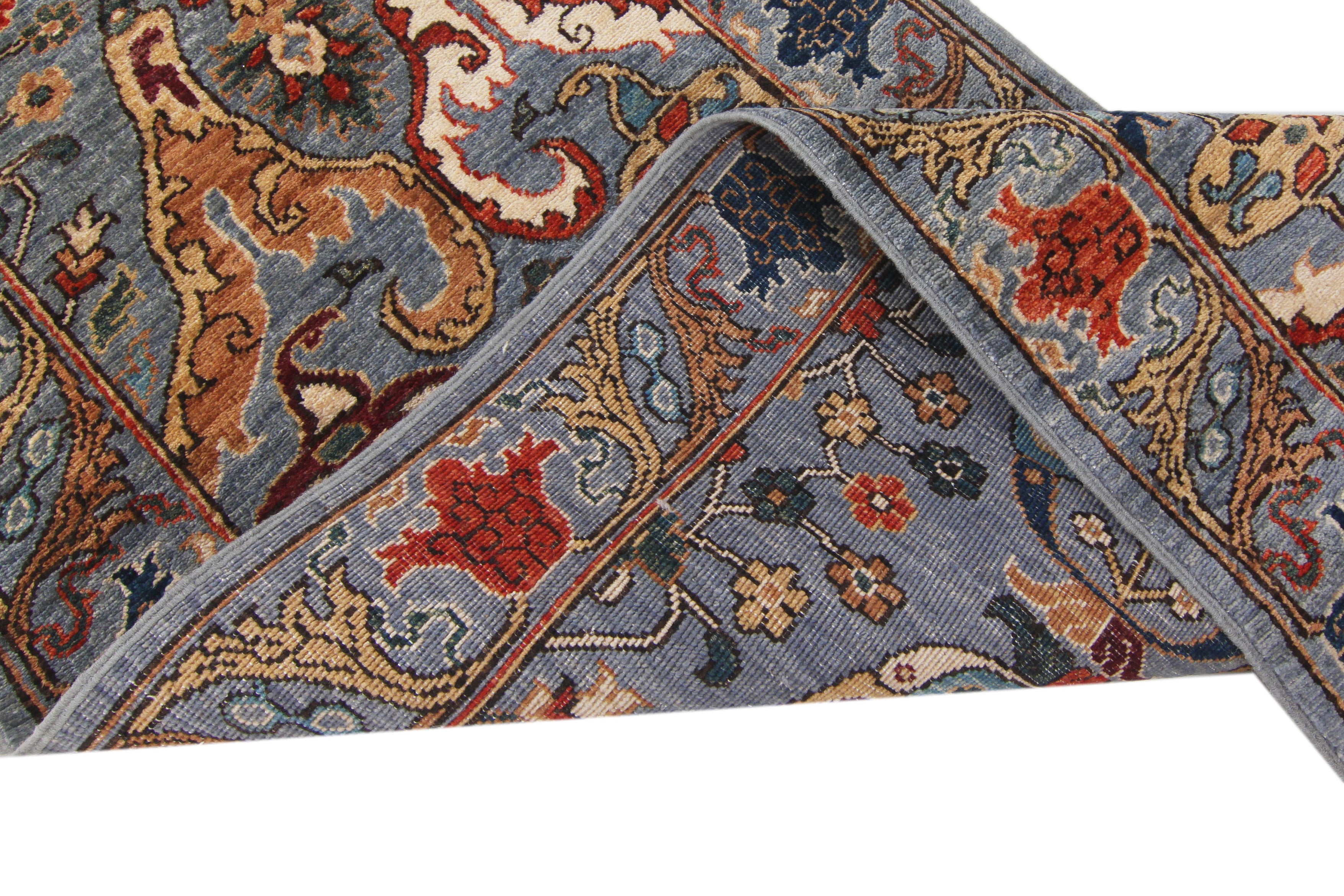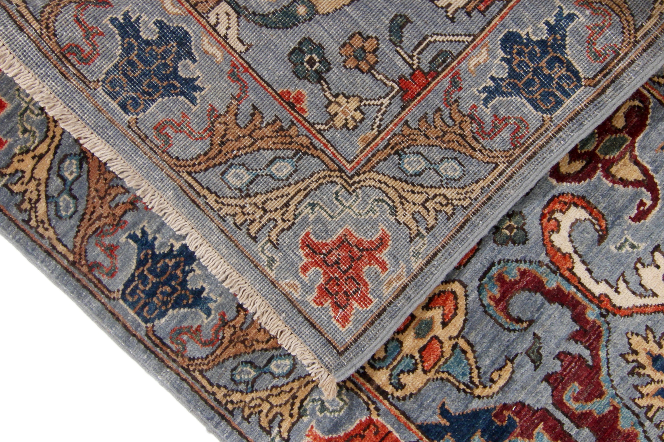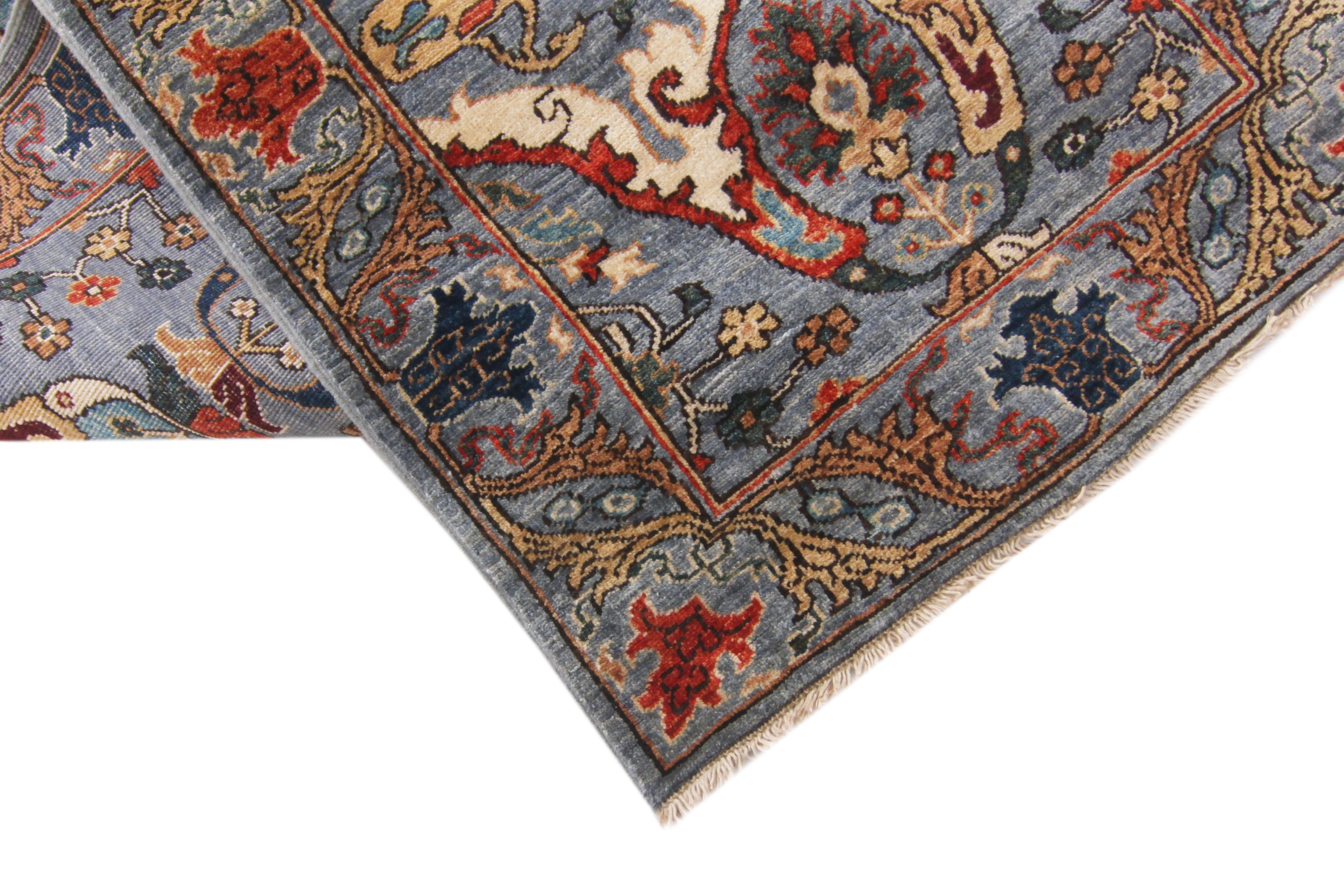 This rug has been woven with a tightly packed knot structure, giving it a fine, durable finish and allowing for greater detail in the design. The wool is hand-spun using traditional methods and selected for its quality, softness, and natural strength. It holds onto its lanolin, which gives the rug a silky sheen and that smooth, velvety feel underfoot.