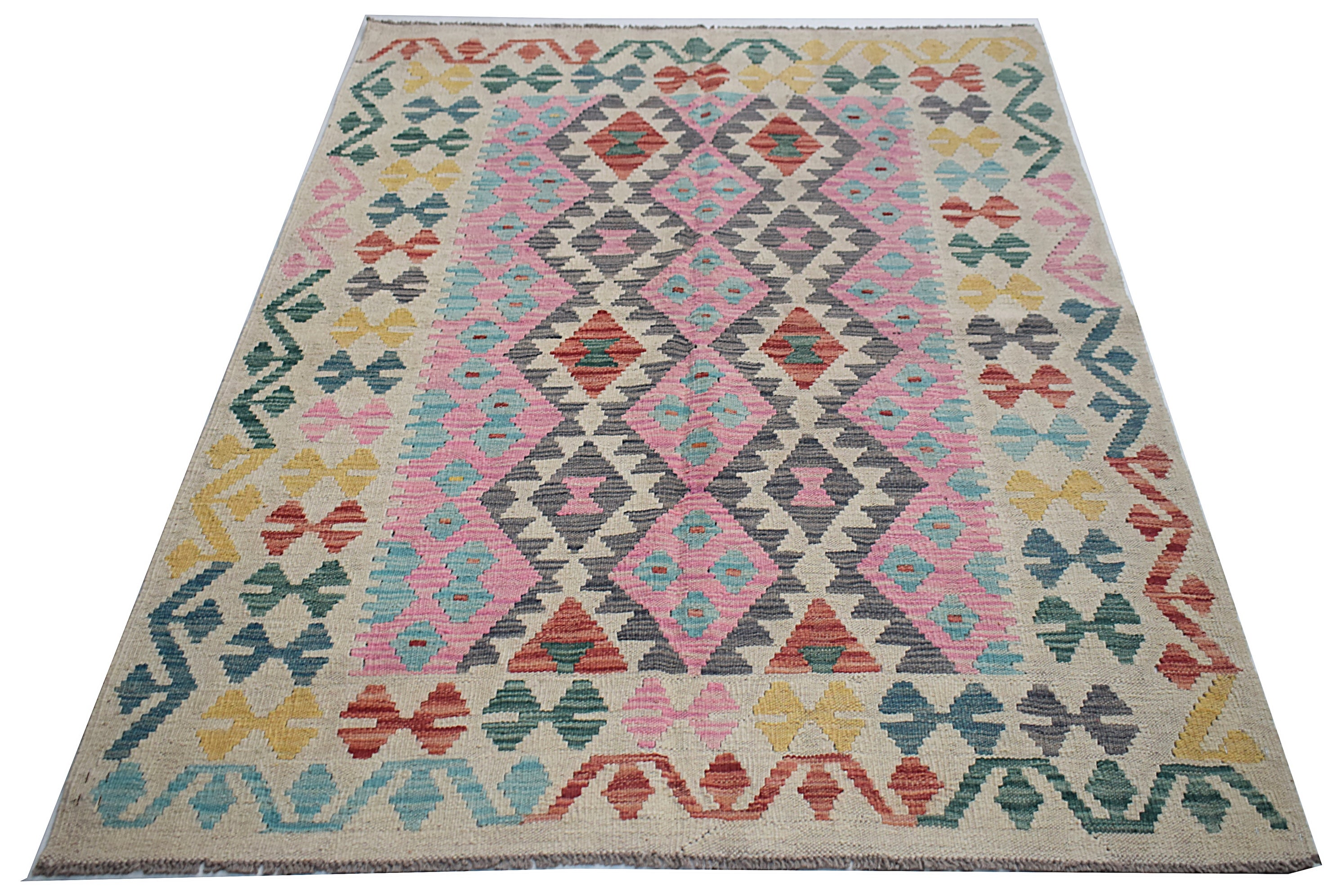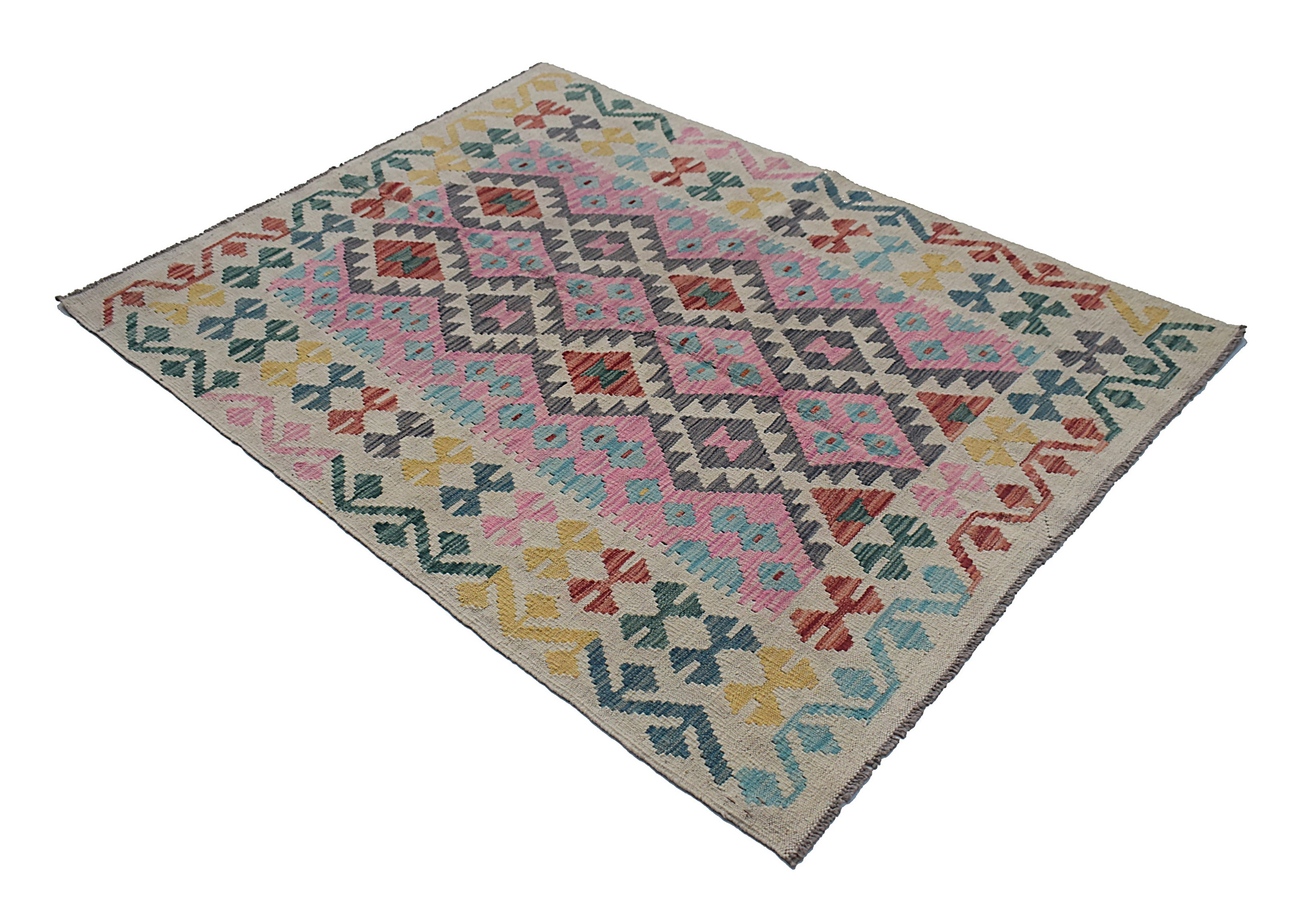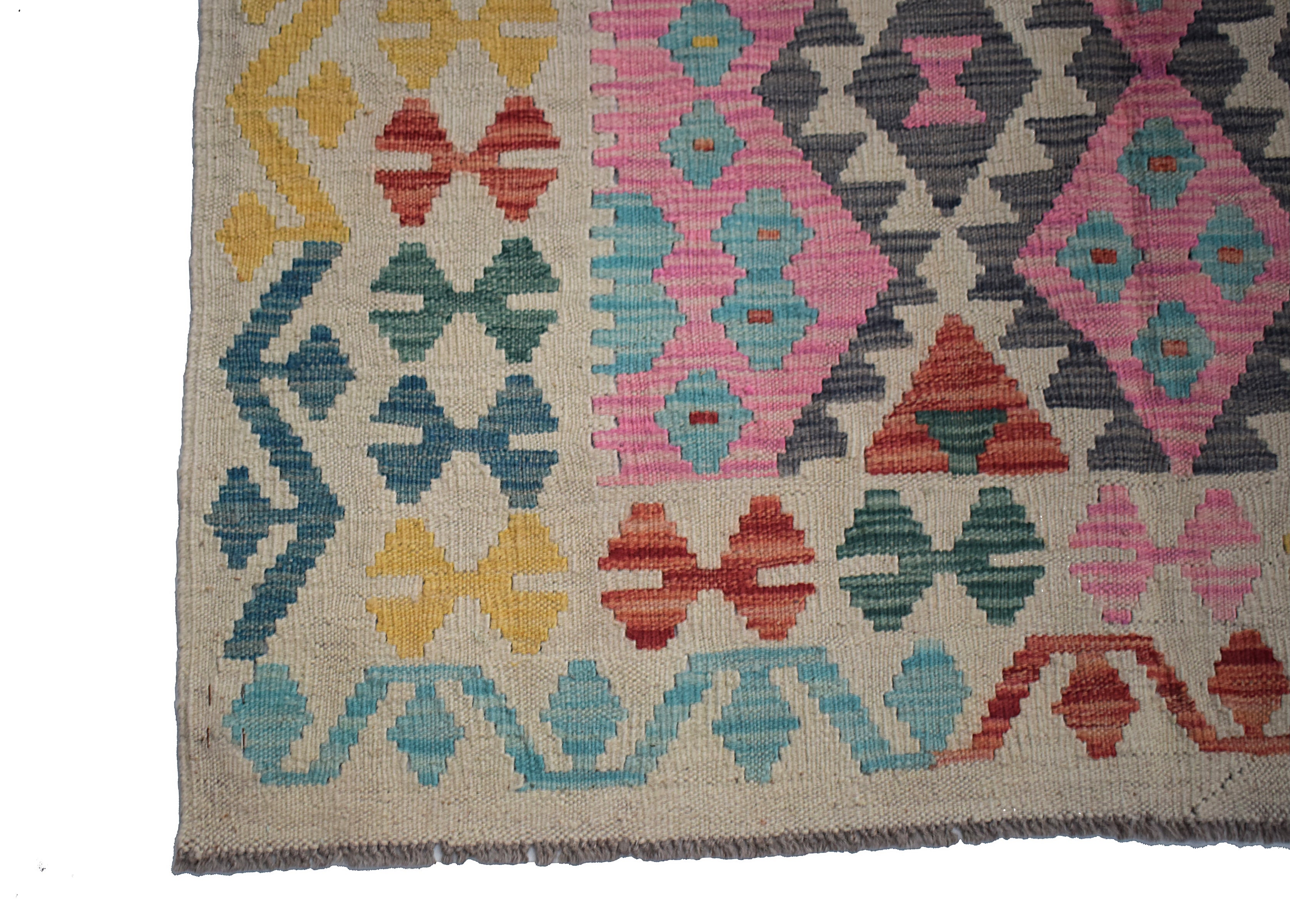 Maimana kilims are a proud product of the Frayab province in northern Afghanistan, with their name derived from the historic city of Maimana, a key trading hub along the ancient Silk Road. These kilims reflect centuries-old weaving traditions passed down through generations of tribal artisans. Their distinctive geometric patterns and bold designs are influenced by the nomadic lifestyle of the region, where practicality meets artistry in textile creation. The Maimana region is known for its semi-arid landscapes, where the weavers source high-quality wool from local sheep, spin it by hand, and dye it using natural substances, often inspired by the earthy hues of their surroundings. These kilims are flatwoven without a pile, a technique that makes them lightweight, reversible, and perfect for diverse applications, from floor coverings to wall hangings.
