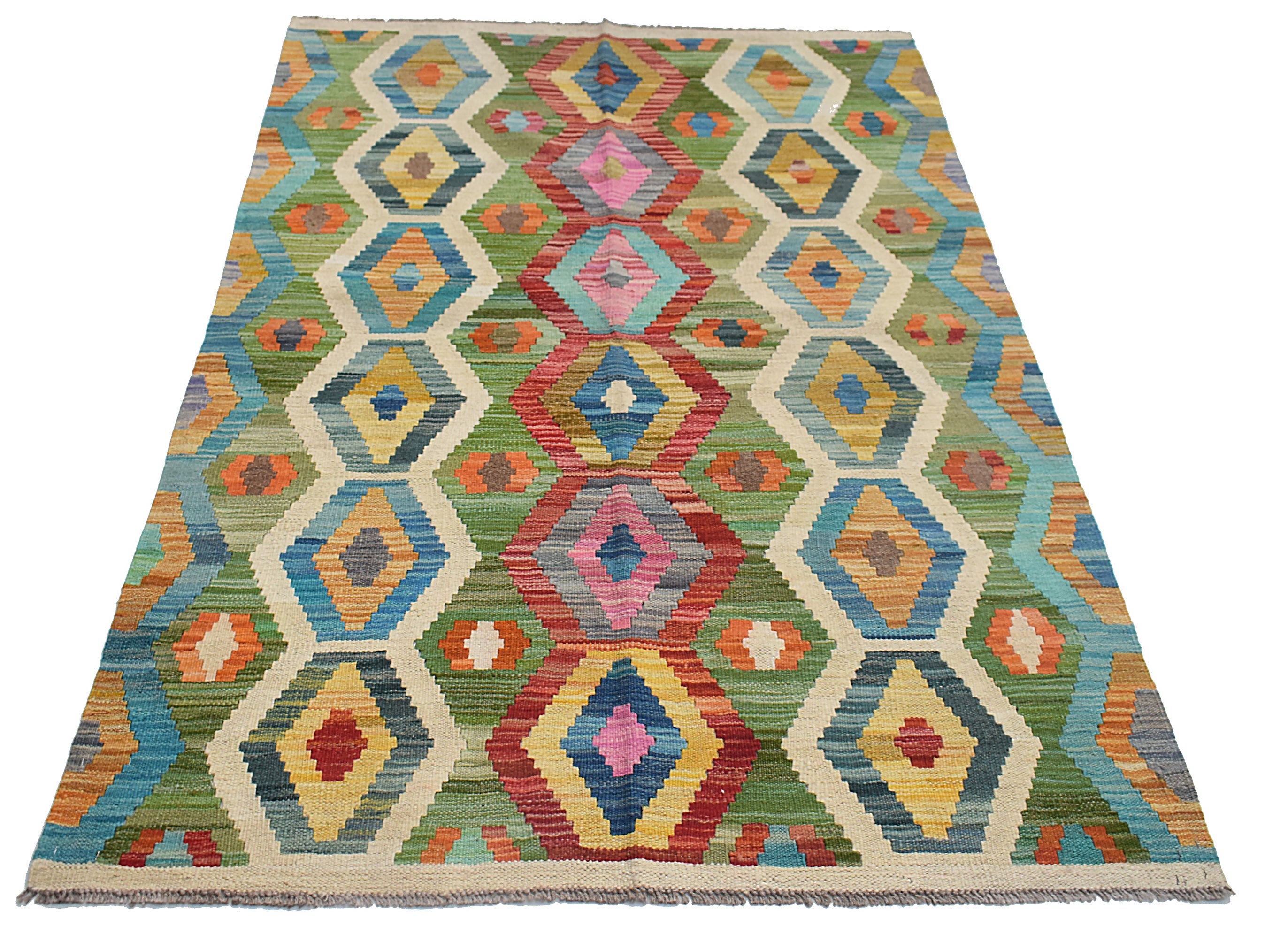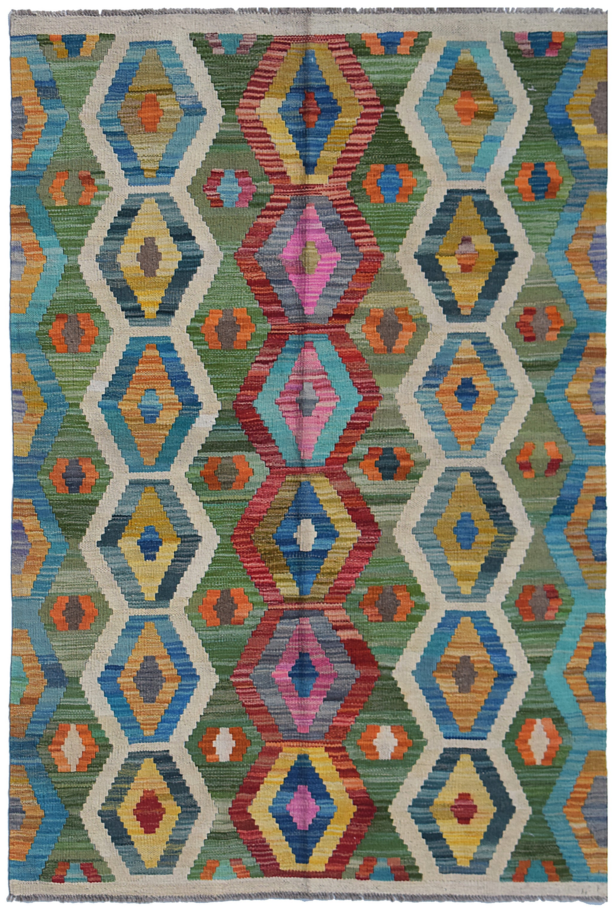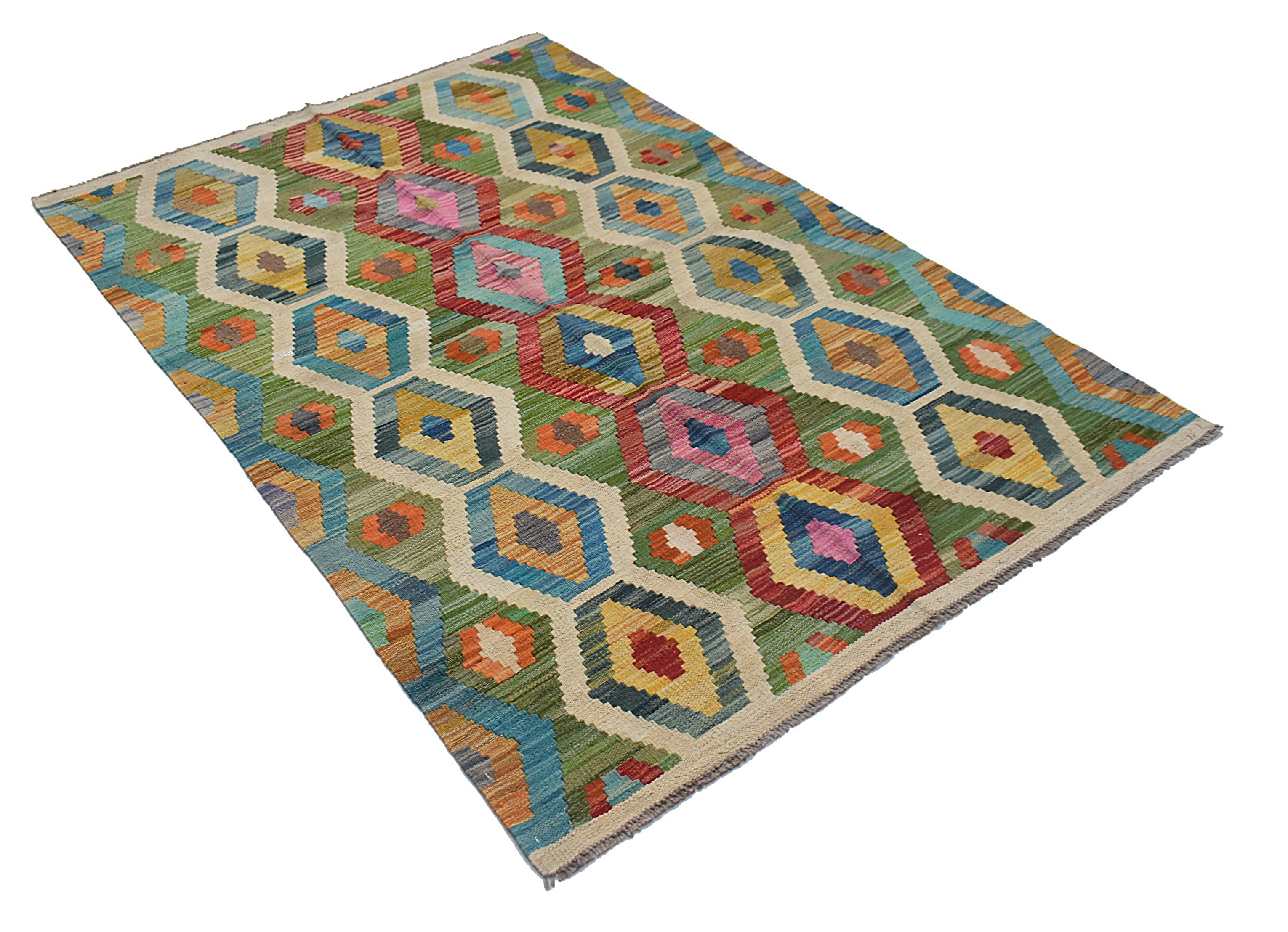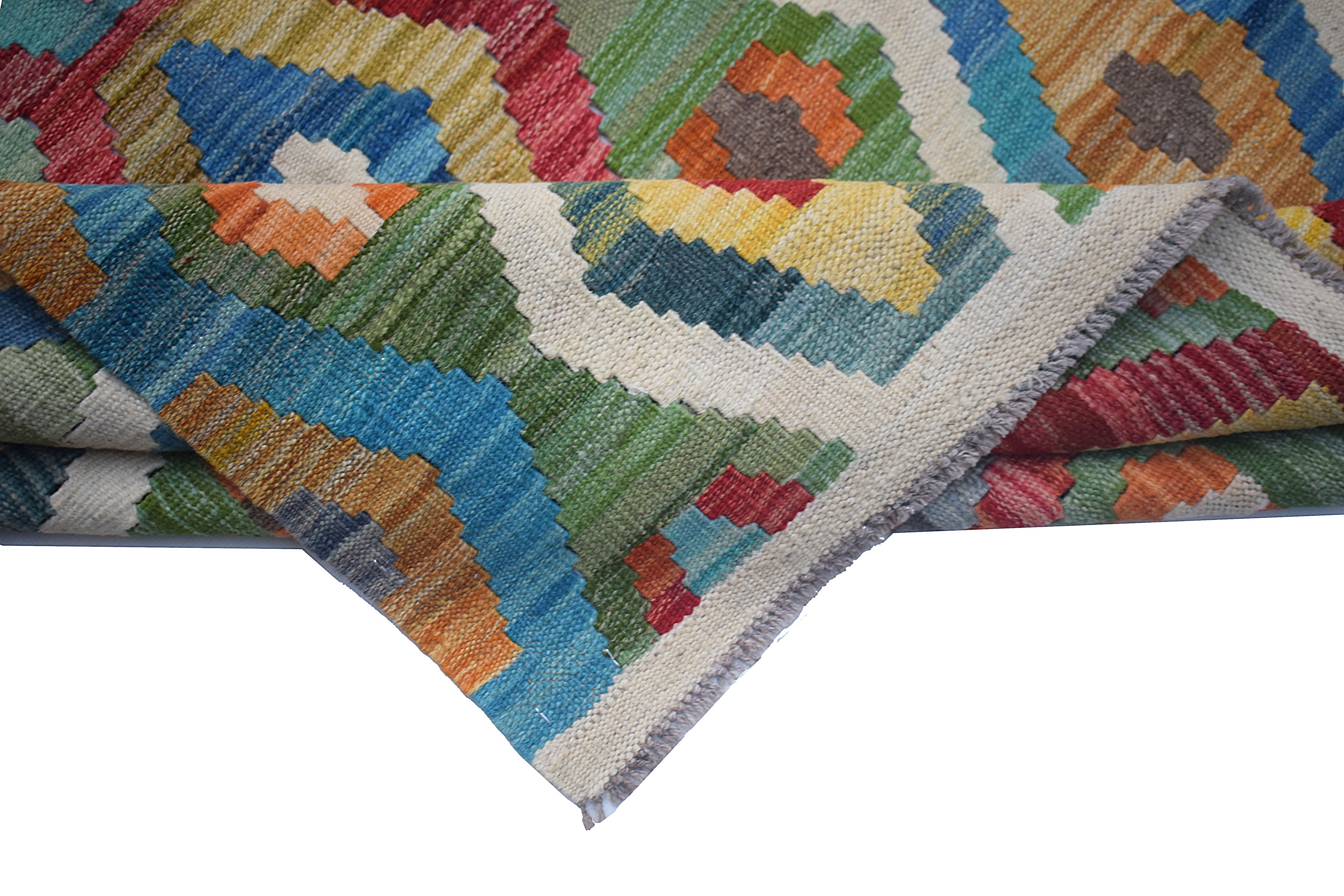 Maimana kilims are a proud product of the Frayab province in northern Afghanistan, with their name derived from the historic city of Maimana, a key trading hub along the ancient Silk Road. These kilims reflect centuries-old weaving traditions passed down through generations of tribal artisans. Their distinctive geometric patterns and bold designs are influenced by the nomadic lifestyle of the region, where practicality meets artistry in textile creation. The Maimana region is known for its semi-arid landscapes, where the weavers source high-quality wool from local sheep, spin it by hand, and dye it using natural substances, often inspired by the earthy hues of their surroundings. These kilims are flatwoven without a pile, a technique that makes them lightweight, reversible, and perfect for diverse applications, from floor coverings to wall hangings.