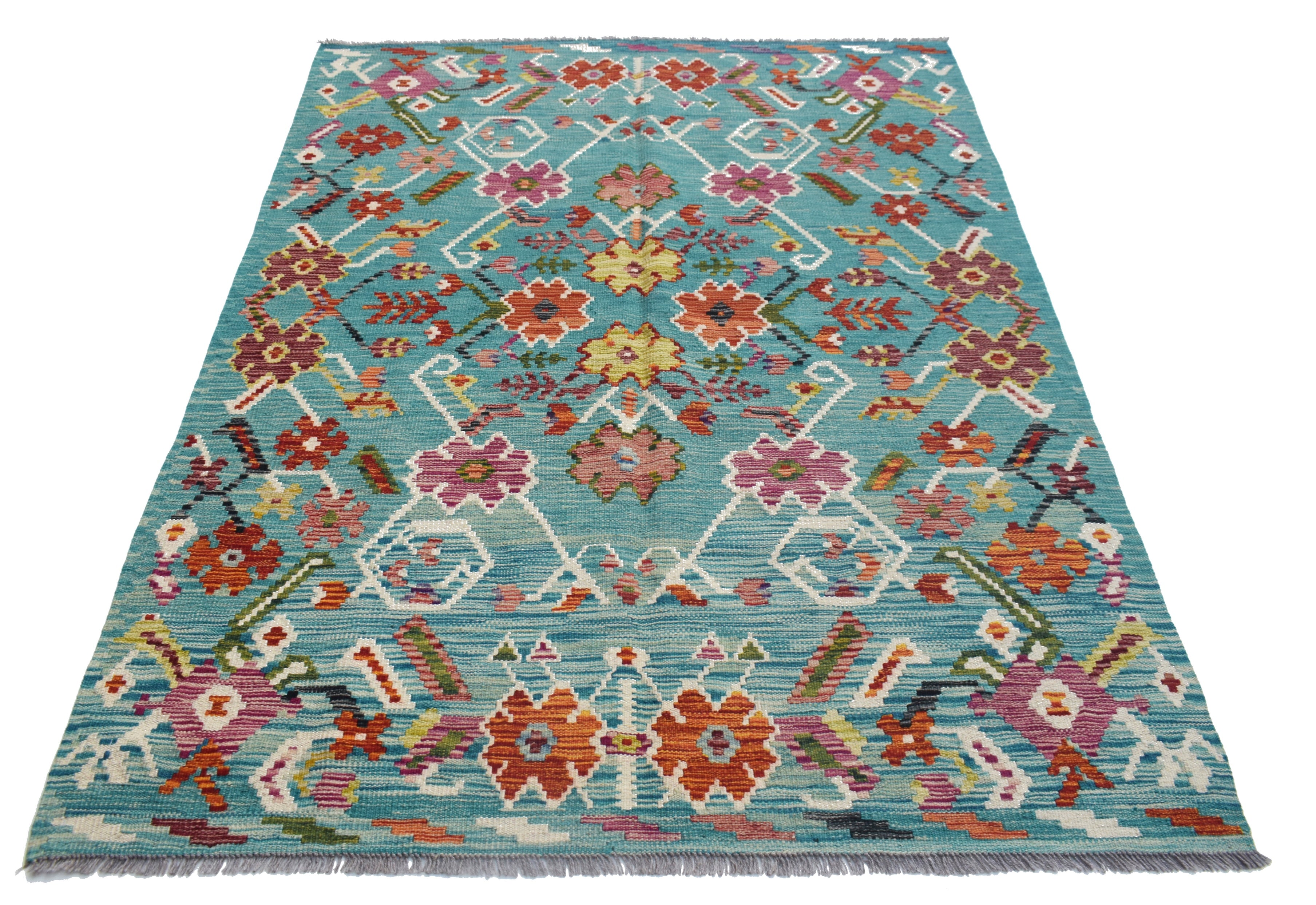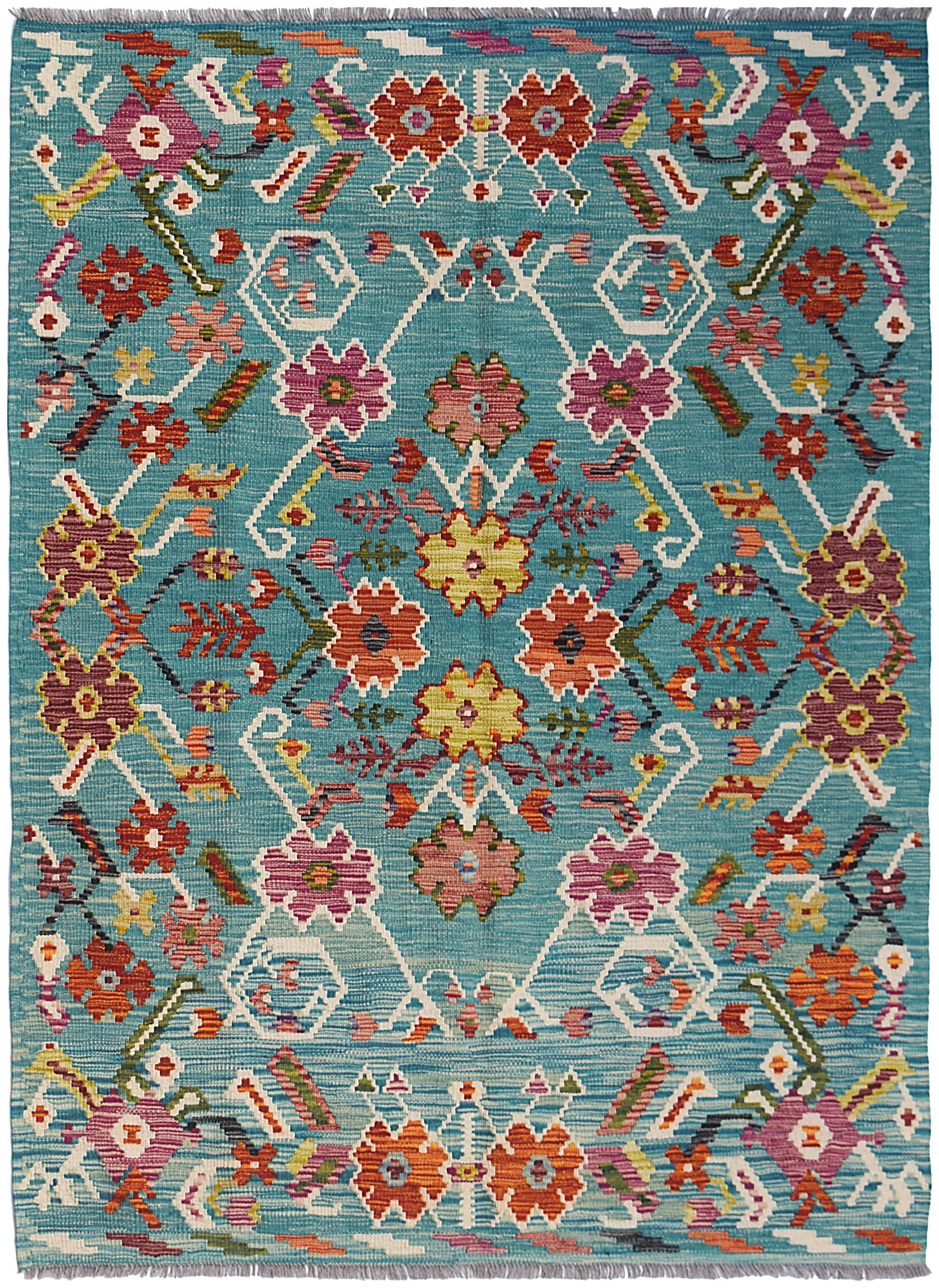 Maimana kilims are a proud product of the Frayab province in northern Afghanistan, with their name derived from the historic city of Maimana, a key trading hub along the ancient Silk Road. These kilims reflect centuries-old weaving traditions passed down through generations of tribal artisans. Their distinctive geometric patterns and bold designs are influenced by the nomadic lifestyle of the region, where practicality meets artistry in textile creation. The Maimana region is known for its semi-arid landscapes, where the weavers source high-quality wool from local sheep, spin it by hand, and dye it using natural substances, often inspired by the earthy hues of their surroundings. These kilims are flatwoven without a pile, a technique that makes them lightweight, reversible, and perfect for diverse applications, from floor coverings to wall hangings.
