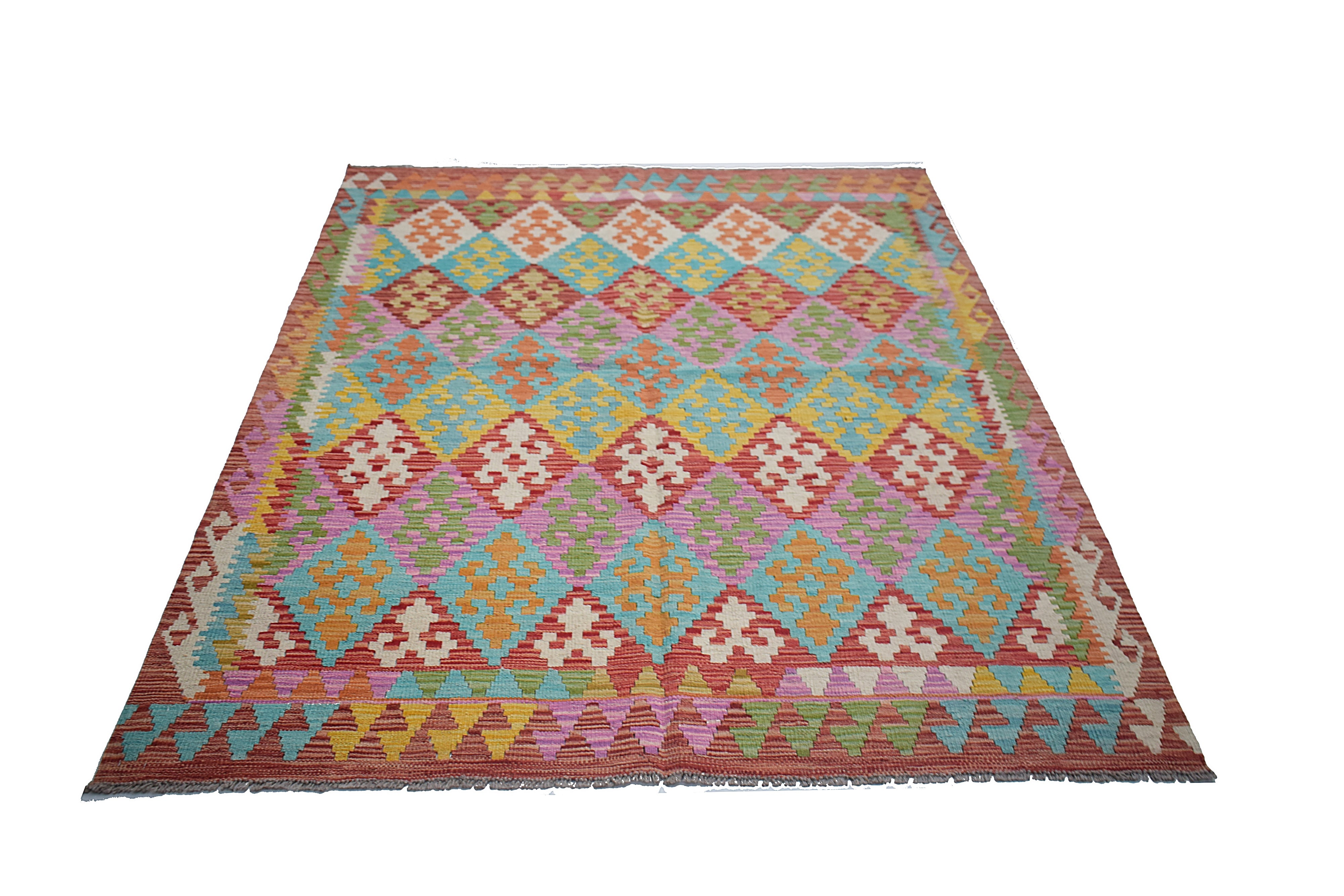 Maimana kilims are a proud product of the Frayab province in northern Afghanistan, with their name derived from the historic city of Maimana, a key trading hub along the ancient Silk Road. These kilims reflect centuries-old weaving traditions passed down through generations of tribal artisans. Their distinctive geometric patterns and bold designs are influenced by the nomadic lifestyle of the region, where practicality meets artistry in textile creation. The Maimana region is known for its semi-arid landscapes, where the weavers source high-quality wool from local sheep, spin it by hand, and dye it using natural substances, often inspired by the earthy hues of their surroundings. These kilims are flatwoven without a pile, a technique that makes them lightweight, reversible, and perfect for diverse applications, from floor coverings to wall hangings.