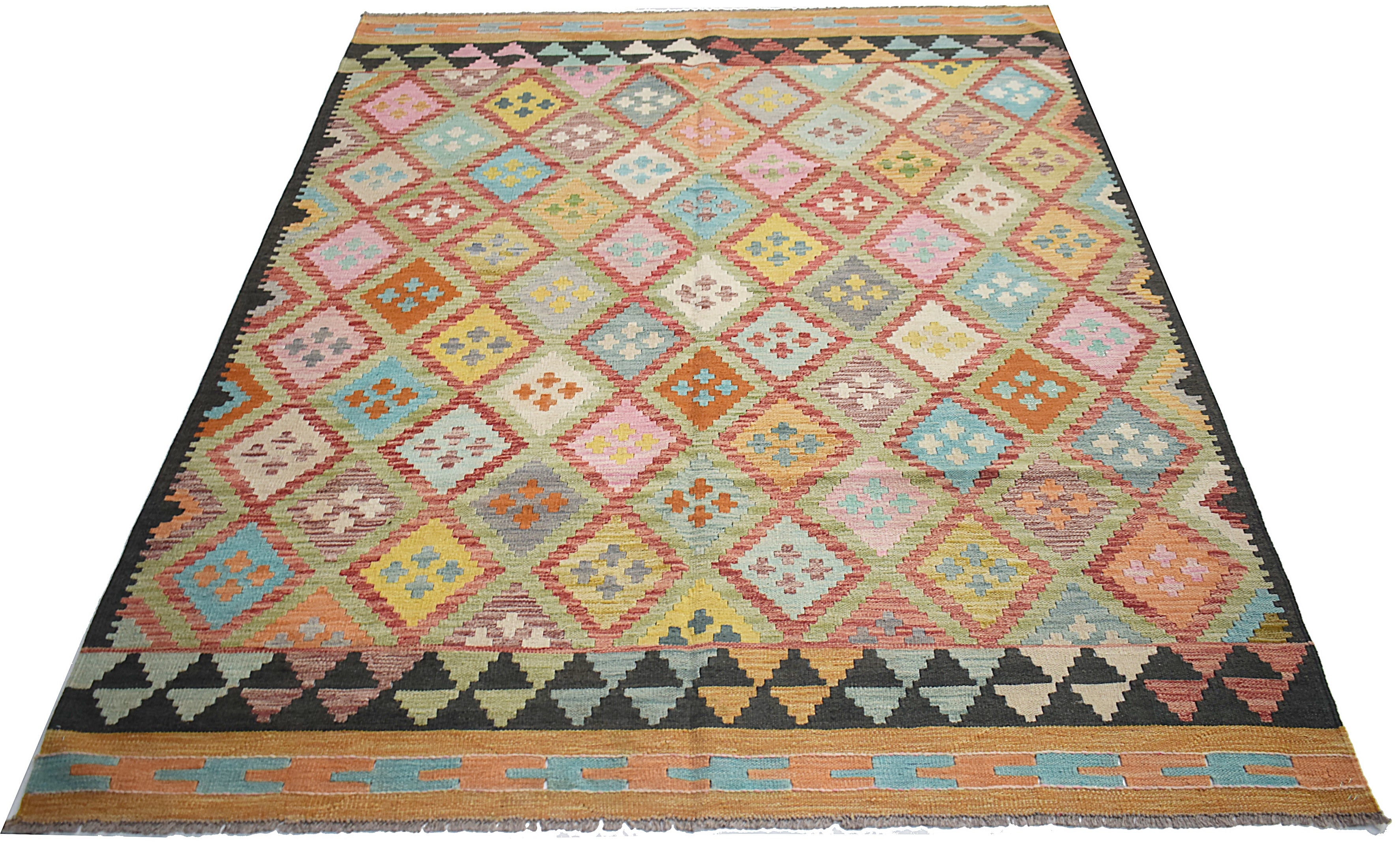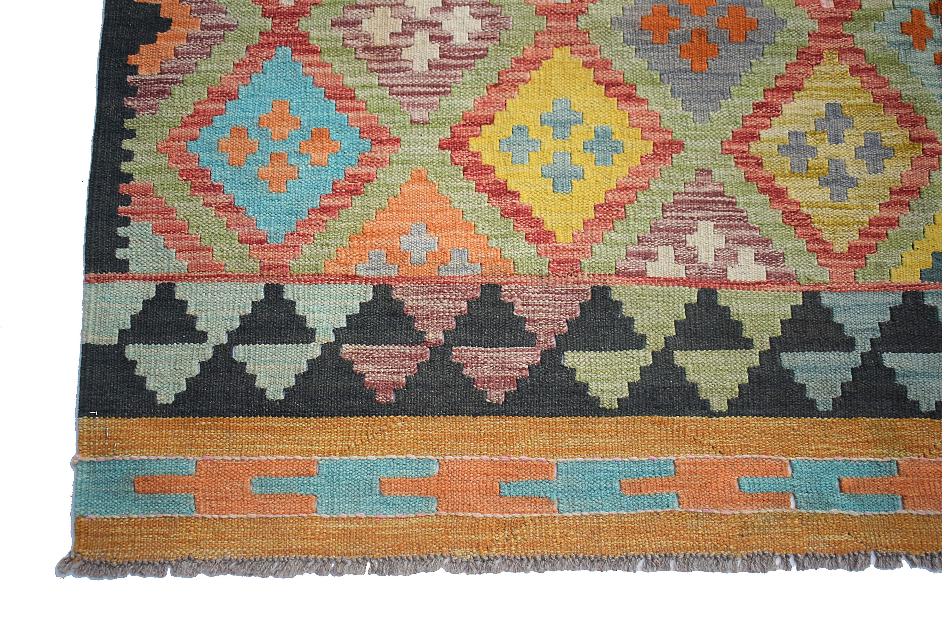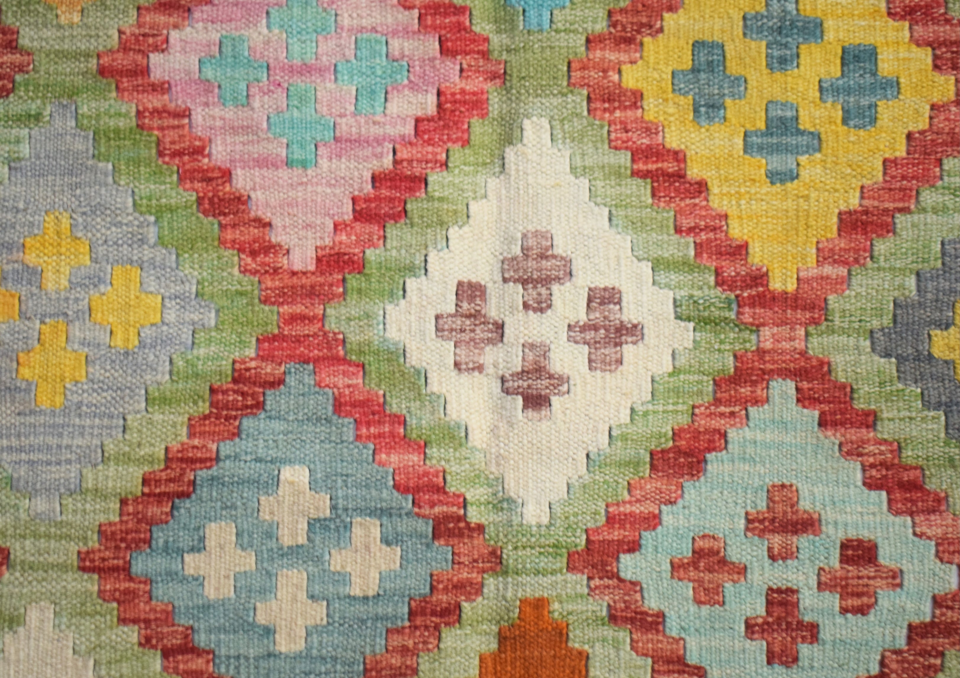 Maimana kilims are a proud product of the Frayab province in northern Afghanistan, with their name derived from the historic city of Maimana, a key trading hub along the ancient Silk Road. These kilims reflect centuries-old weaving traditions passed down through generations of tribal artisans. Their distinctive geometric patterns and bold designs are influenced by the nomadic lifestyle of the region, where practicality meets artistry in textile creation. The Maimana region is known for its semi-arid landscapes, where the weavers source high-quality wool from local sheep, spin it by hand, and dye it using natural substances, often inspired by the earthy hues of their surroundings. These kilims are flatwoven without a pile, a technique that makes them lightweight, reversible, and perfect for diverse applications, from floor coverings to wall hangings.