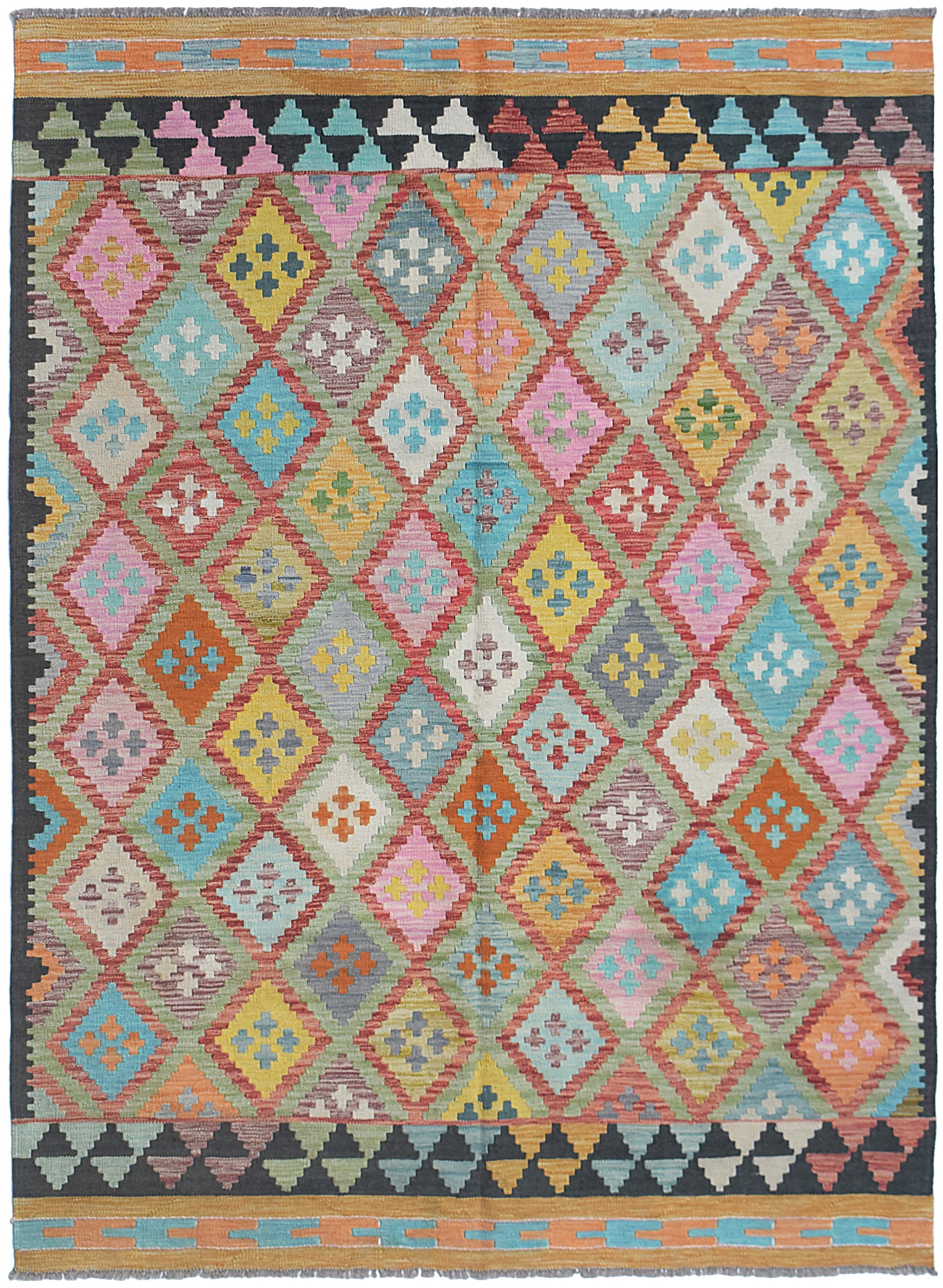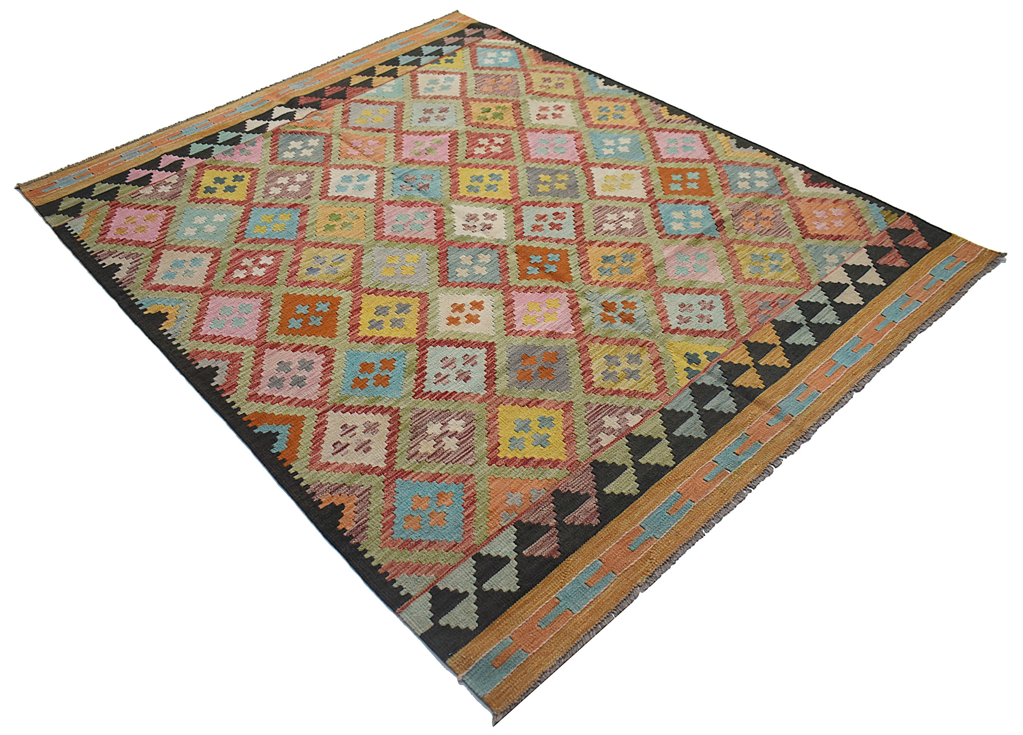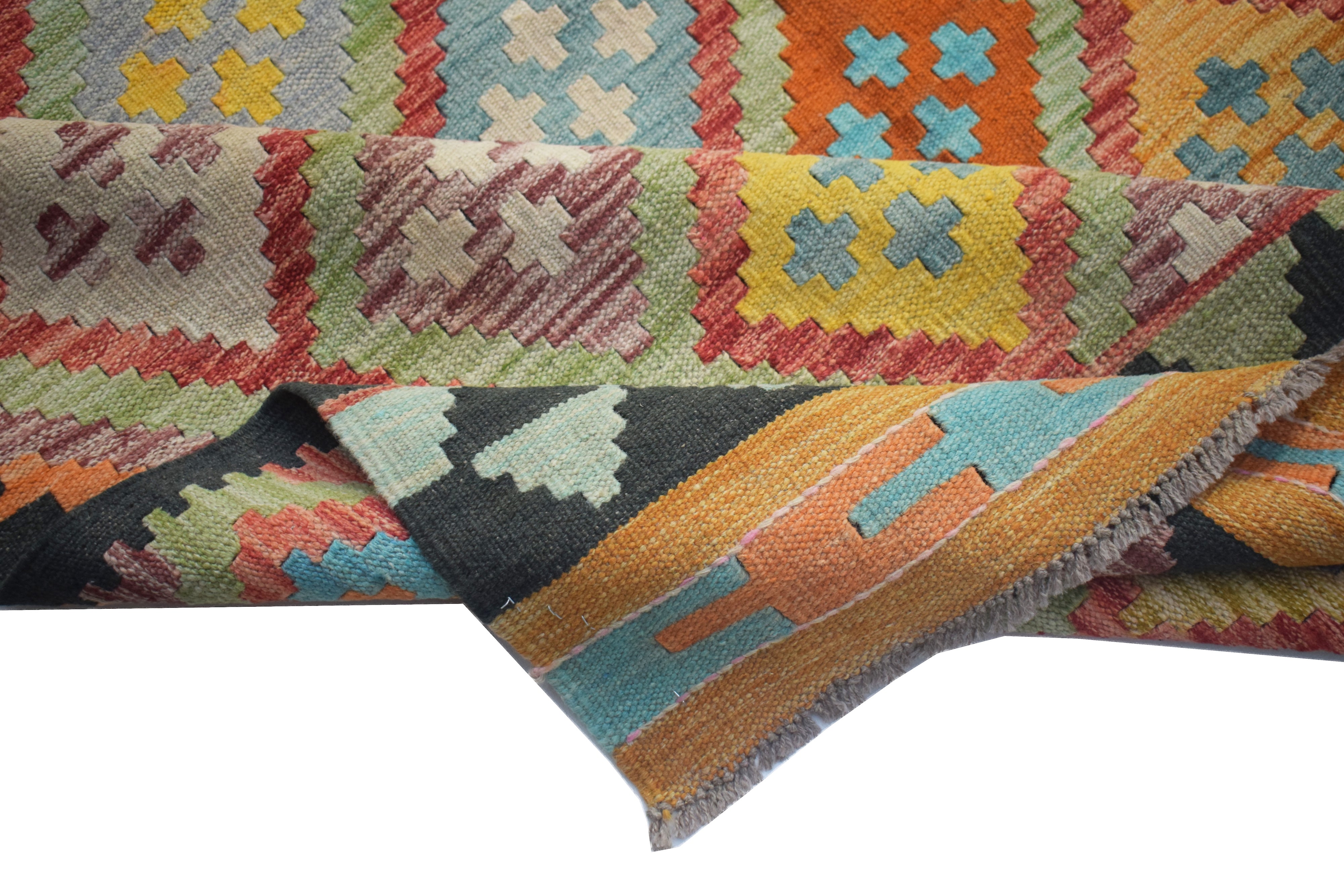 Maimana kilims are a proud product of the Frayab province in northern Afghanistan, with their name derived from the historic city of Maimana, a key trading hub along the ancient Silk Road. These kilims reflect centuries-old weaving traditions passed down through generations of tribal artisans. Their distinctive geometric patterns and bold designs are influenced by the nomadic lifestyle of the region, where practicality meets artistry in textile creation. The Maimana region is known for its semi-arid landscapes, where the weavers source high-quality wool from local sheep, spin it by hand, and dye it using natural substances, often inspired by the earthy hues of their surroundings. These kilims are flatwoven without a pile, a technique that makes them lightweight, reversible, and perfect for diverse applications, from floor coverings to wall hangings.