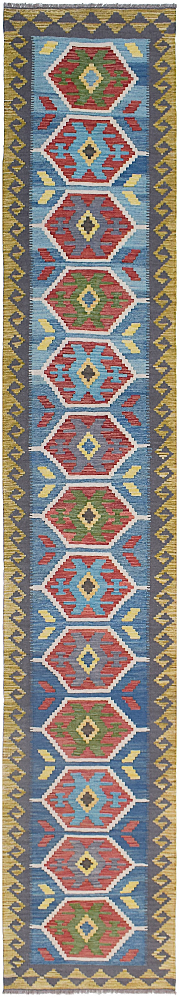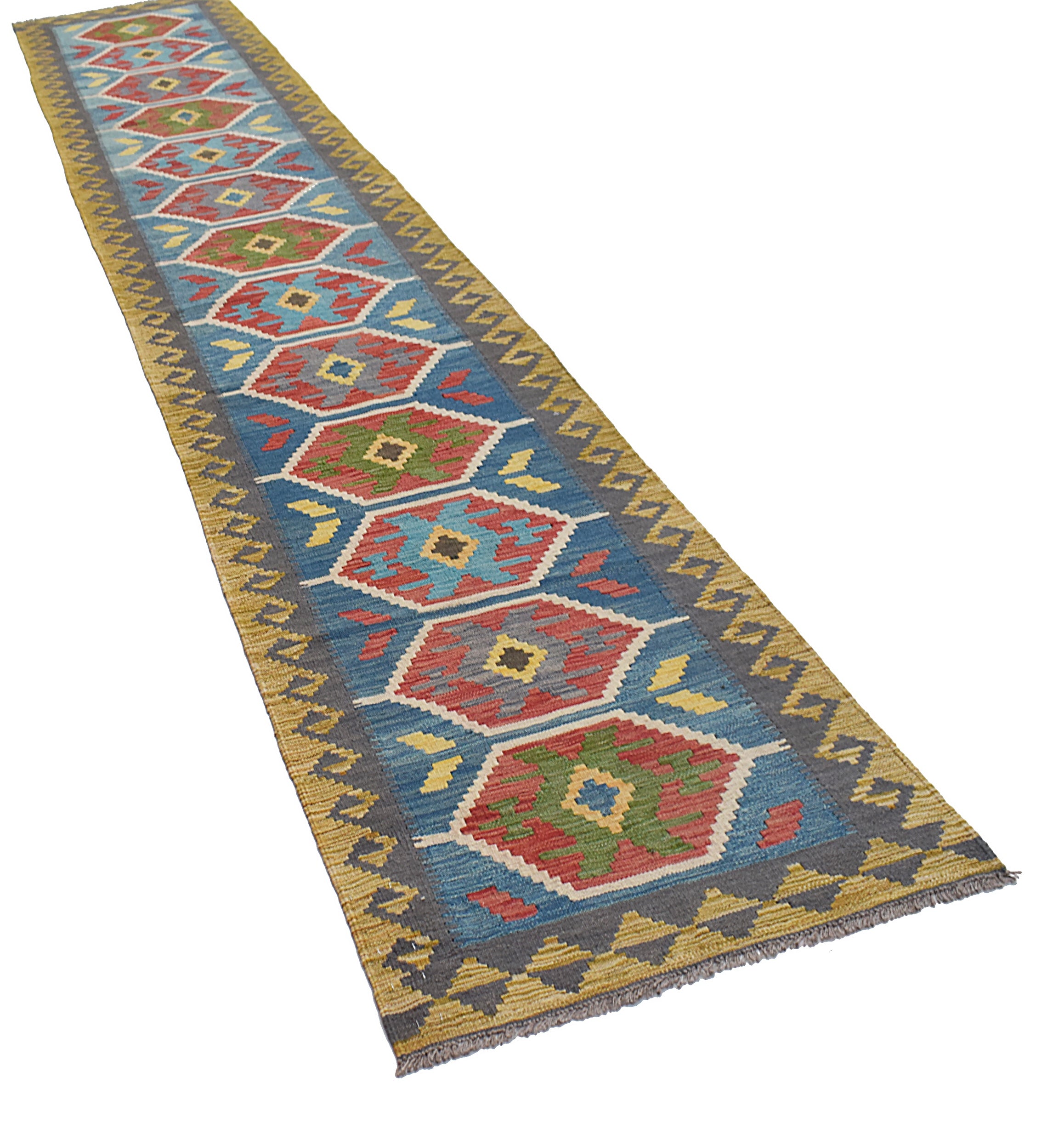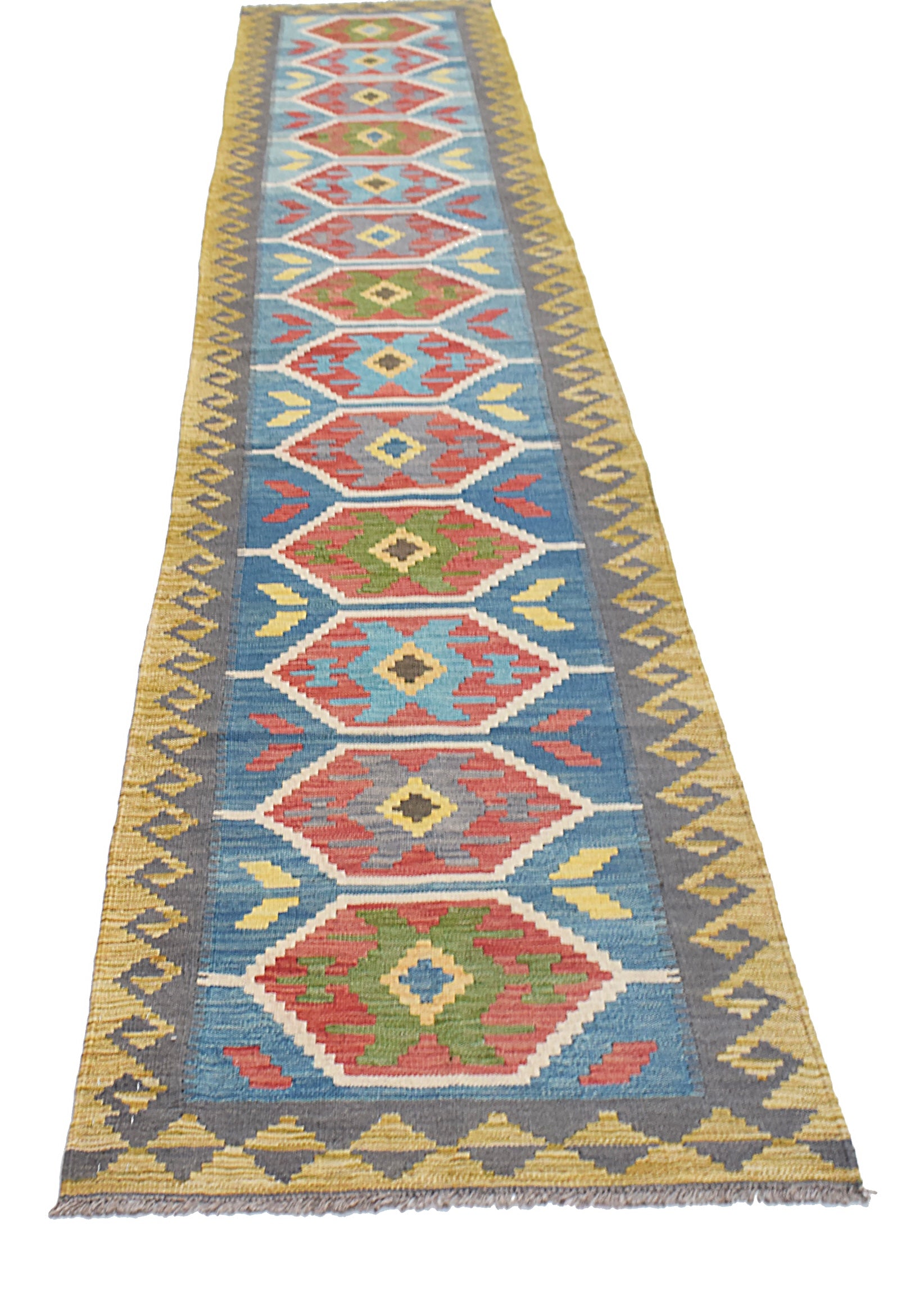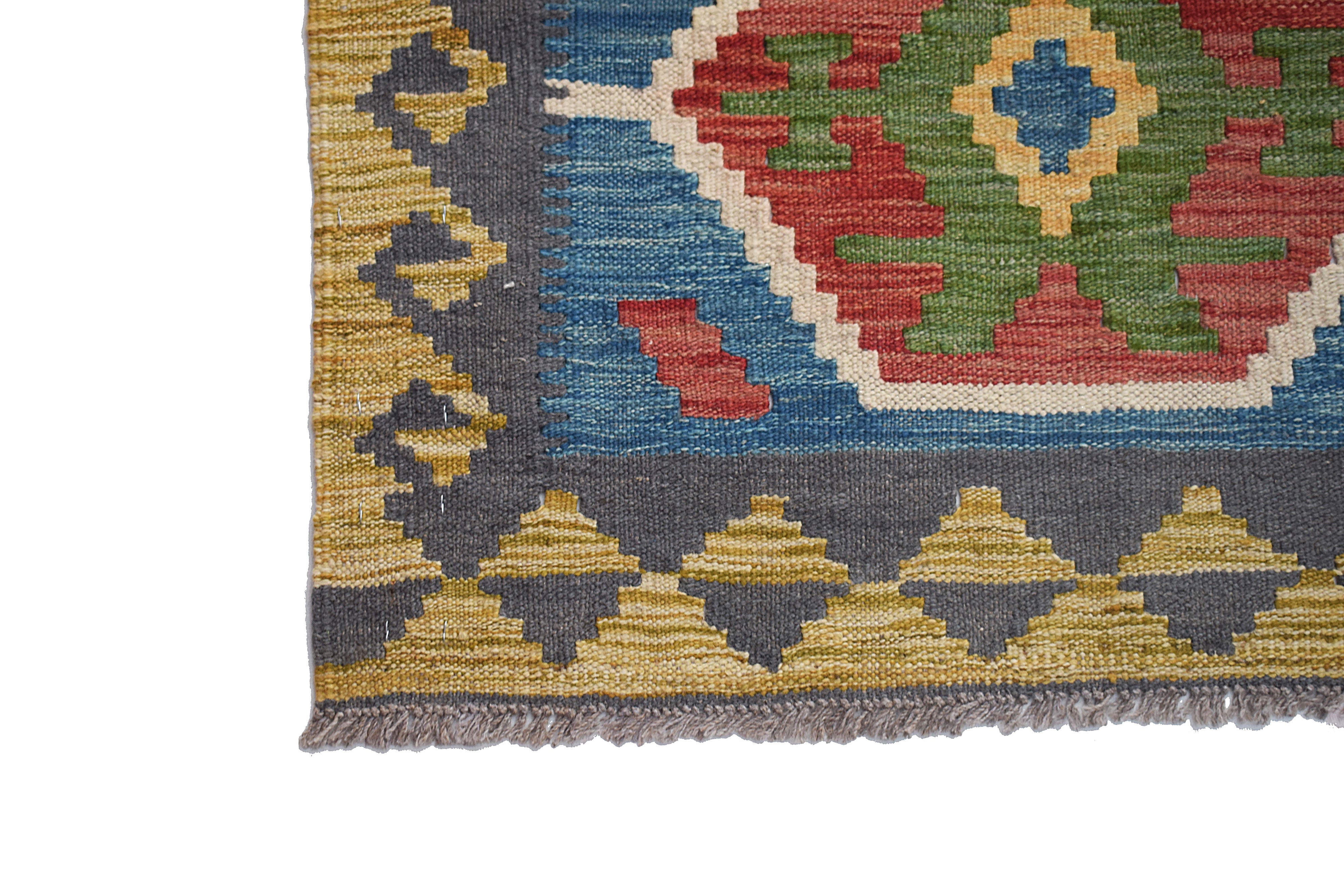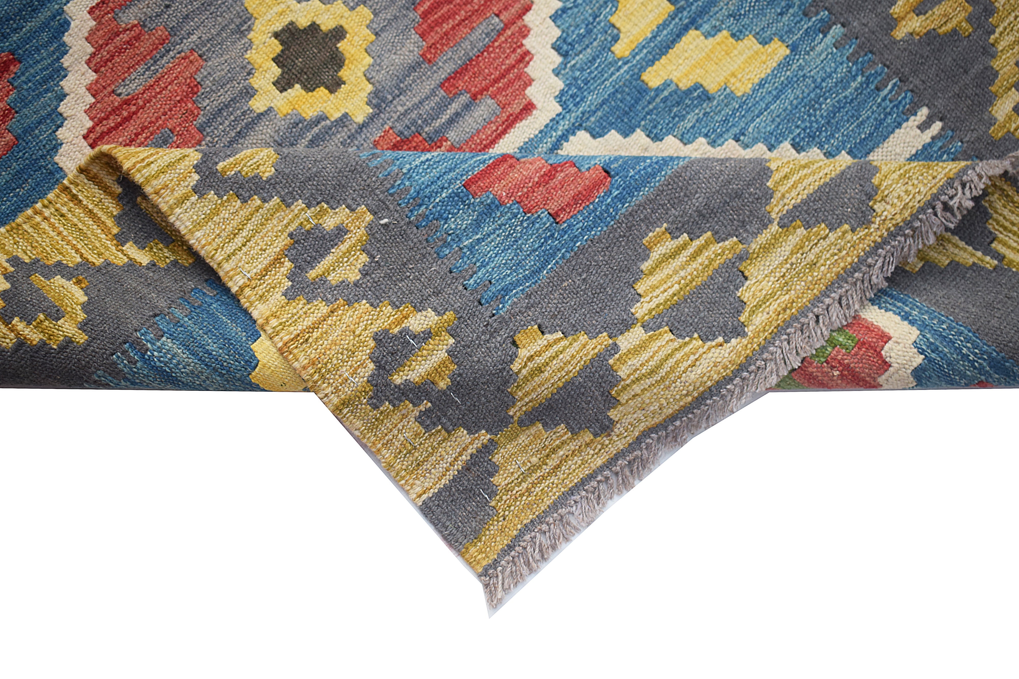 Maimana kilims are a proud product of the Frayab province in northern Afghanistan, with their name derived from the historic city of Maimana, a key trading hub along the ancient Silk Road. These kilims reflect centuries-old weaving traditions passed down through generations of tribal artisans. Their distinctive geometric patterns and bold designs are influenced by the nomadic lifestyle of the region, where practicality meets artistry in textile creation. The Maimana region is known for its semi-arid landscapes, where the weavers source high-quality wool from local sheep, spin it by hand, and dye it using natural substances, often inspired by the earthy hues of their surroundings. These kilims are flatwoven without a pile, a technique that makes them lightweight, reversible, and perfect for diverse applications, from floor coverings to wall hangings.