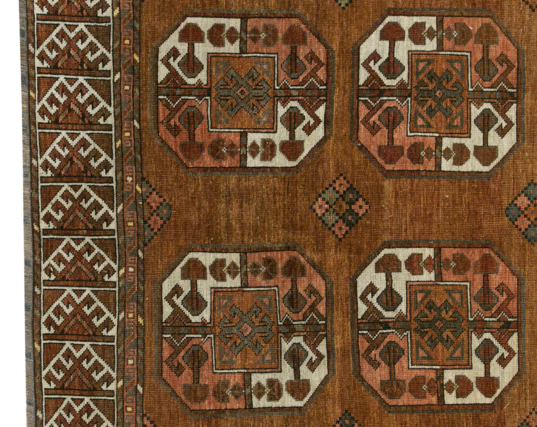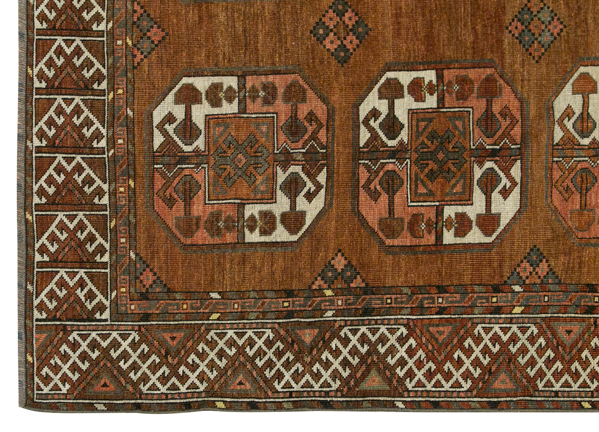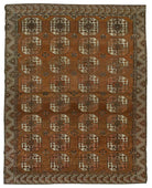 This 100-year-old Elephant's Foot Turkmen rug is a truly unique masterpiece, distinguished by its striking and uncommon colour palette of green and orange hues. These vibrant tones, derived from natural dyes, have aged gracefully over the decades, creating a rich, harmonious blend that sets this rug apart from more traditional colour schemes. The green evokes a sense of earthy vitality, while the orange adds warmth and depth, making the rug a captivating focal point.