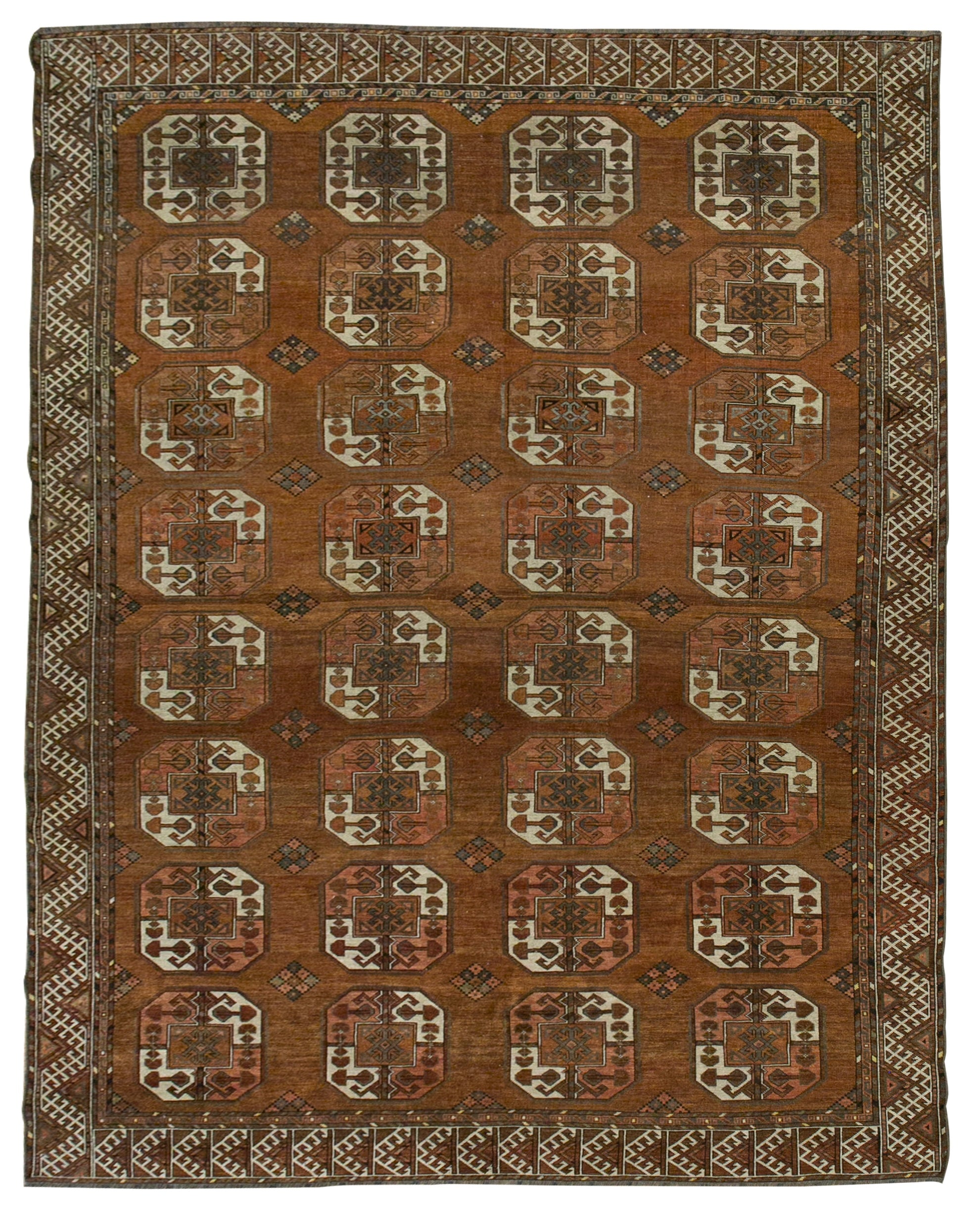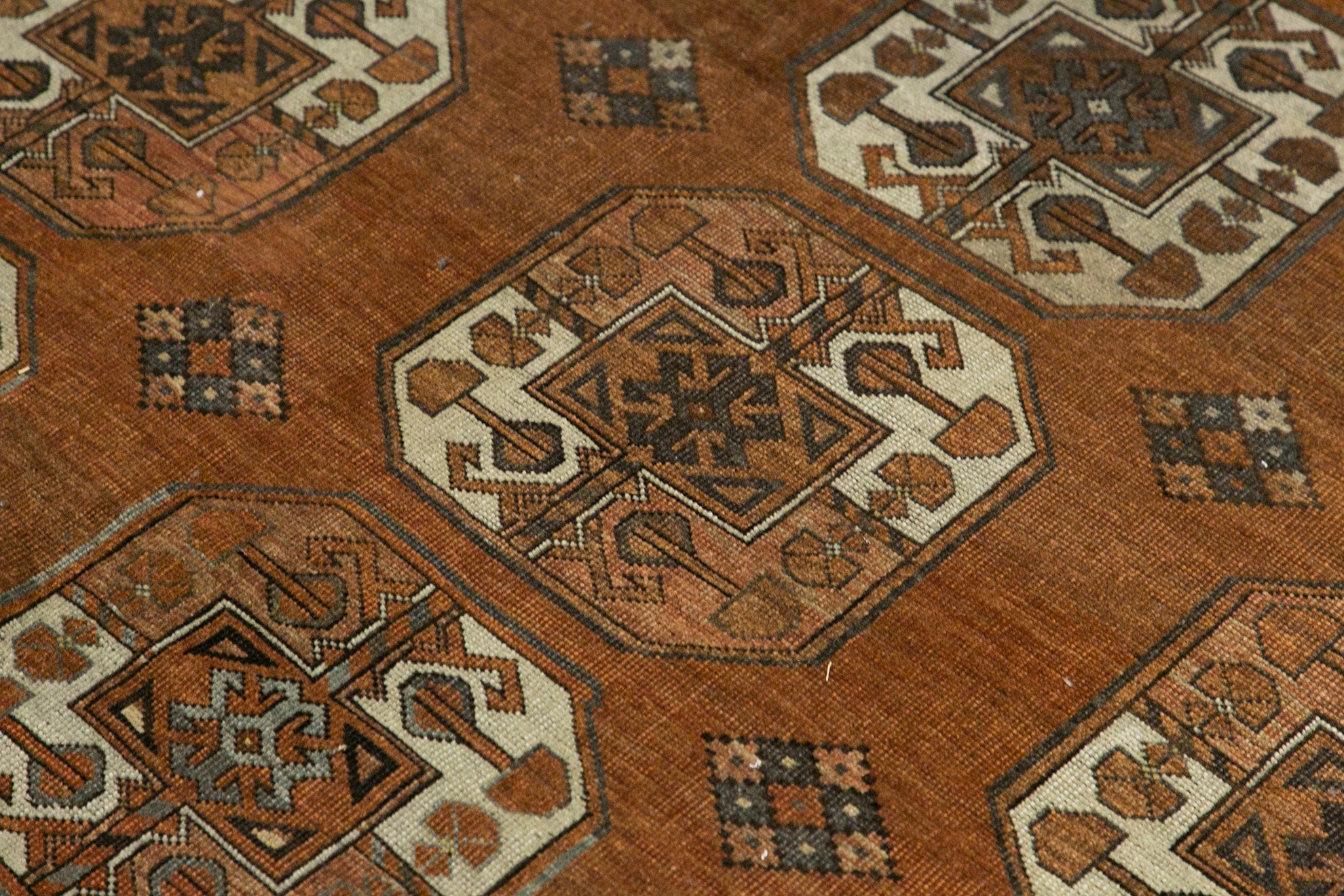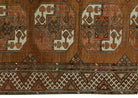 The iconic "elephant's foot" motif, rendered in these distinctive colours, stands out boldly against the rug's field, showcasing the artistry and skill of Turkmen weavers. Each geometric pattern and tribal symbol is meticulously crafted, telling a story of nomadic heritage and cultural pride. The rug's age is evident in its soft, weathered texture and subtle signs of use, which only enhance its authenticity and character.