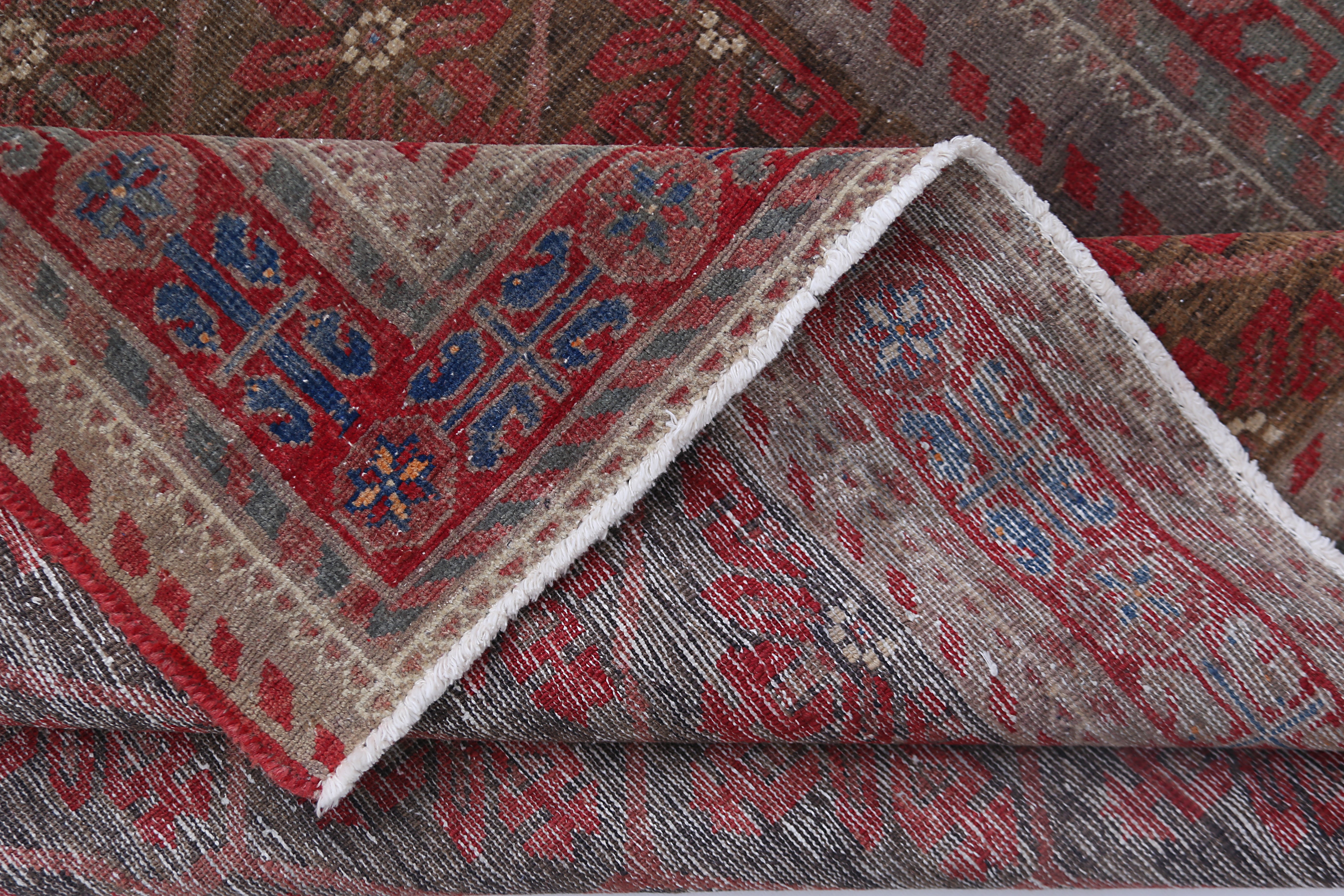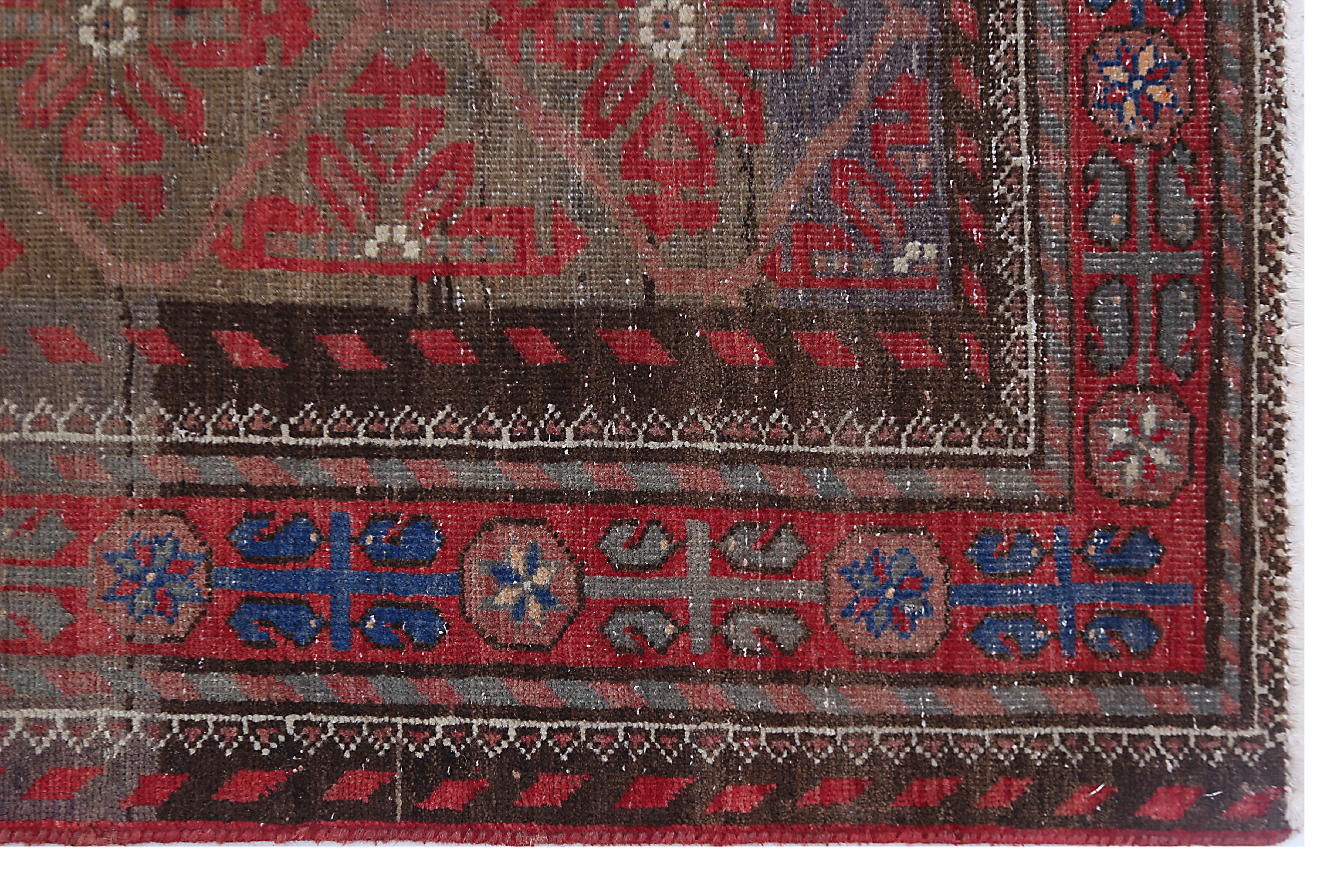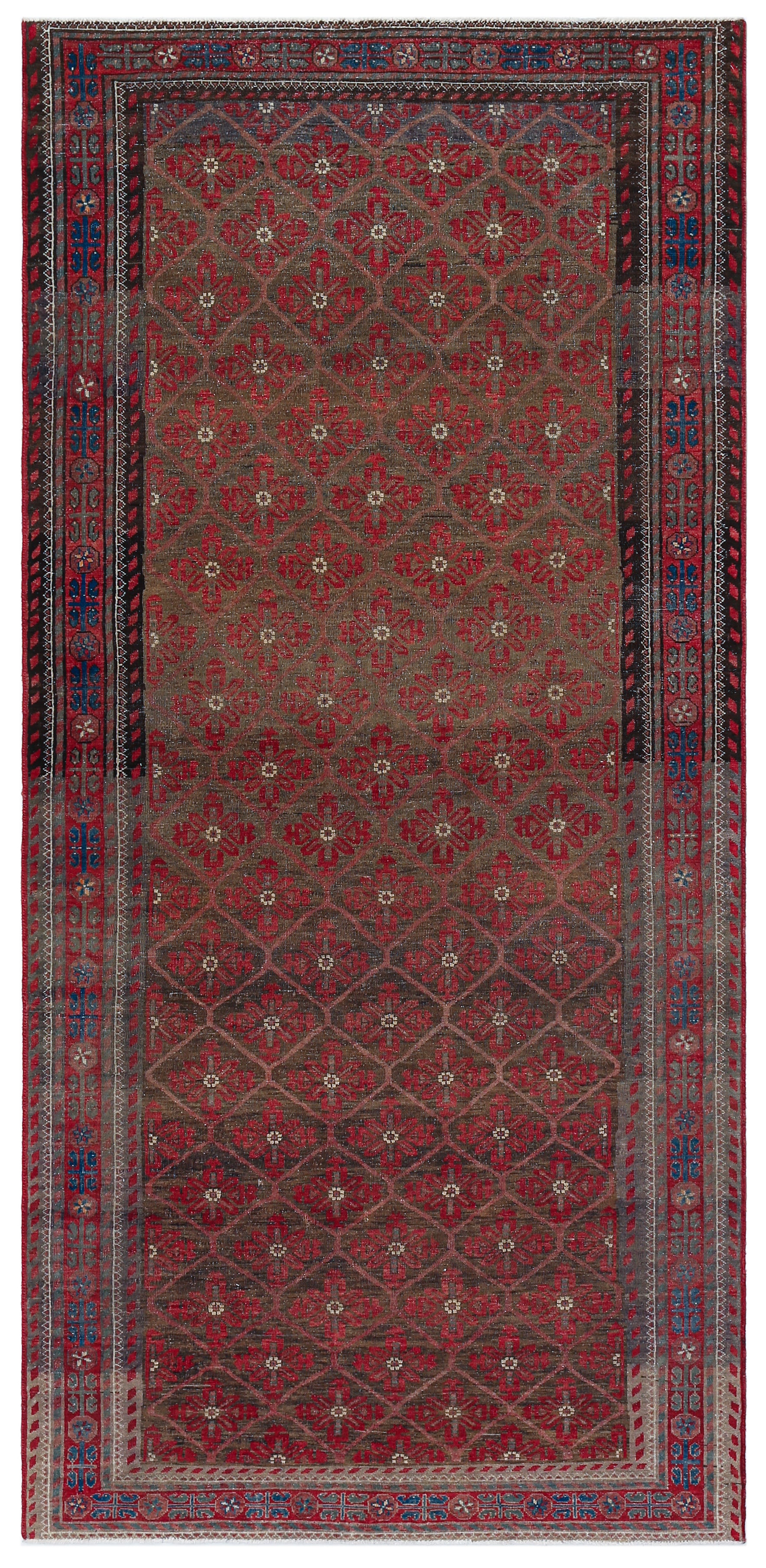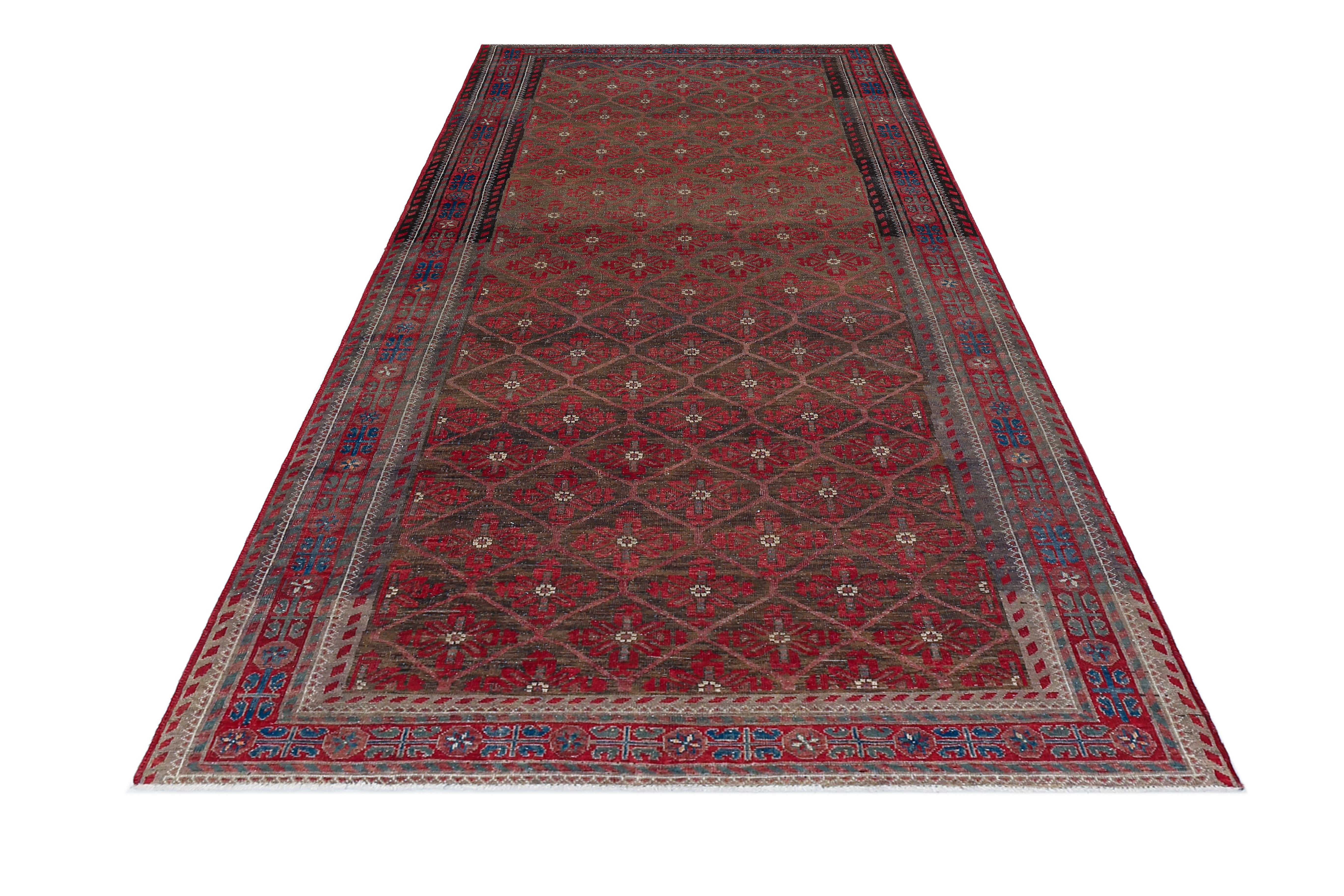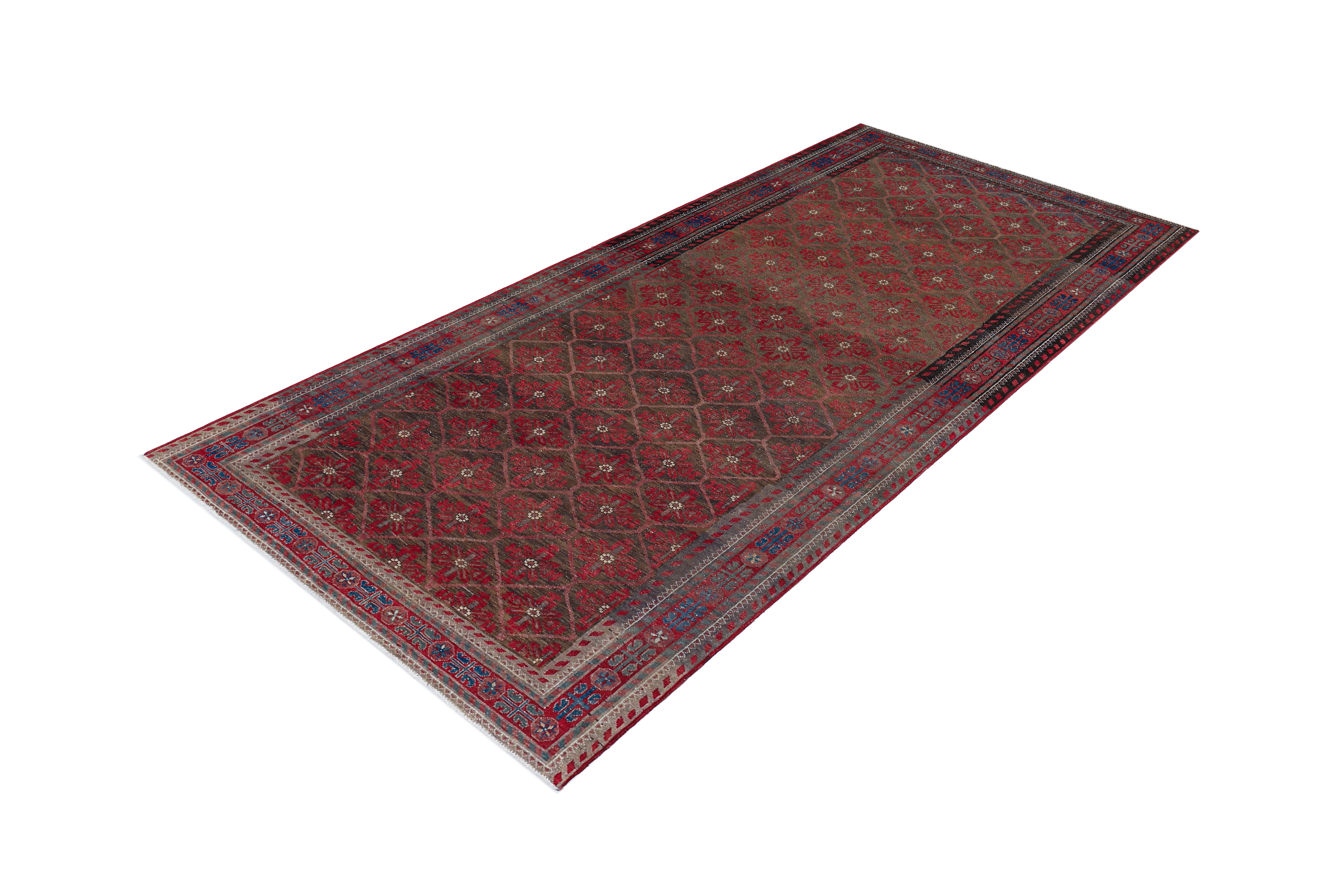 This vintage Balouch rug exemplifies the distinctive craftsmanship of the Baluch tribes, known for their nomadic weaving traditions and rich cultural heritage. Baluch rugs typically feature intricate geometric patterns and bold colour schemes, often dominated by deep reds, browns, and navy blues, accented with ivory or white highlights. Hand-knotted using high-quality wool, this rug is both soft and highly durable, making it a functional yet artistic addition to any space. The compact size and lightweight construction, common among Balouch rugs, reflect their nomadic origins, designed for practical use in tents and tribal homes.