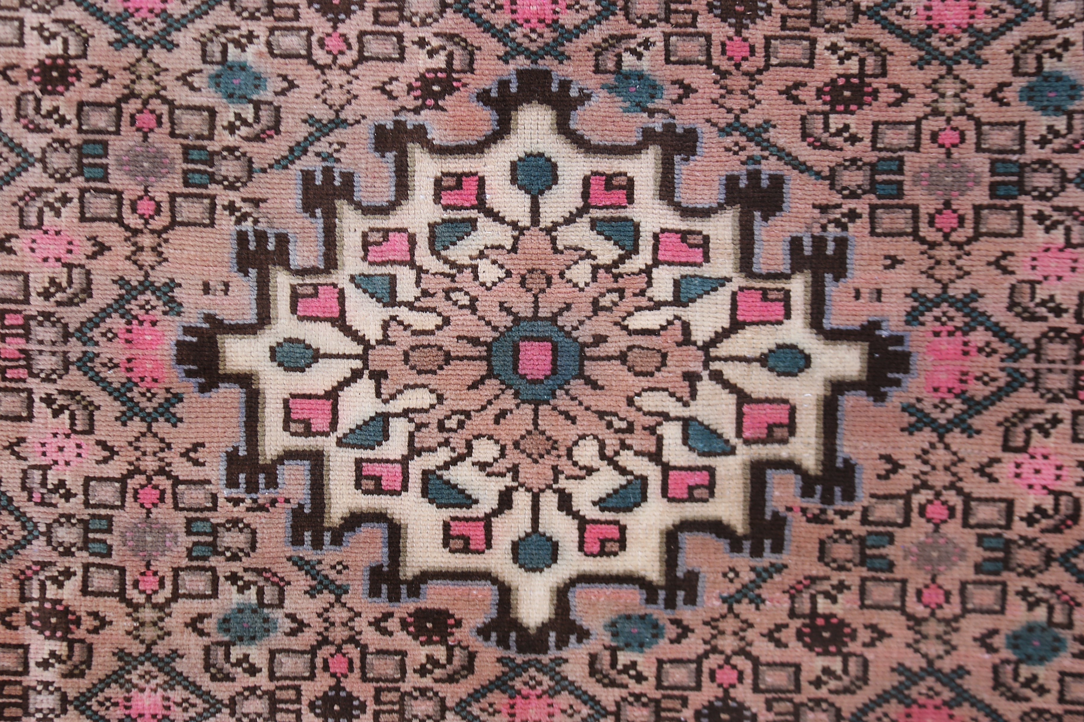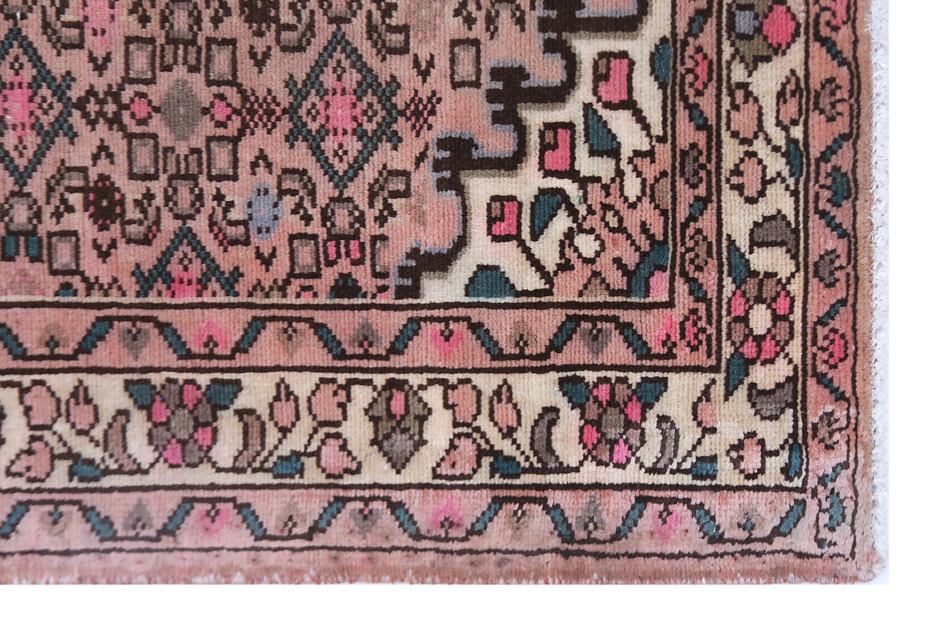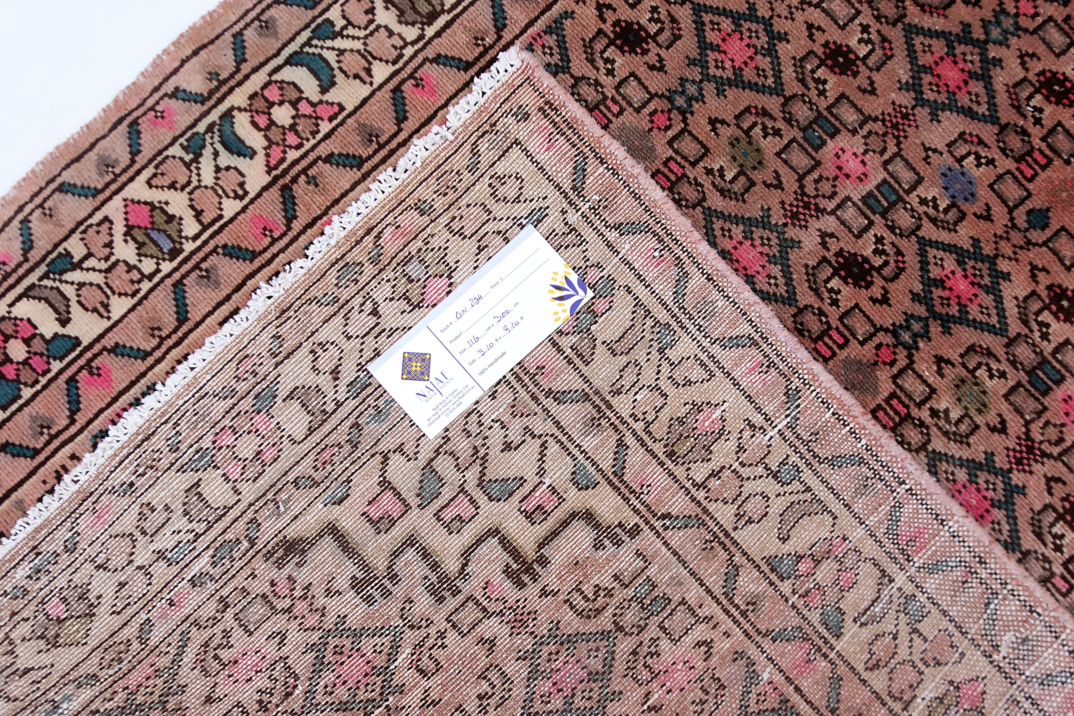 This vintage Hossainabad rug is a stunning example of Persian village weaving, showcasing the traditional artistry of its namesake region. Known for their durability and intricate designs, Hossainabad rugs often feature central medallions or repeating floral patterns, complemented by vibrant tones. This piece is framed by detailed borders that enhance its overall aesthetic and structure. Hand-knotted with high-quality wool, this rug offers both softness and longevity, making it a practical yet beautiful addition to any space. The design reflects the local culture and weaving traditions of Hossainabad, embodying the timeless appeal of Persian craftsmanship.