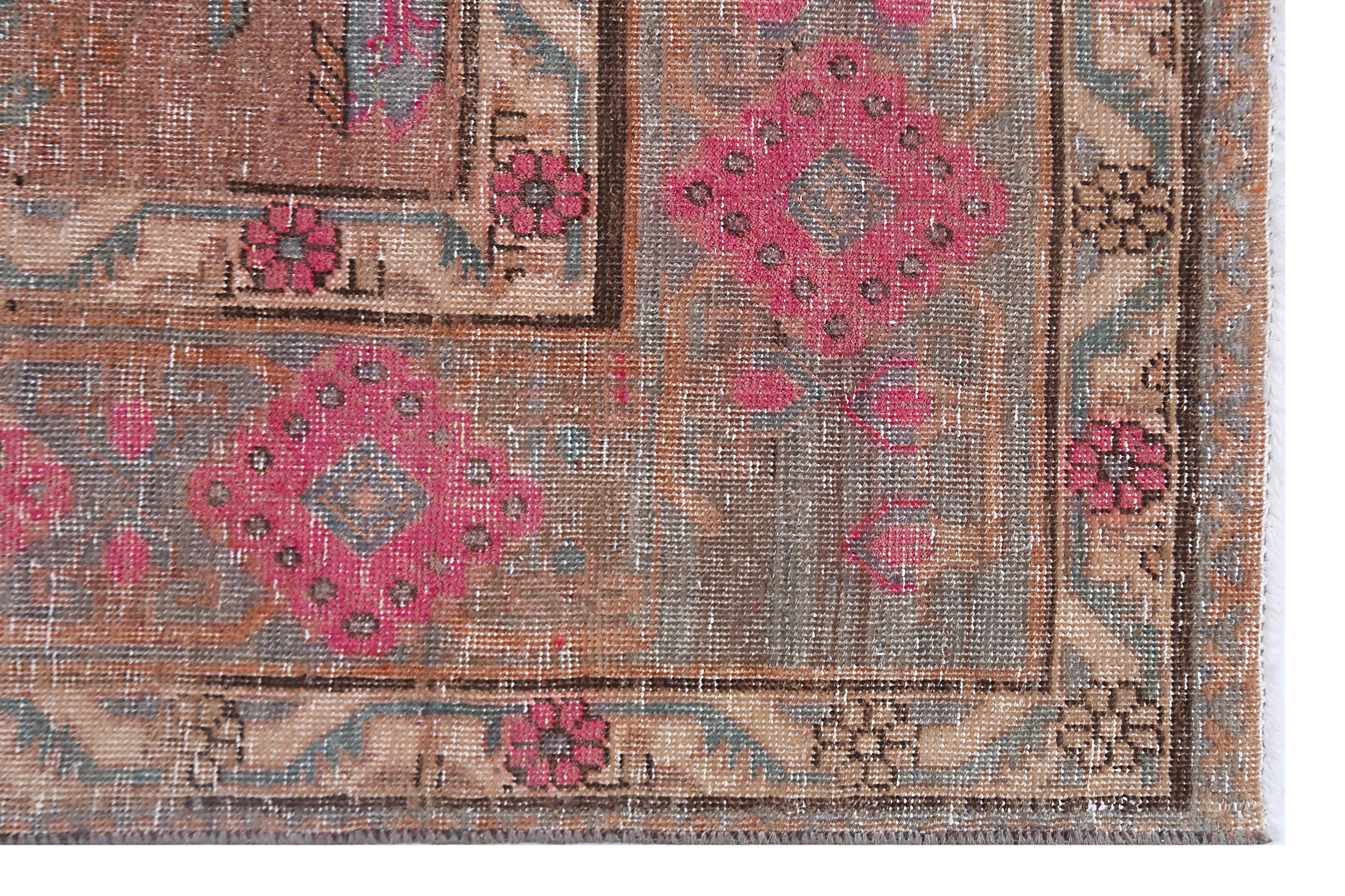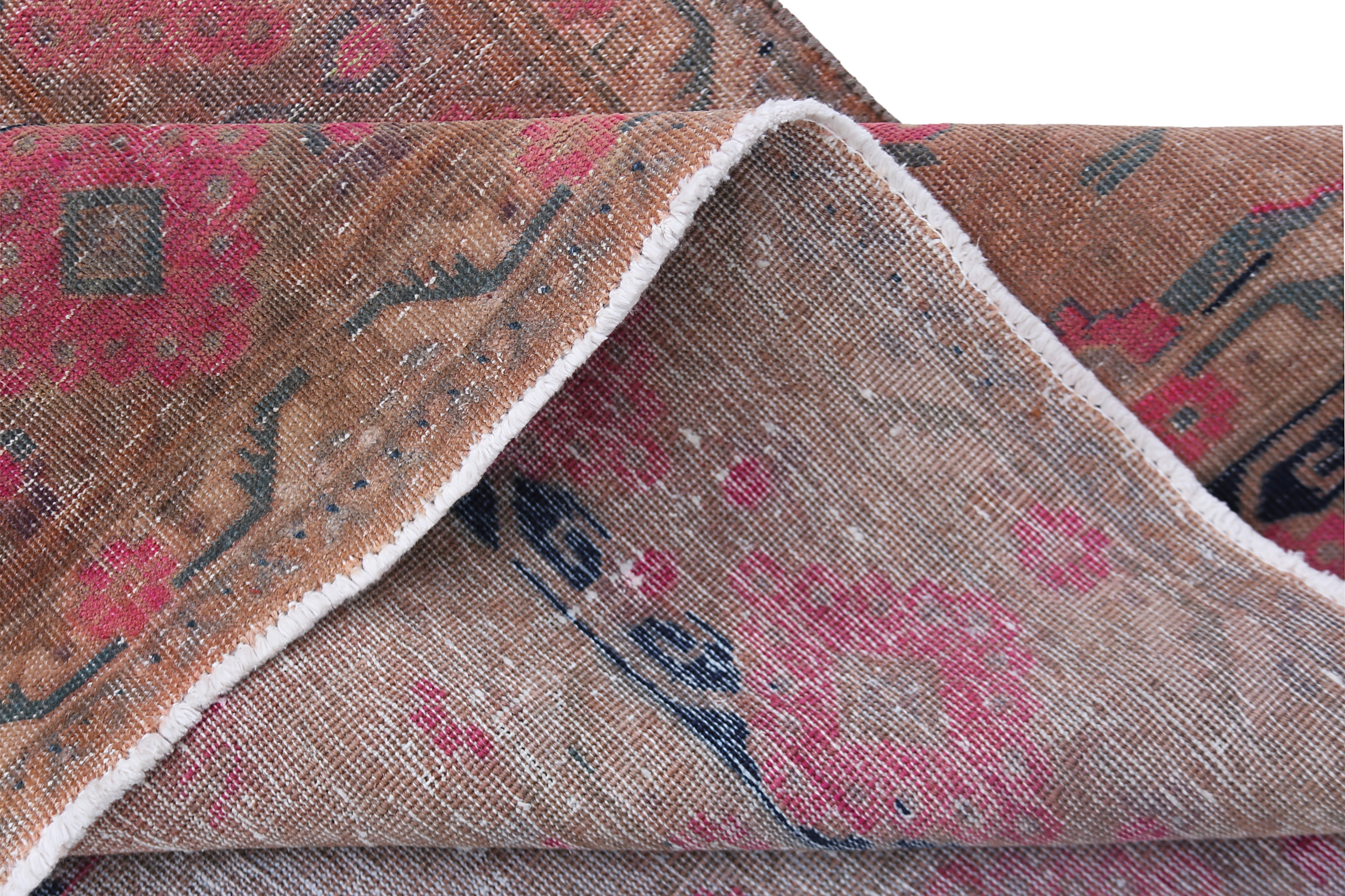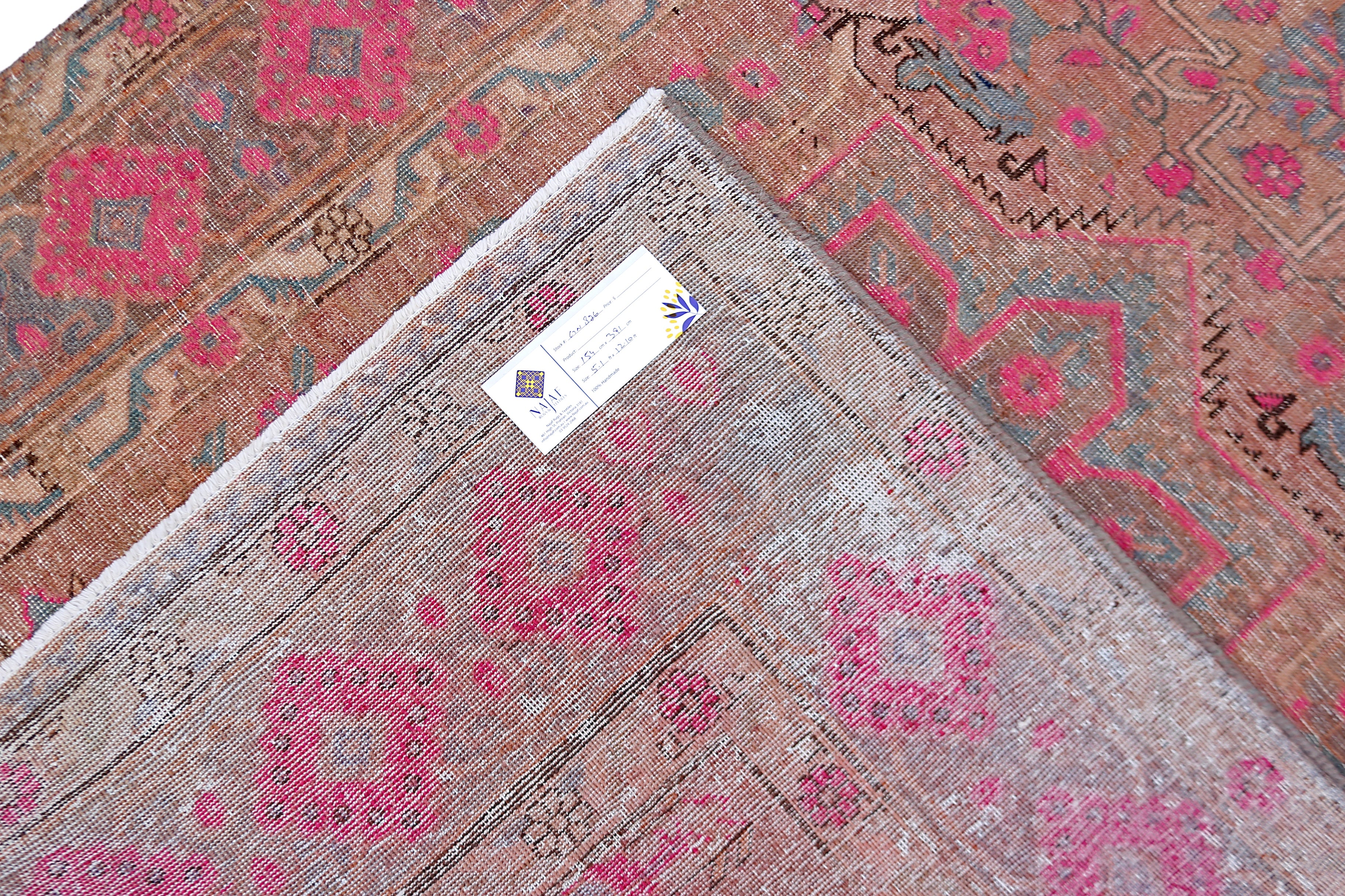 This vintage Persian rug showcases an elegant floral design, highlighted by its central medallion and framed by intricate borders. The warm base tones are beautifully complemented by vibrant pinks and blues, creating a striking yet harmonious colour palette. Hand-knotted with precision, this rug combines exceptional craftsmanship with a soft, durable texture. Its slightly worn finish enhances its vintage appeal, adding depth and character to the piece.