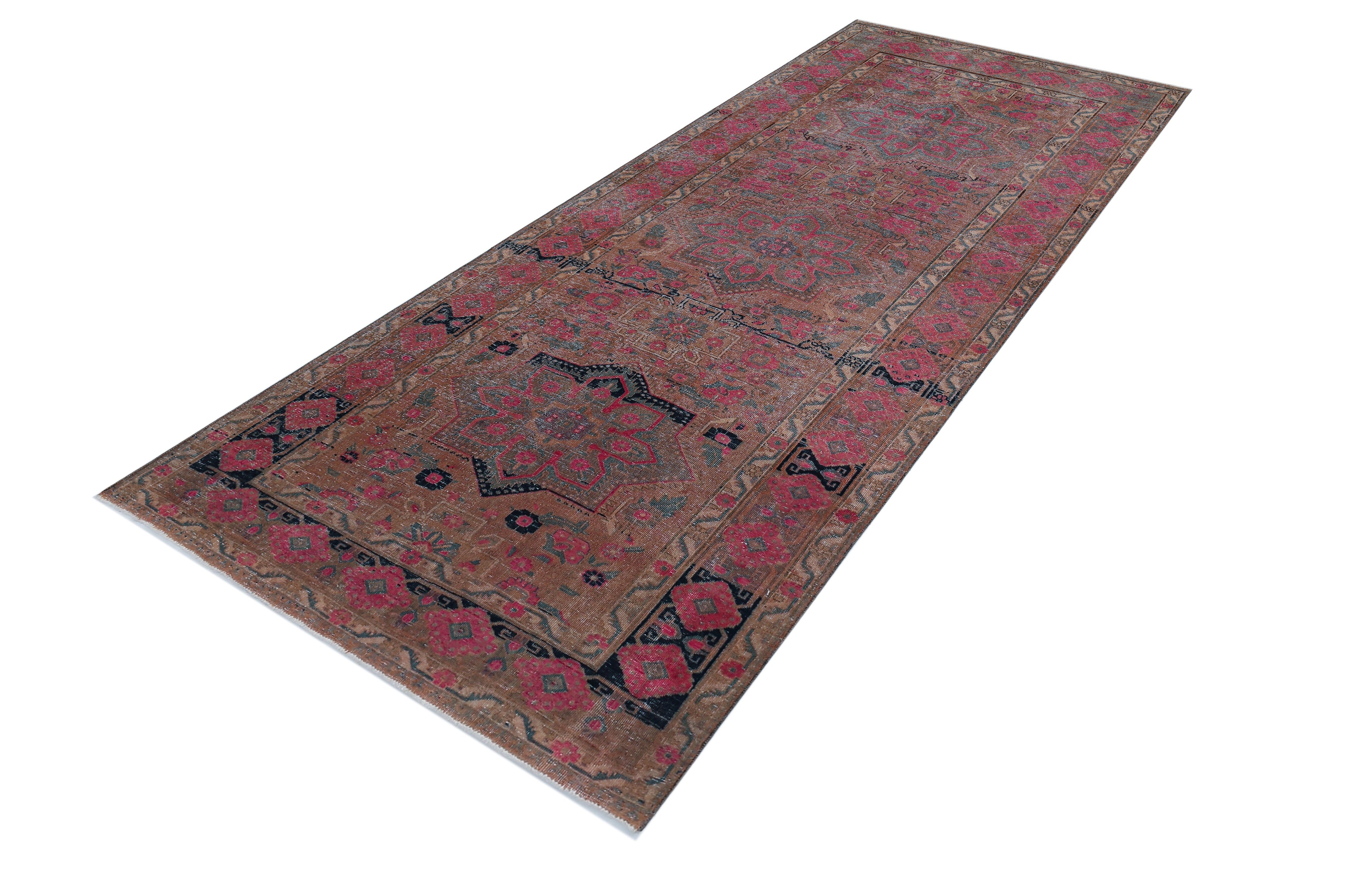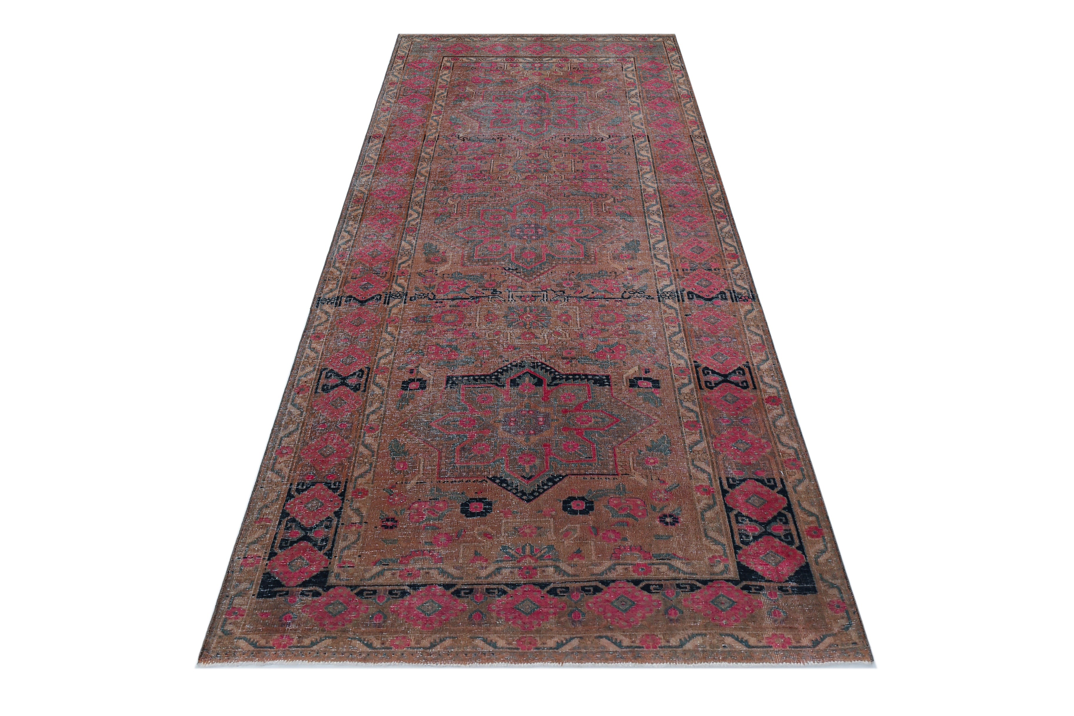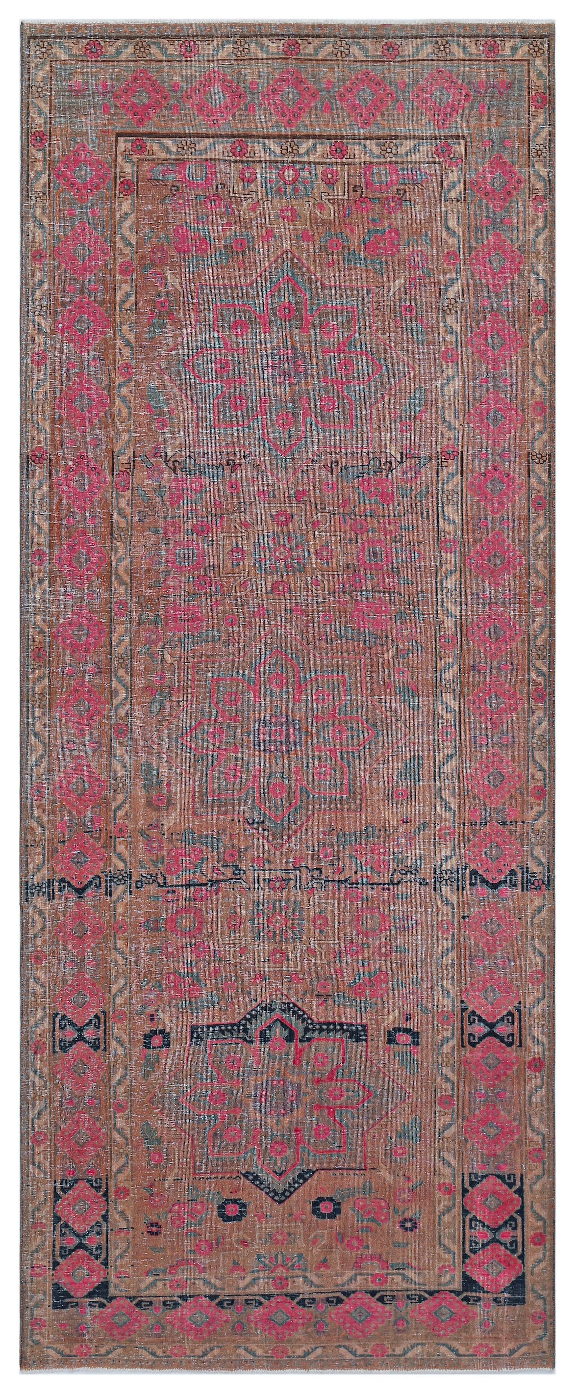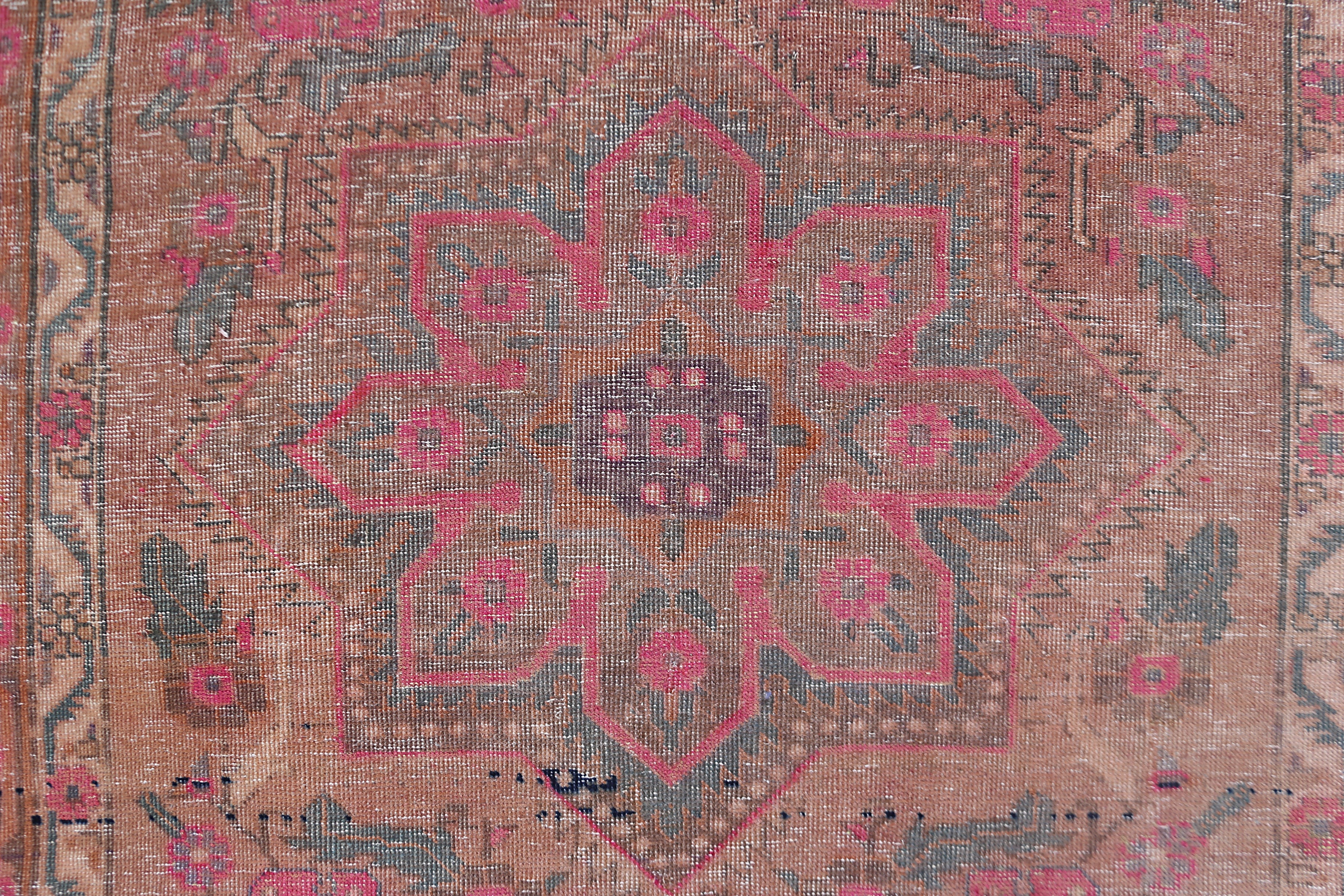 This vintage Persian rug showcases an elegant floral design, highlighted by its central medallion and framed by intricate borders. The warm base tones are beautifully complemented by vibrant pinks and blues, creating a striking yet harmonious colour palette. Hand-knotted with precision, this rug combines exceptional craftsmanship with a soft, durable texture. Its slightly worn finish enhances its vintage appeal, adding depth and character to the piece.