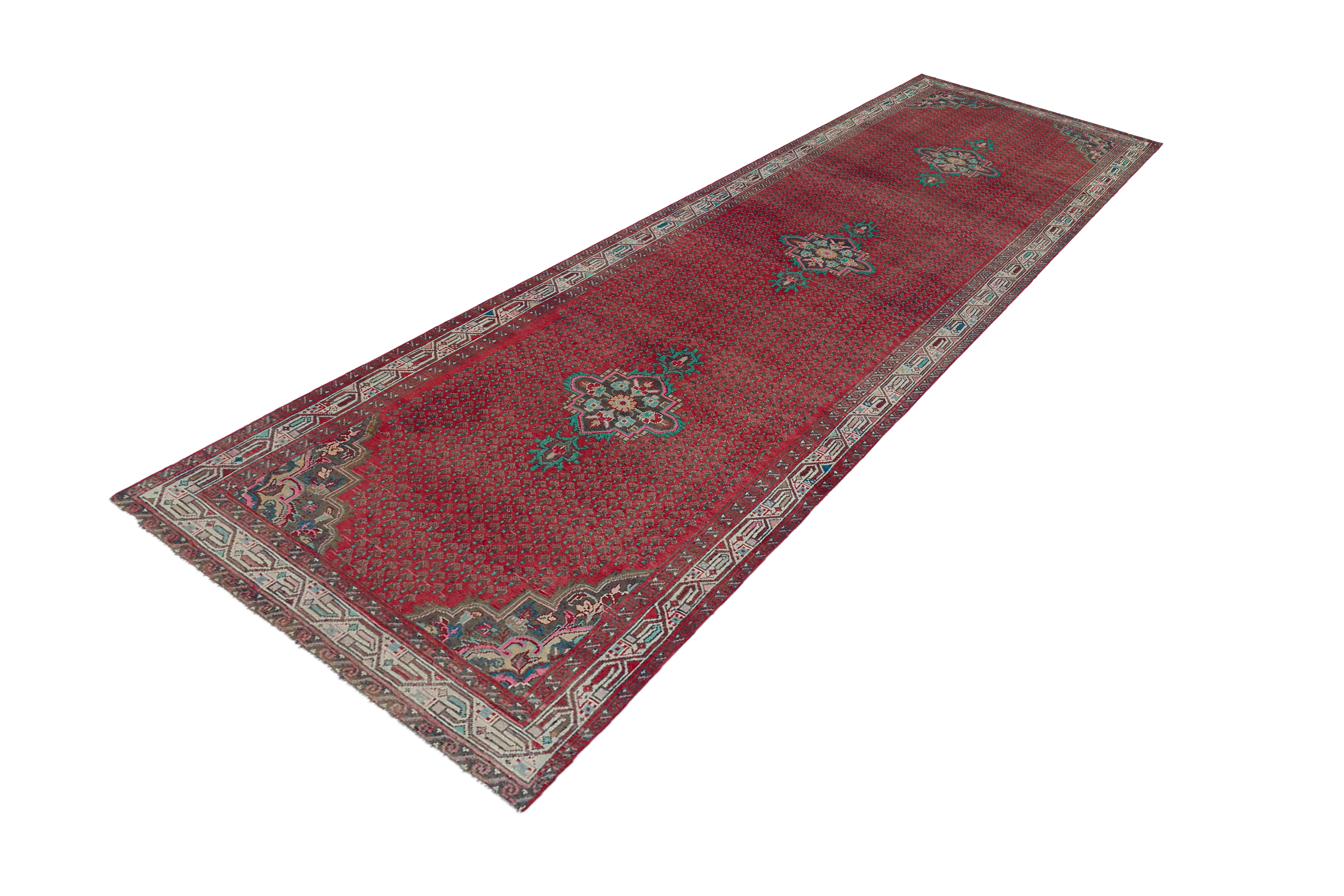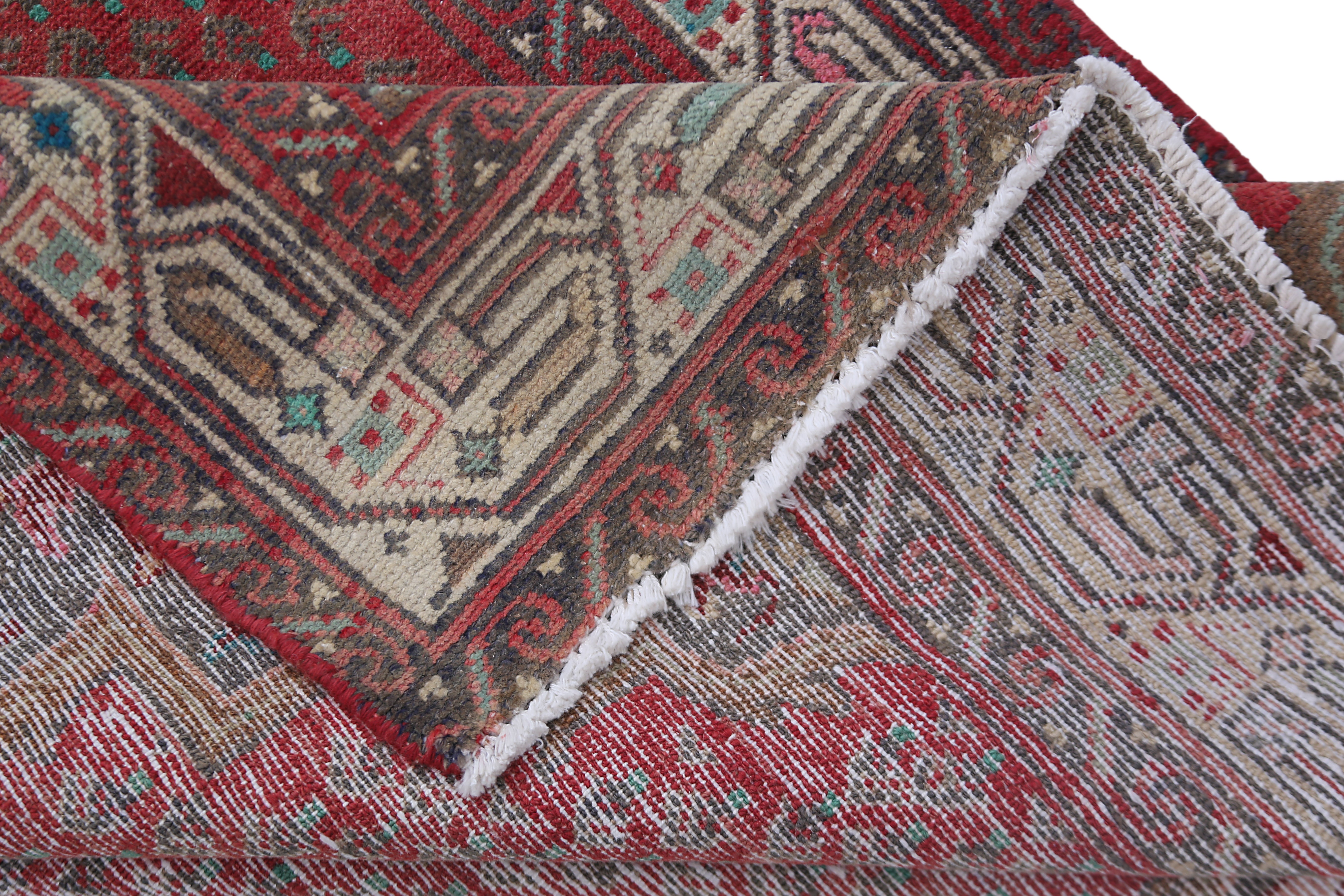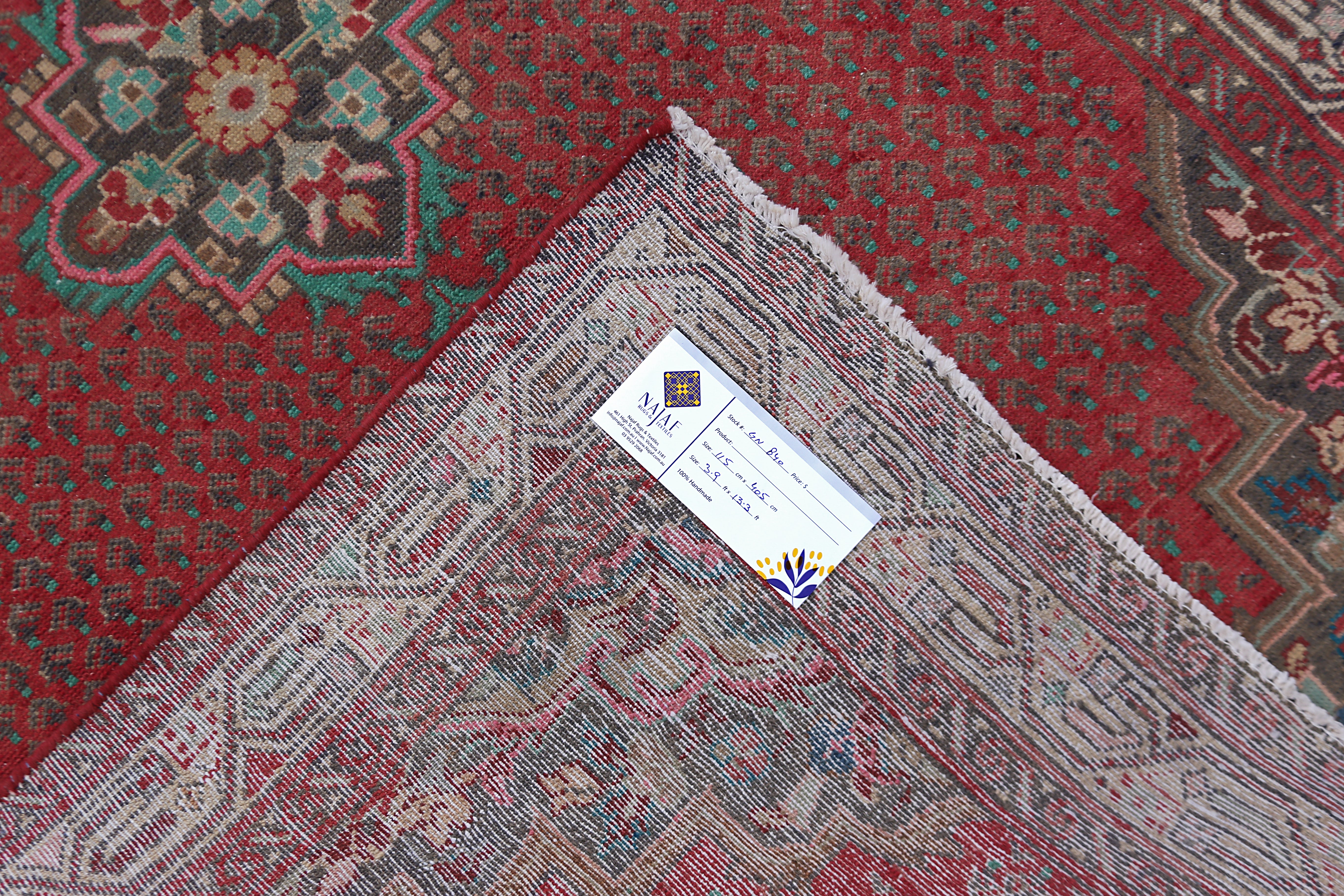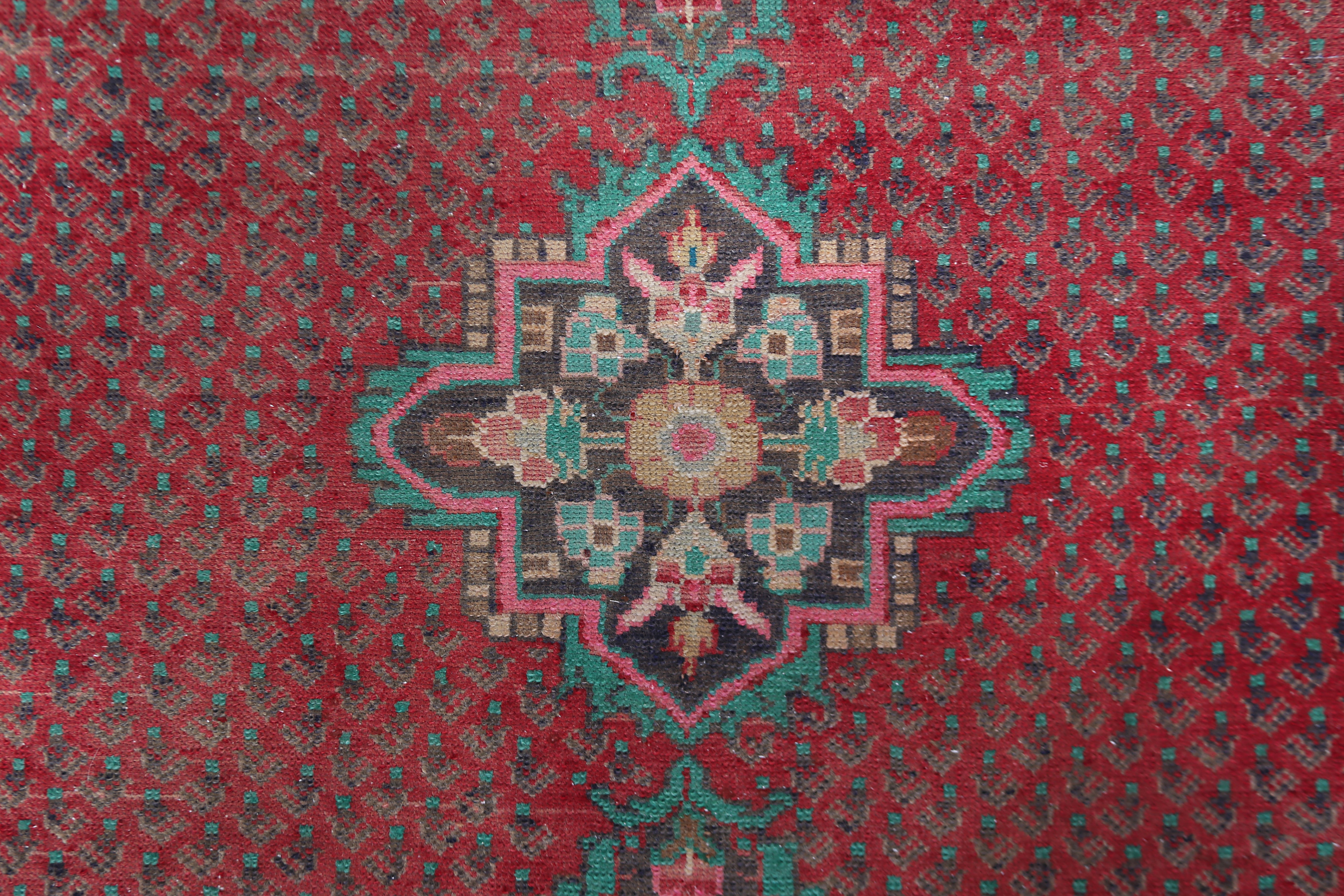 This vintage Saraband rug showcases the classic craftsmanship of Iran, with its intricate boteh (paisley) motifs repeating across the field. The vibrant red or deep navy background is framed by a finely detailed border, highlighting the precision and skill of its hand-knotted construction.