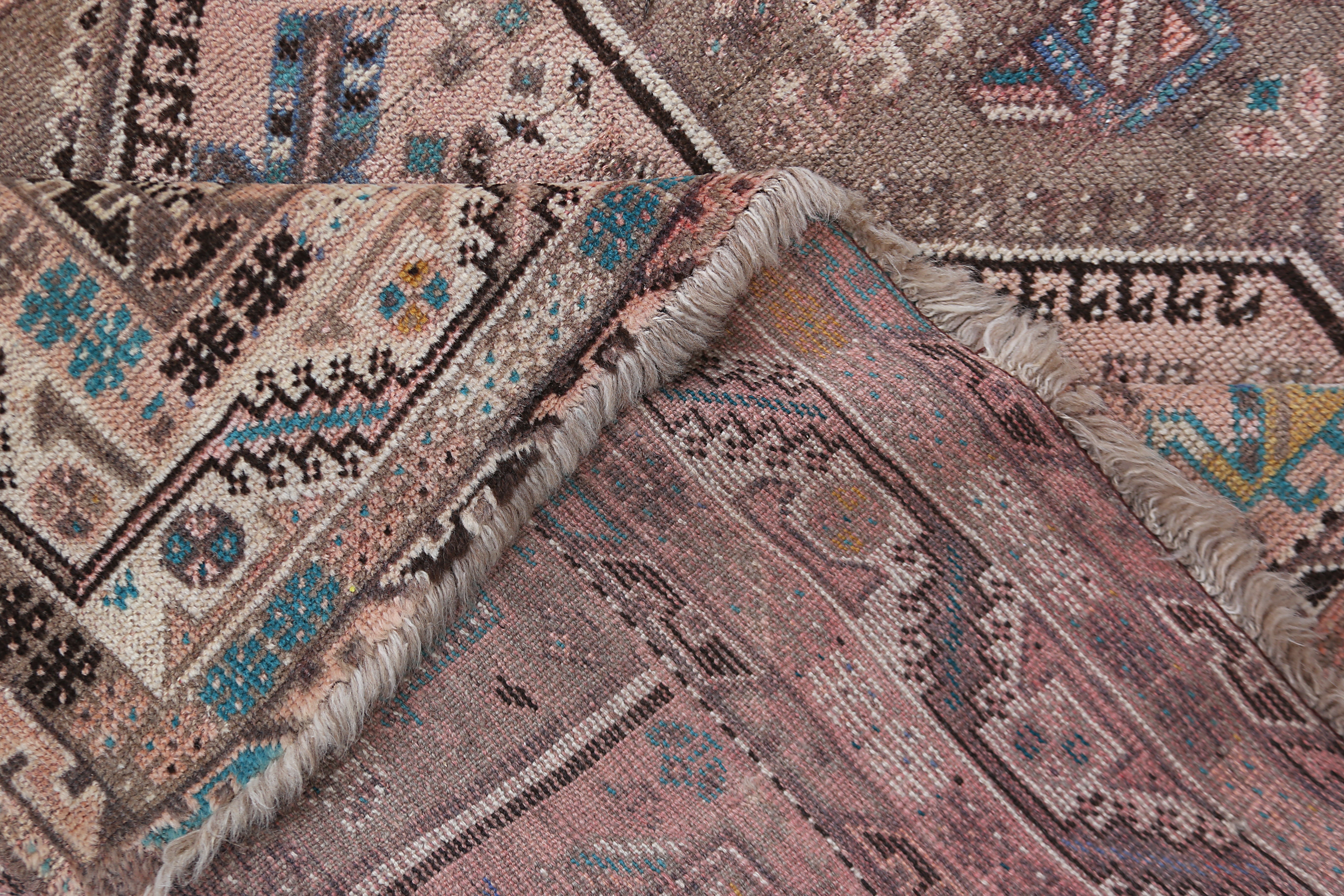 This vintage Shiraz rug is a vibrant example of Persian tribal artistry, featuring bold geometric patterns and an array of rich, earthy colours. Known for their intricate designs and cultural significance, Shiraz rugs often incorporate symbolic motifs that reflect the nomadic lifestyle of the Shiraz people. Hand-knotted using high-quality wool, this rug offers exceptional durability and a plush texture. The dynamic design and rich tones, including deep reds, blues, and golden yellows, create a visually captivating piece.