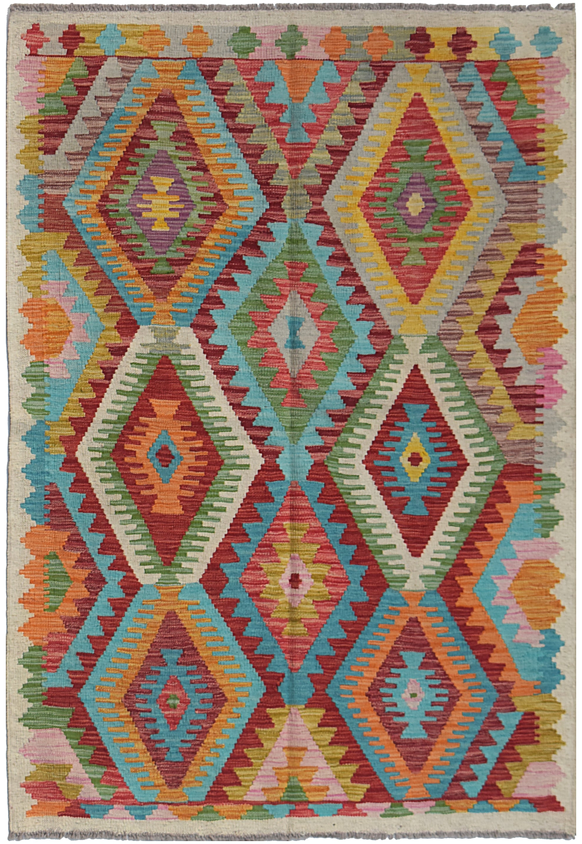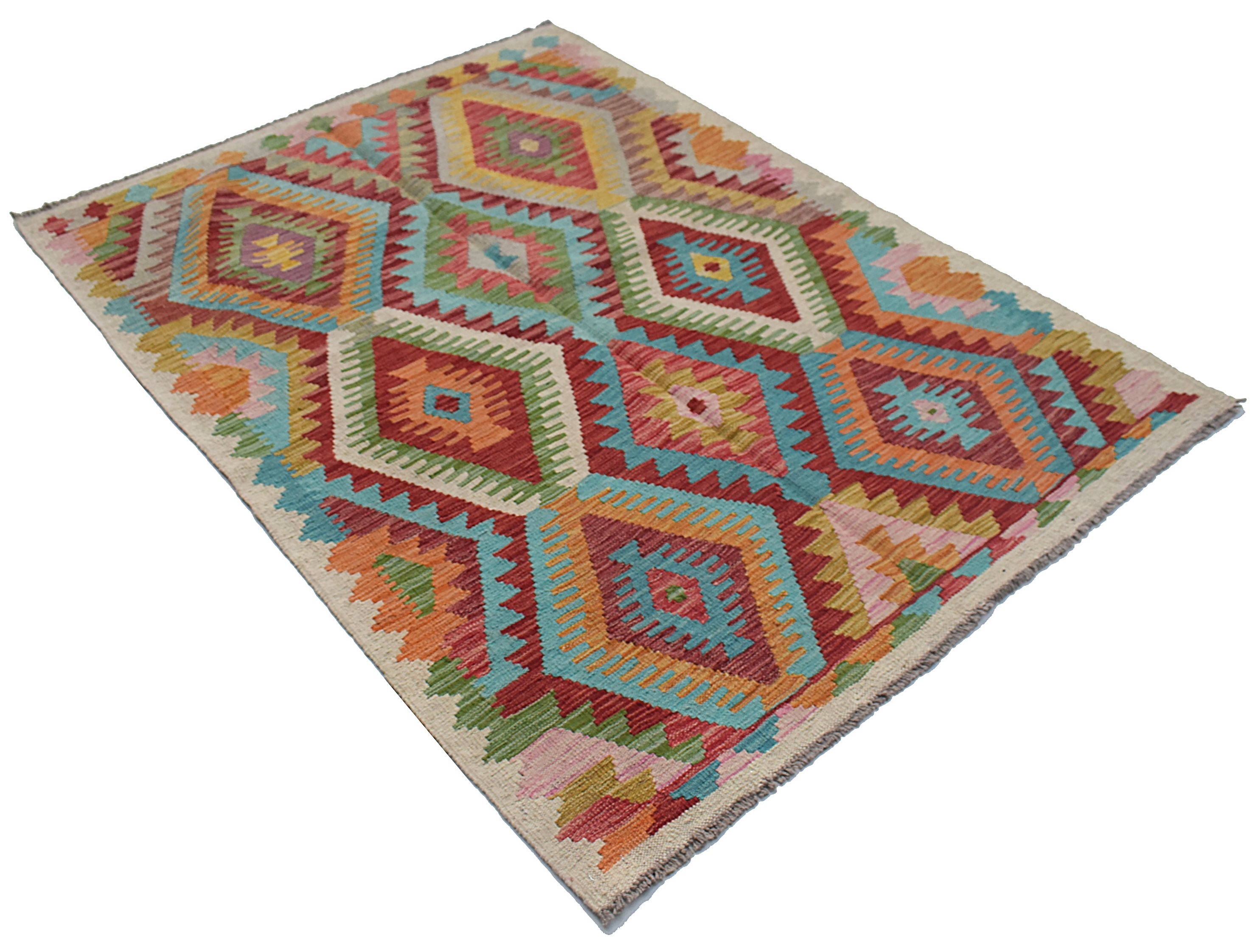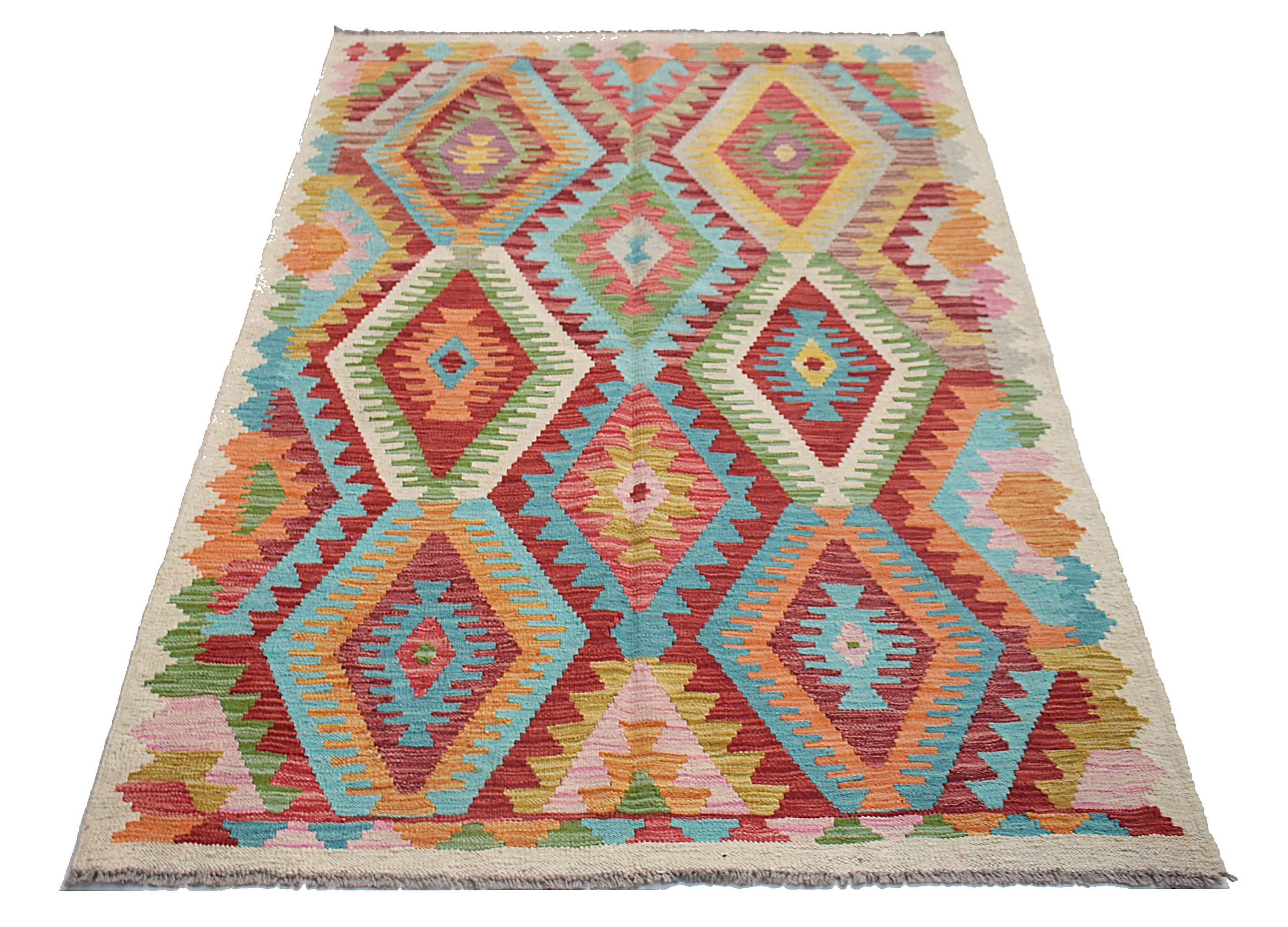 Maimana kilims are a proud product of the Frayab province in northern Afghanistan, with their name derived from the historic city of Maimana, a key trading hub along the ancient Silk Road. These kilims reflect centuries-old weaving traditions passed down through generations of tribal artisans. Their distinctive geometric patterns and bold designs are influenced by the nomadic lifestyle of the region, where practicality meets artistry in textile creation. The Maimana region is known for its semi-arid landscapes, where the weavers source high-quality wool from local sheep, spin it by hand, and dye it using natural substances, often inspired by the earthy hues of their surroundings. These kilims are flatwoven without a pile, a technique that makes them lightweight, reversible, and perfect for diverse applications, from floor coverings to wall hangings.