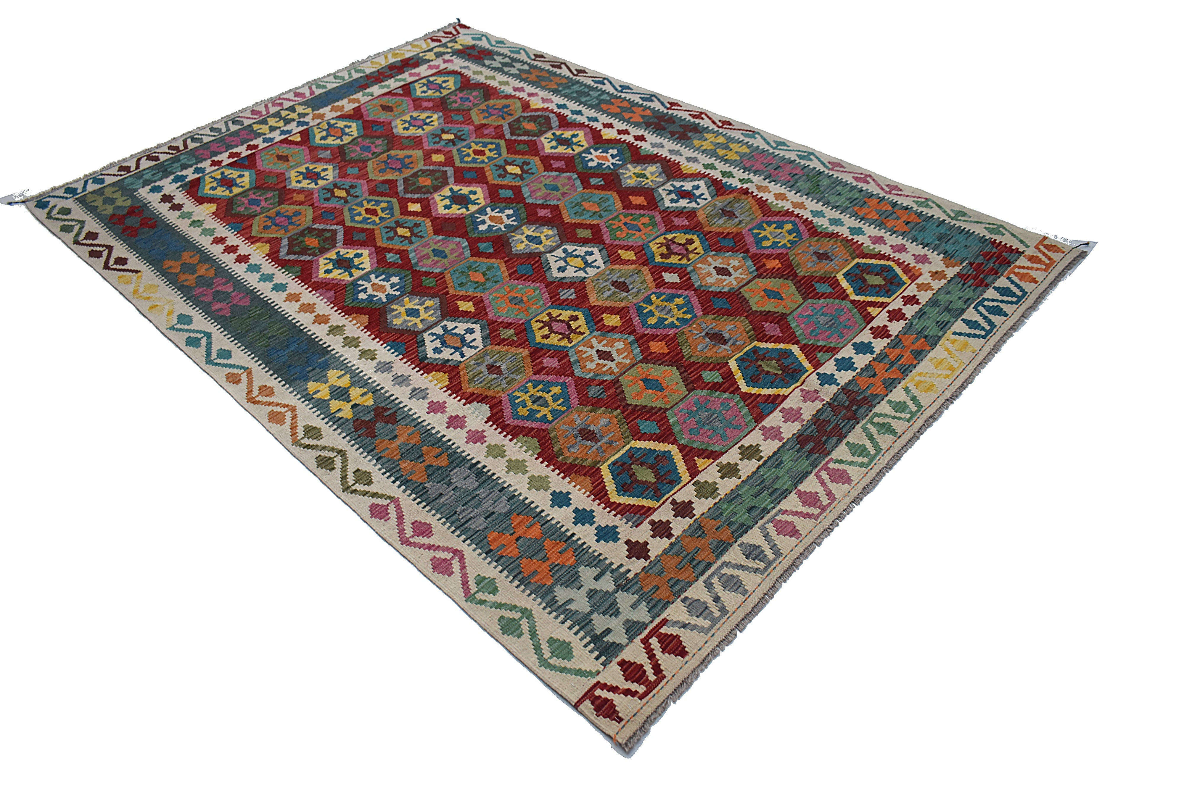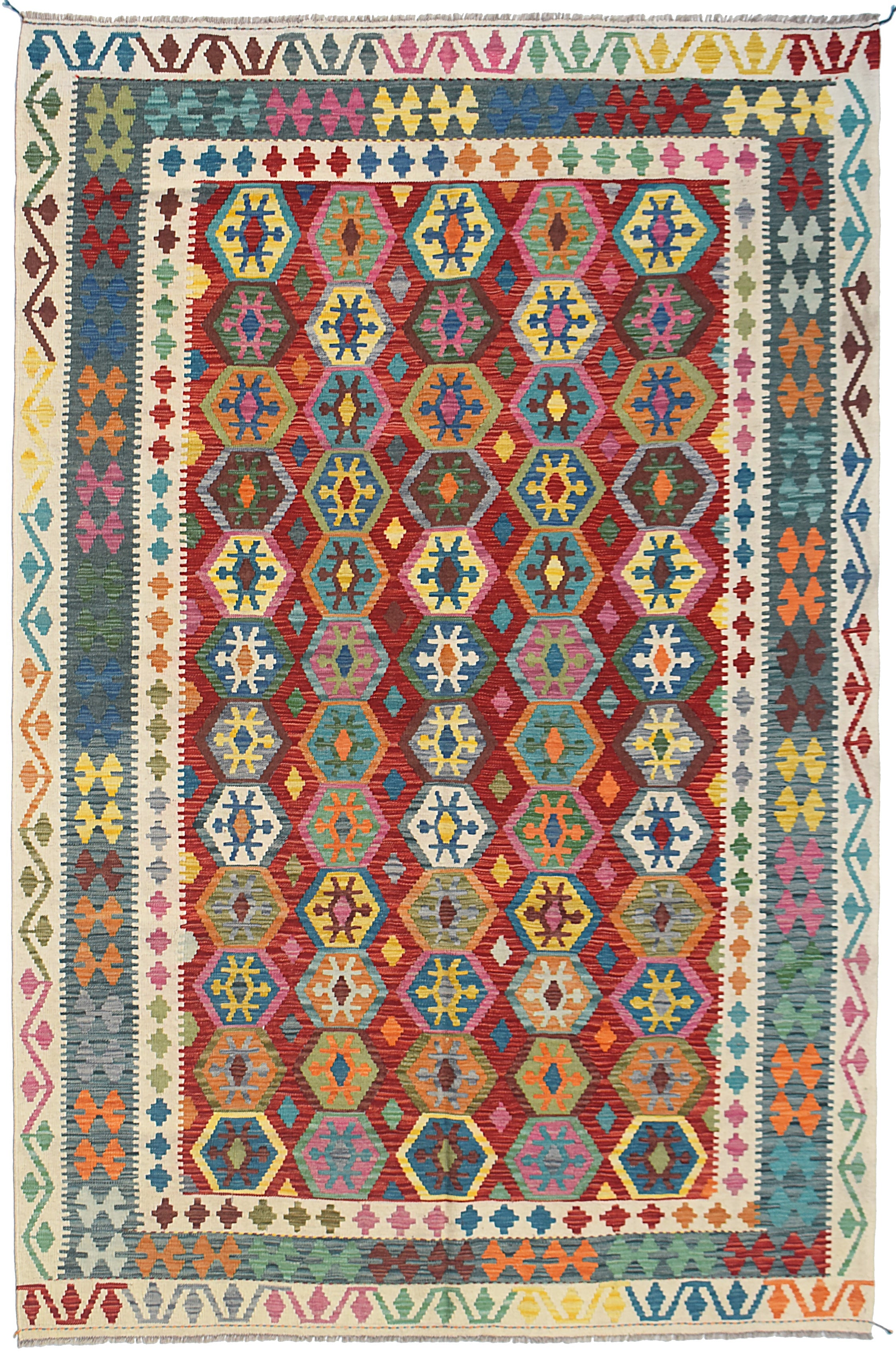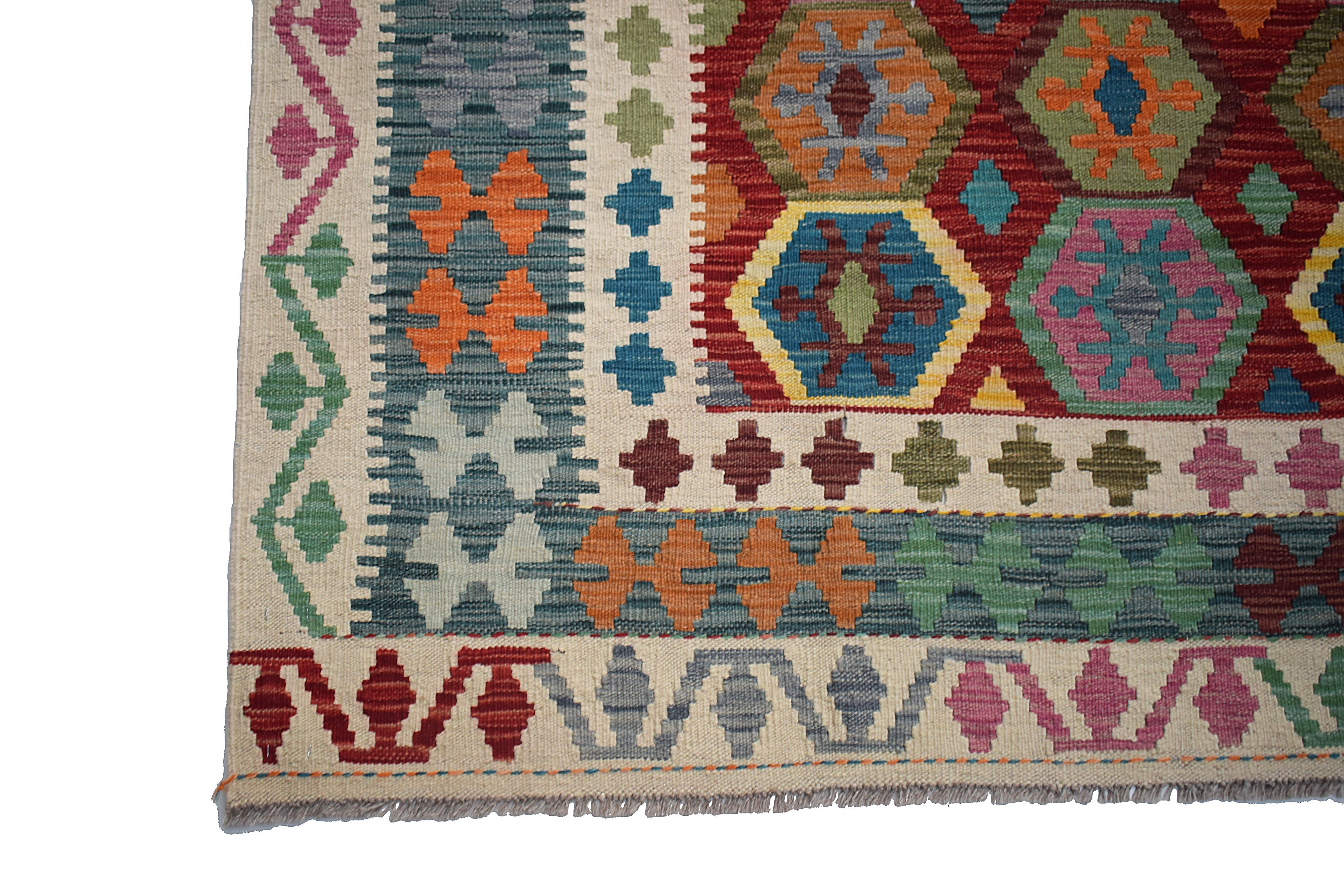 Maimana kilims are a proud product of the Frayab province in northern Afghanistan, with their name derived from the historic city of Maimana, a key trading hub along the ancient Silk Road. These kilims reflect centuries-old weaving traditions passed down through generations of tribal artisans. Their distinctive geometric patterns and bold designs are influenced by the nomadic lifestyle of the region, where practicality meets artistry in textile creation. The Maimana region is known for its semi-arid landscapes, where the weavers source high-quality wool from local sheep, spin it by hand, and dye it using natural substances, often inspired by the earthy hues of their surroundings. These kilims are flatwoven without a pile, a technique that makes them lightweight, reversible, and perfect for diverse applications, from floor coverings to wall hangings.