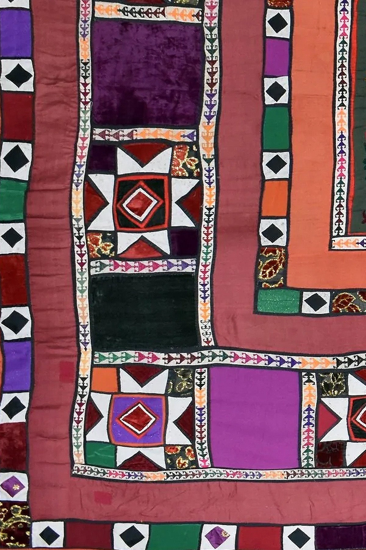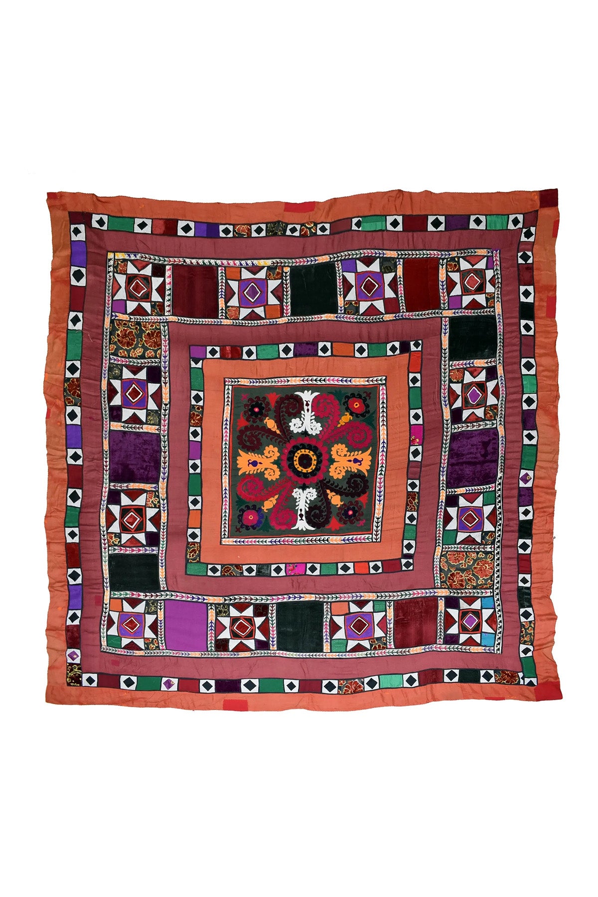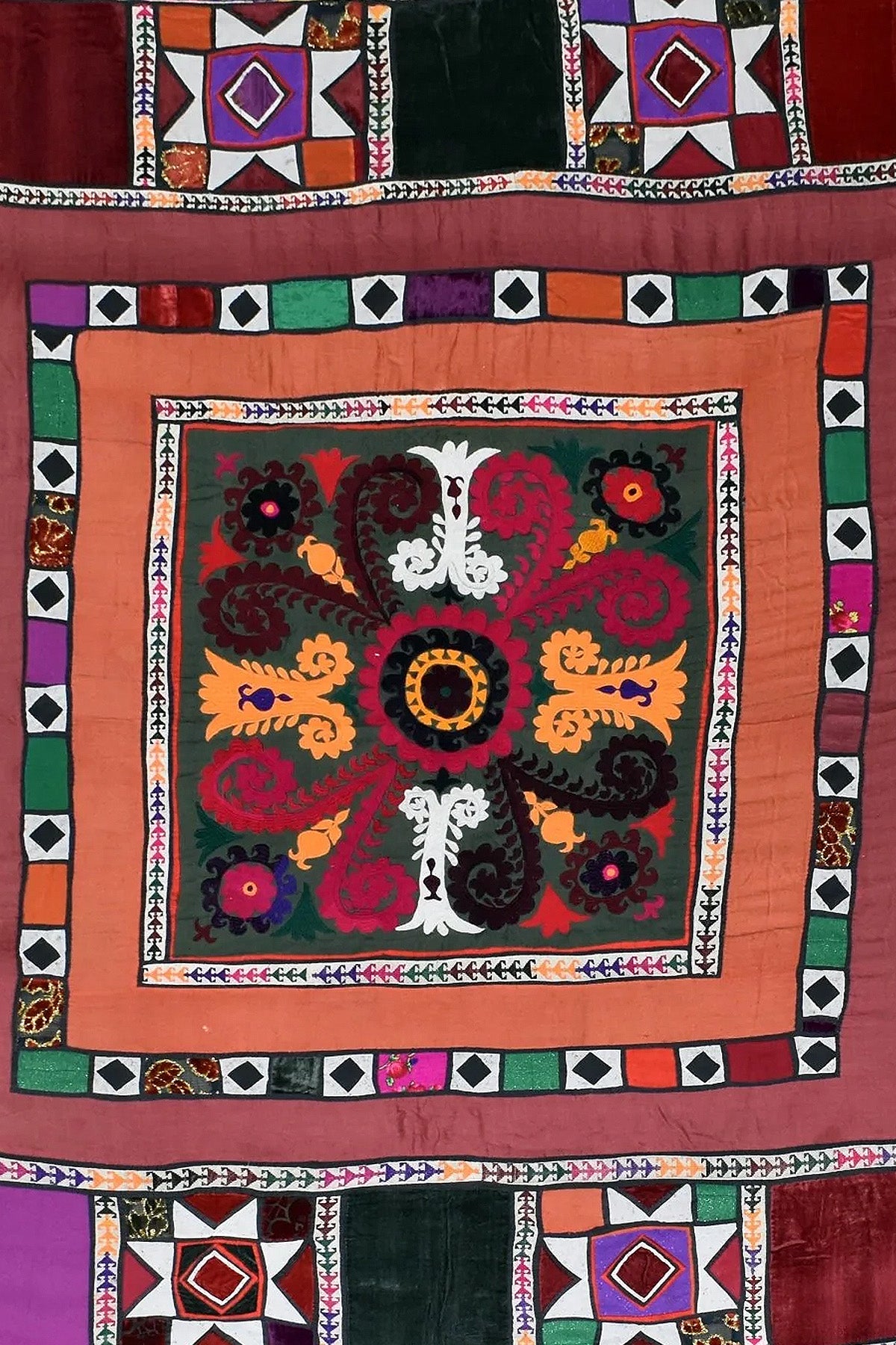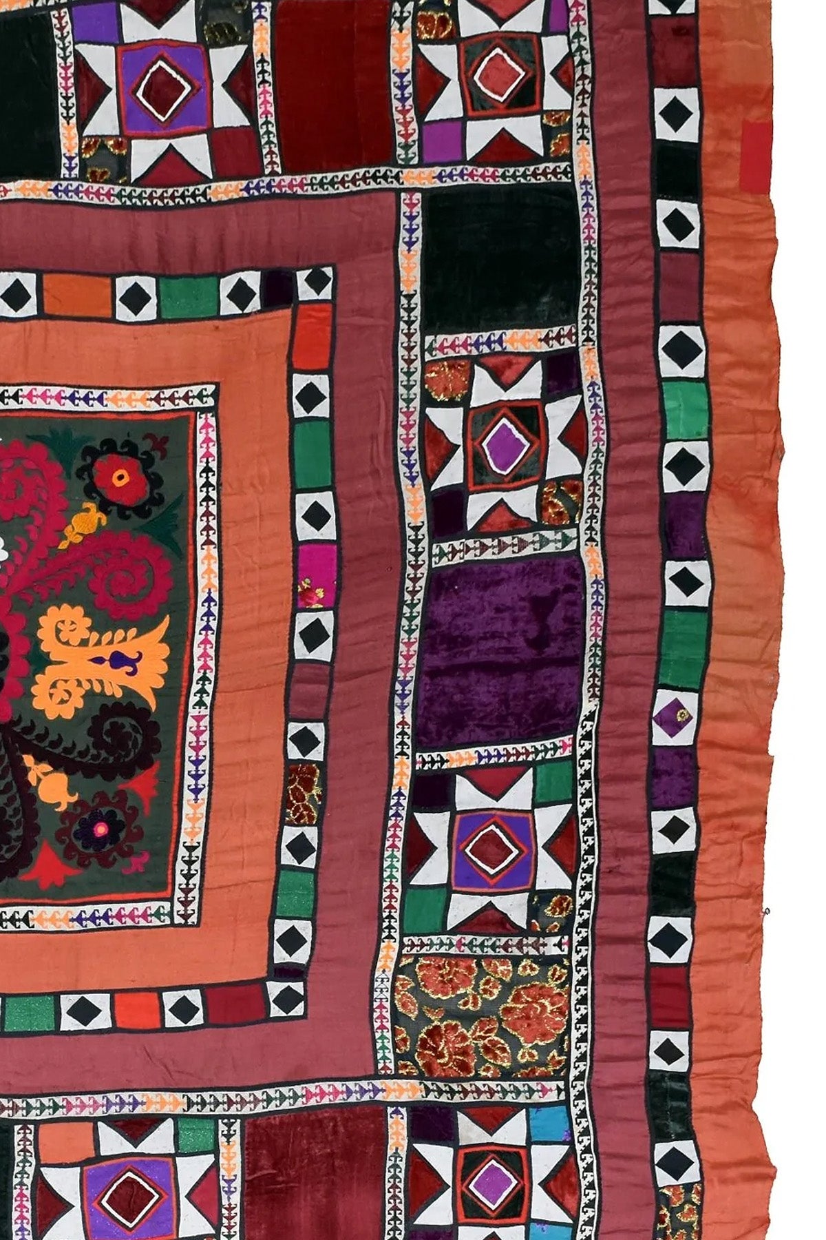 This piece is made in a patchwork format, with different panels joined together, each showing slight variations in colour, material and stitching. The central medallion is bold and floral, while the surrounding borders shift between geometric motifs and rich blocks of velvet and cotton.